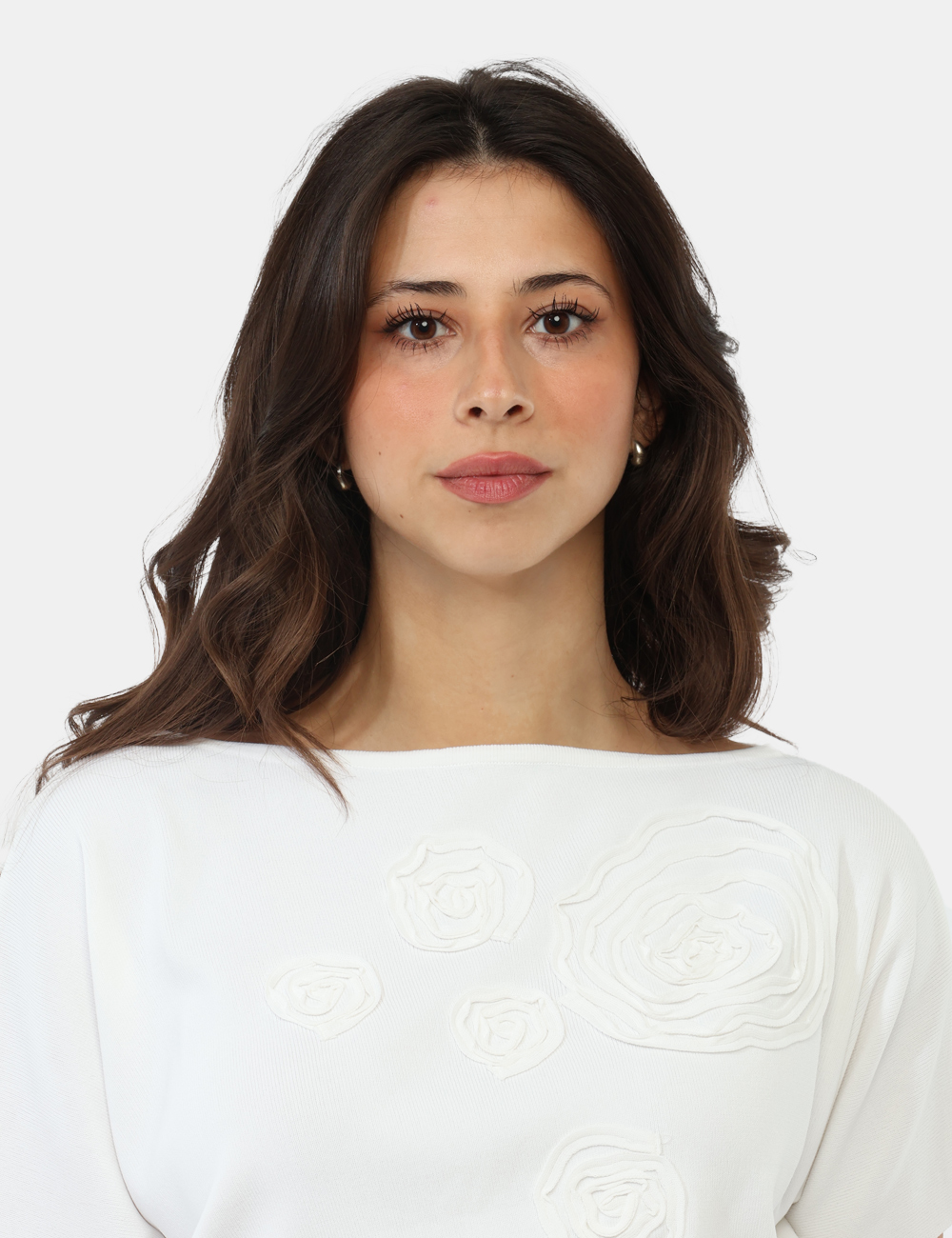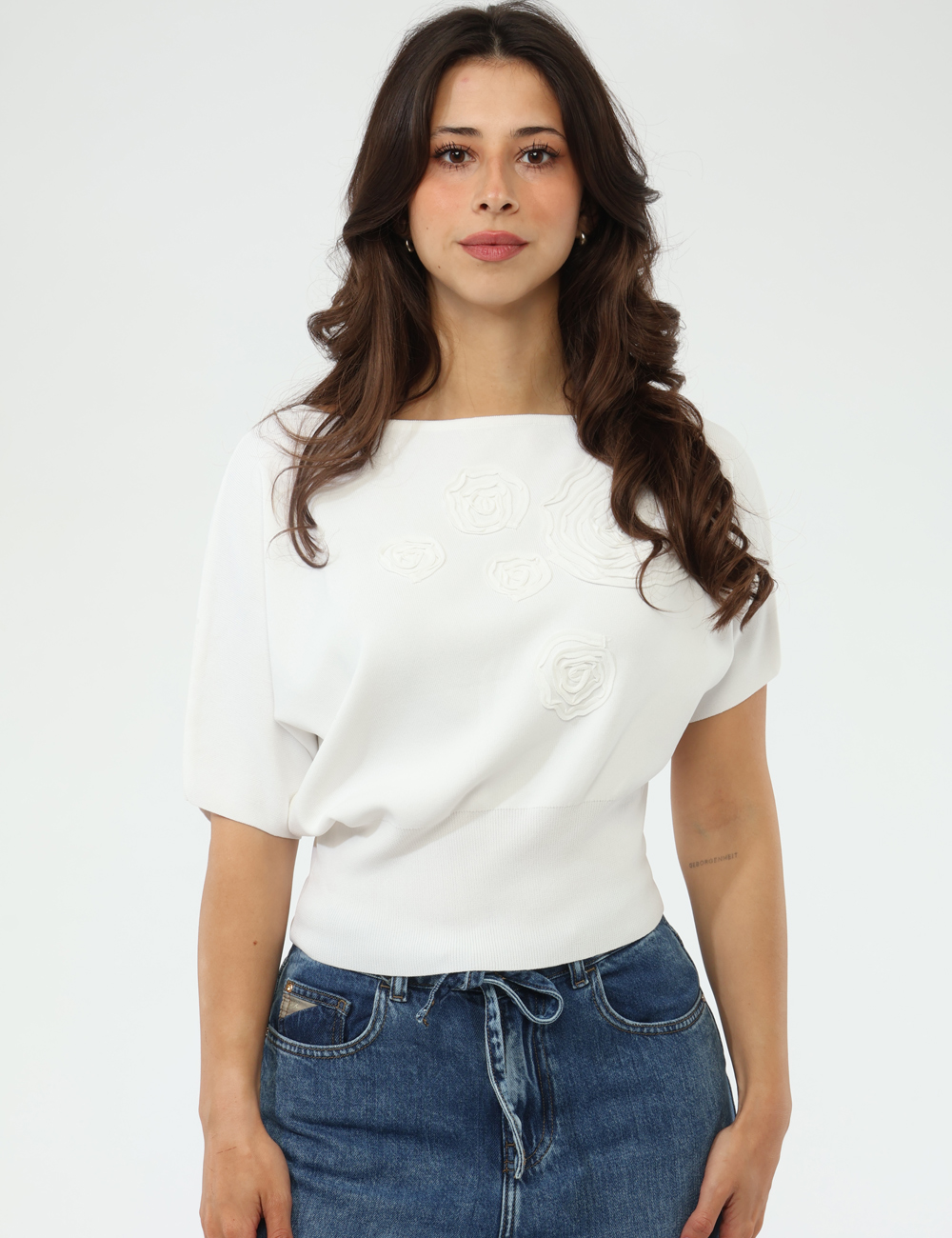 Perfetta sia di giorno che di sera, puoi indossarla per un look casual curato oppure per occasioni più ricercate. Abbinala a un jeans per uno stile semplice ma d’impatto, oppure scegli un pantalone elegante per un outfit più sofisticato. La maglia con disegni rose in rilievo, manica corta, elasticizzata in vita è pensata per chi desidera un capo versatile ma distintivo.