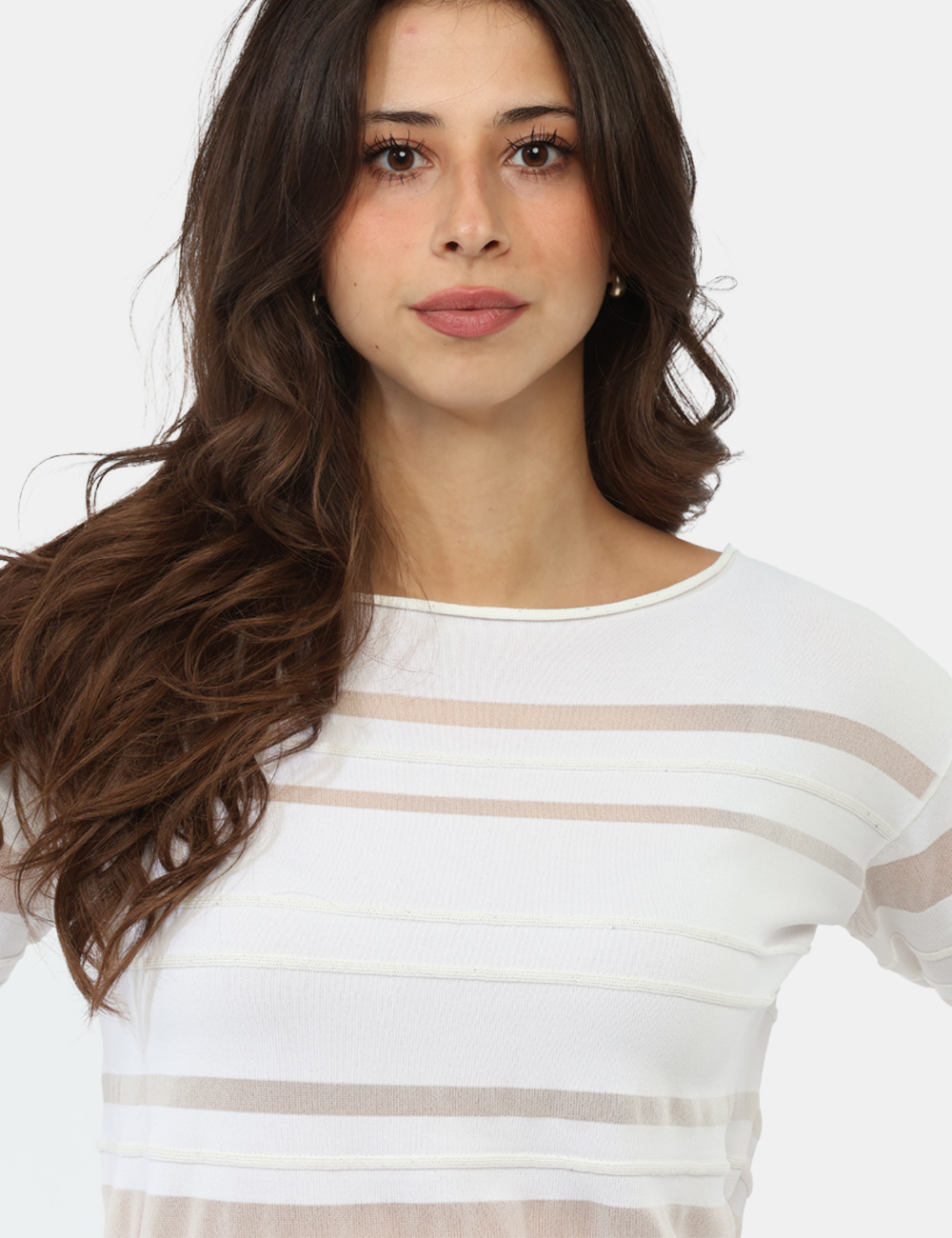 Questa maglia da donna adatta alla primavera estate si distingue per il suo design ricercato: le righe orizzontali con trasparenze e delicati brillantini creano un effetto luminoso e sofisticato, capace di esaltare il tuo stile con discrezione. Il taglio regolare garantisce comfort e una linea armoniosa, adattandosi facilmente alla silhouette. La modella è alta 165 cm e indossa la taglia S.