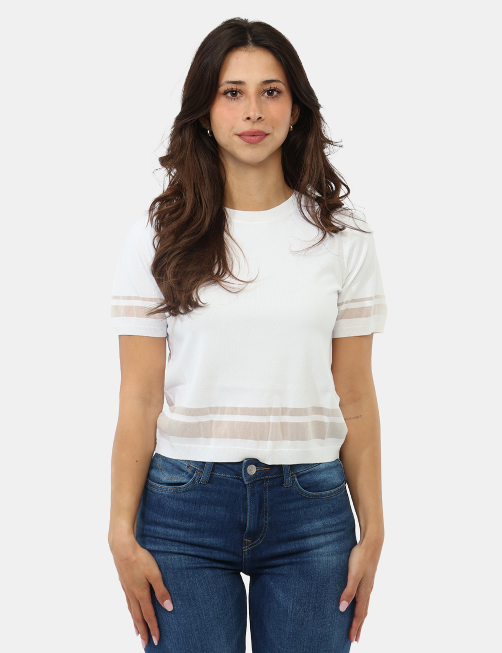 Questa maglia da donna adatta alla primavera estate si distingue per il suo design essenziale ma ricercato: le maniche corte e le righe orizzontali con trasparenze creano un effetto delicato e sofisticato, donando profondità e movimento al capo senza risultare eccessivo. Il taglio regolare valorizza la silhouette con naturalezza. La modella è alta 172 cm e indossa la taglia S.