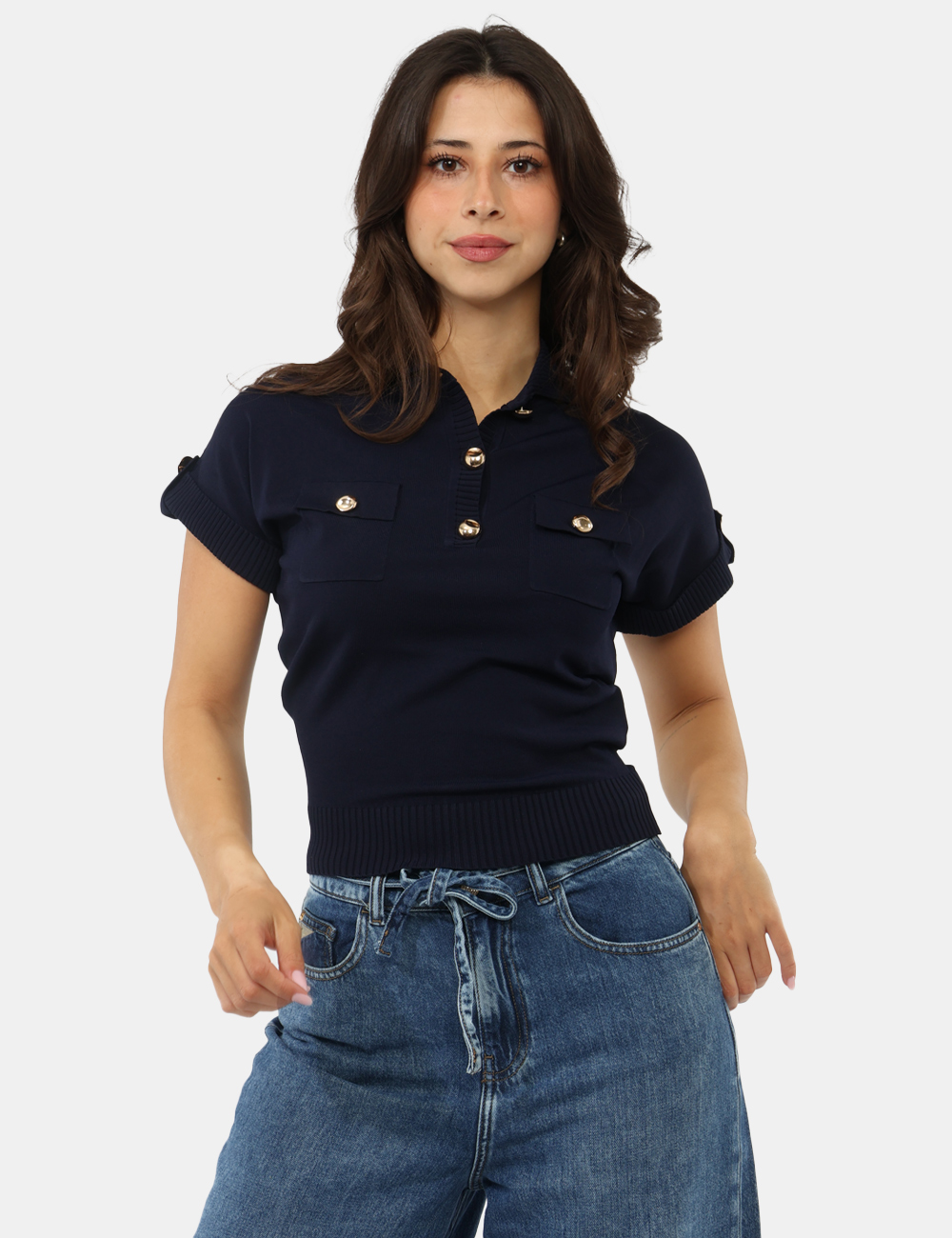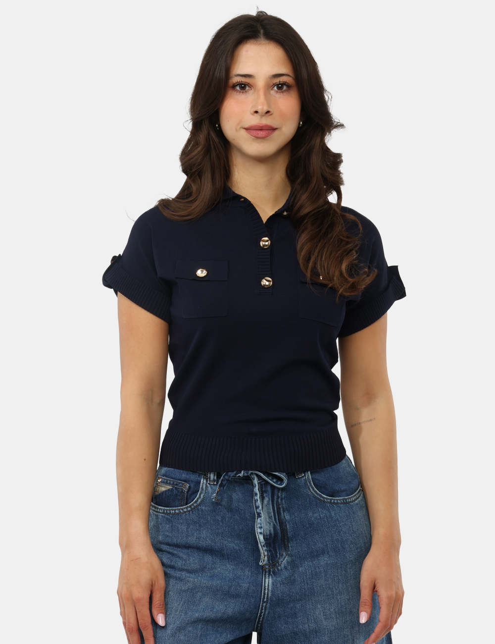 Il colore blu, elegante e intramontabile, rende questa maglia con collo a polo e bottoni dorati un capo versatile, facile da inserire in ogni guardaroba.