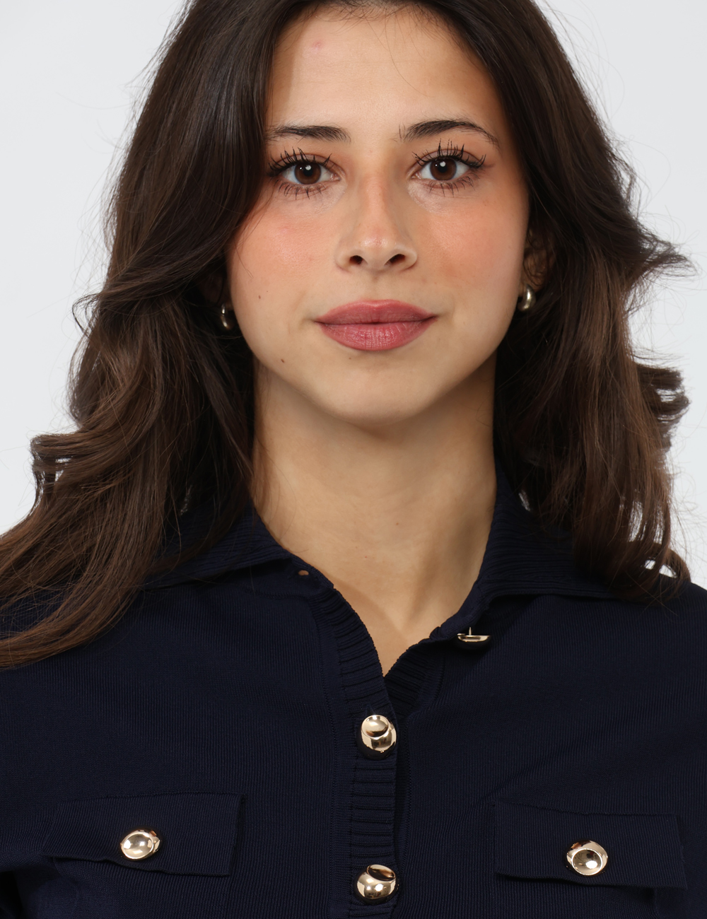 Il design è valorizzato dal collo a polo con eleganti bottoni dorati, dettagli luminosi che aggiungono un tocco sofisticato e rendono il capo perfetto anche per occasioni più ricercate.