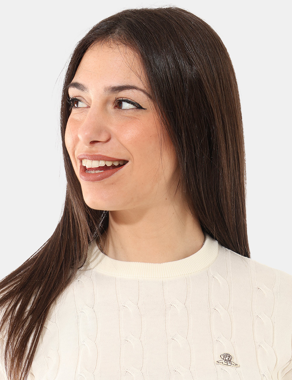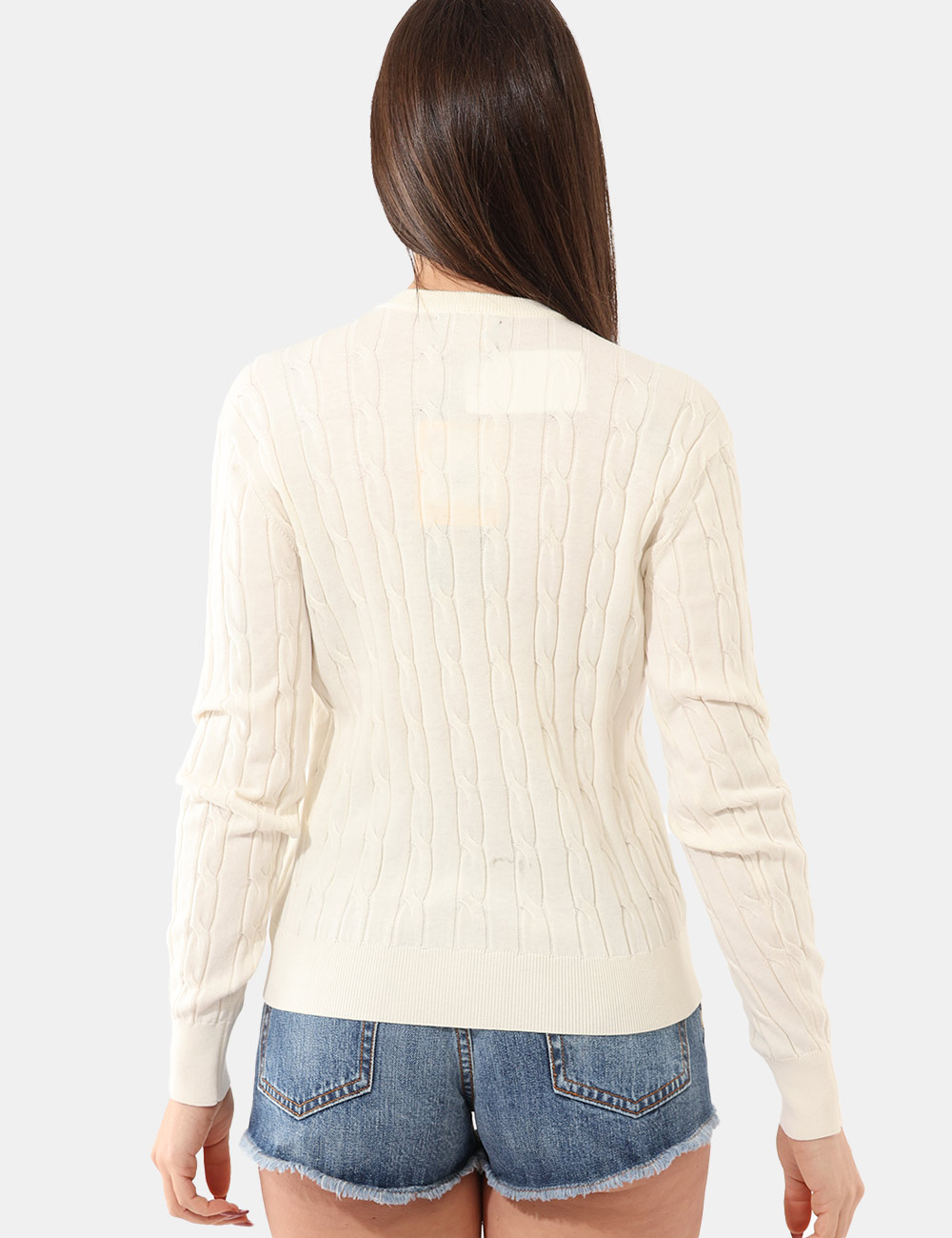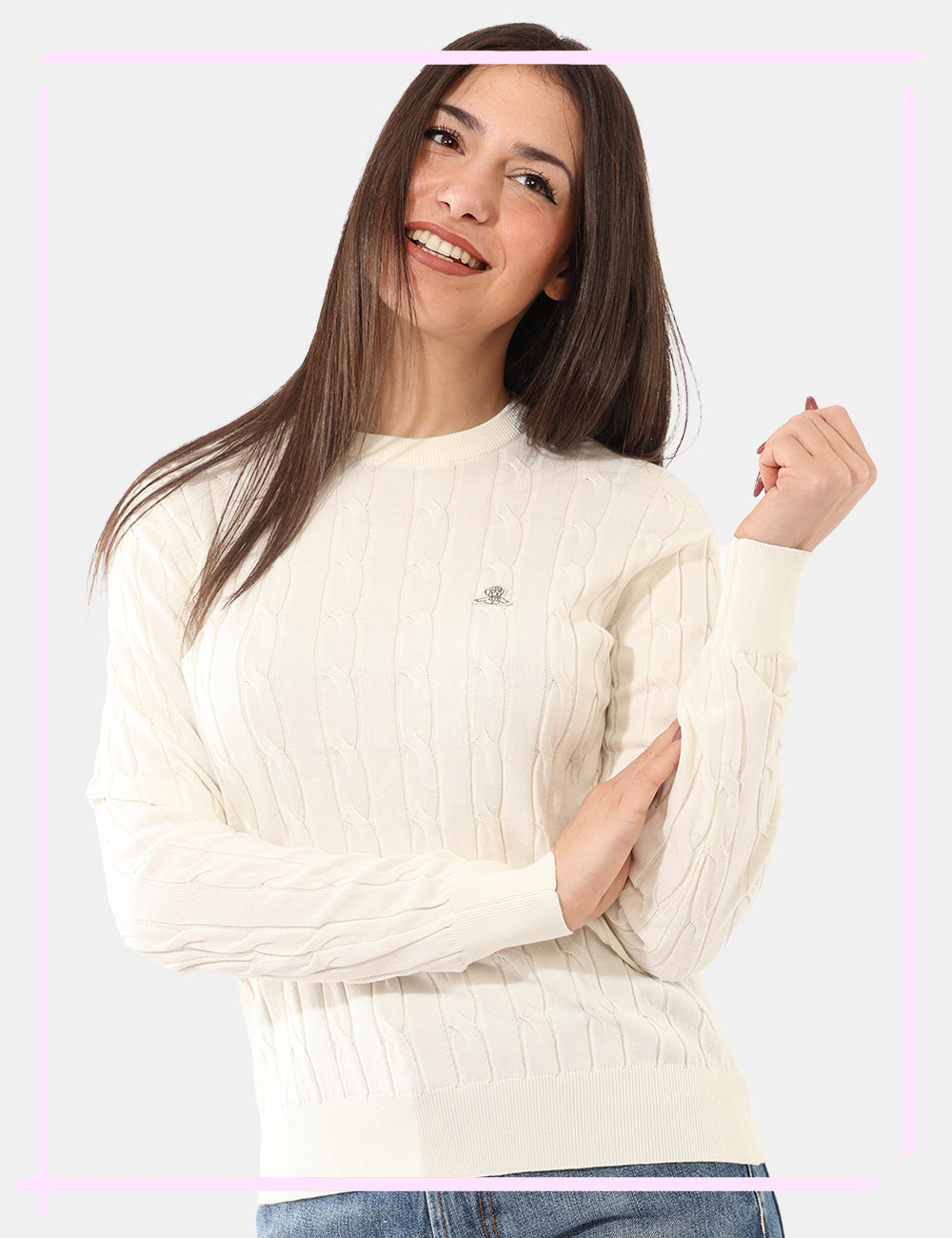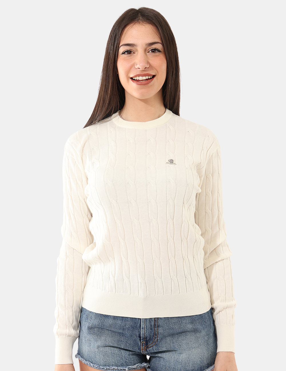 Questa maglia in Total panna, trama intrecciata, girocollo classico e patch logo brand offre una vestibilità regolare, pensata per valorizzare la silhouette senza costringere. La modella è alta 165 cm e indossa la taglia S, un riferimento utile per orientarti nella scelta della misura. Si tratta di un pezzo unico di campionario, selezionato per chi ama capi autentici e non omologati.