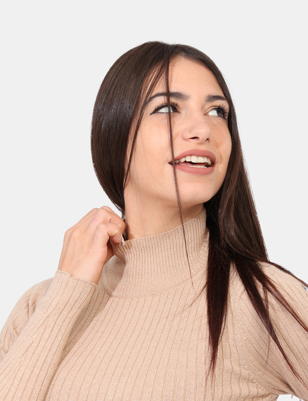 Maglia a collo alto, a maniche lunghe in total oro con filo lurex dorato. La vestibilità è morbida e regolare. La maglia è adatta per occasioni casual/raffinate ideale con un blazer. Dona un tocco di luce ai tuoi outfit.
