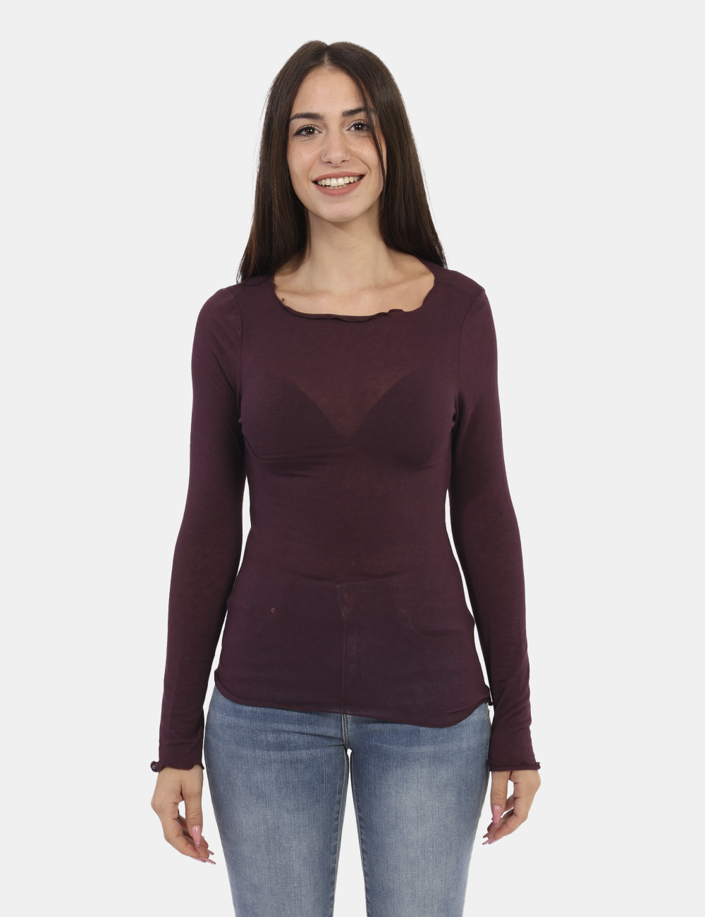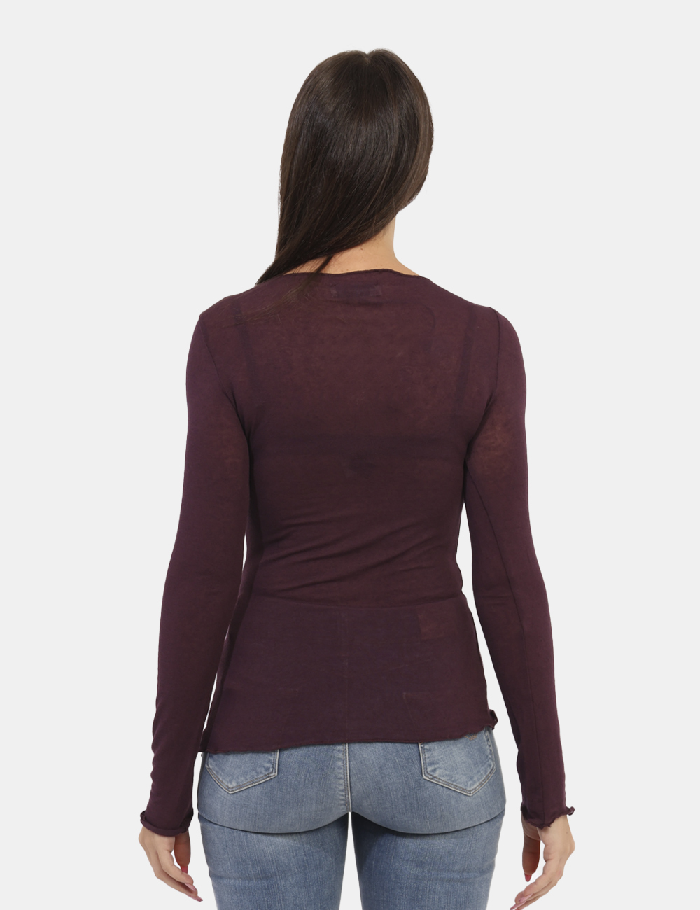 Basica maglia a maniche lunghe con scollo a barchetta in total prugna e con bordatura lavorata. La vestibilità è morbida e regolare. Il capo è adatto per occasioni casual. Troppo comodo per poterne fare a meno.