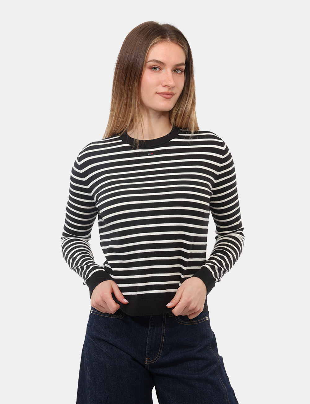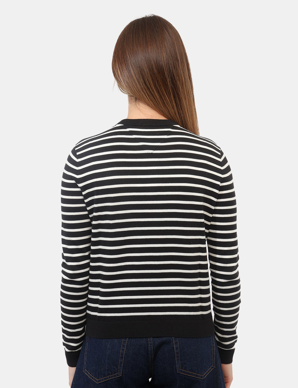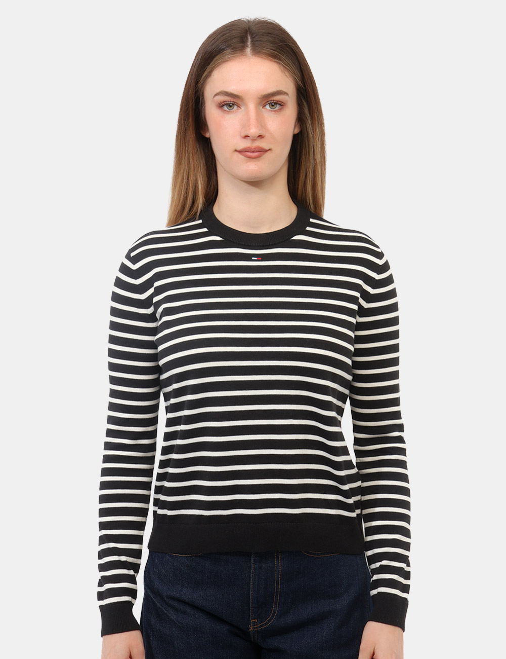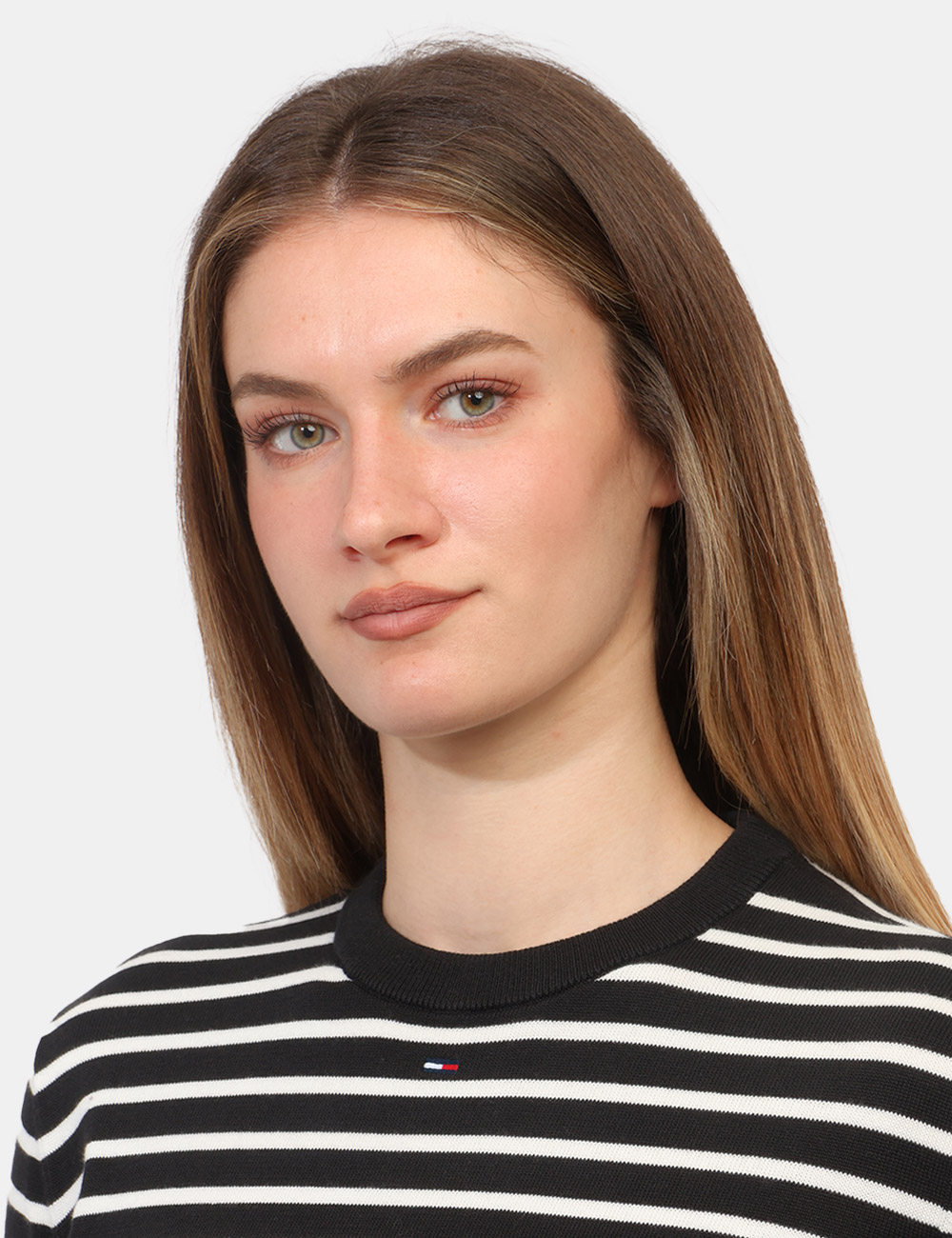La Maglia con righe bianco e nere firmata TOMMY HILFIGER unisce comfort, qualità e design iconico, diventando un alleato perfetto per il tuo guardaroba quotidiano.