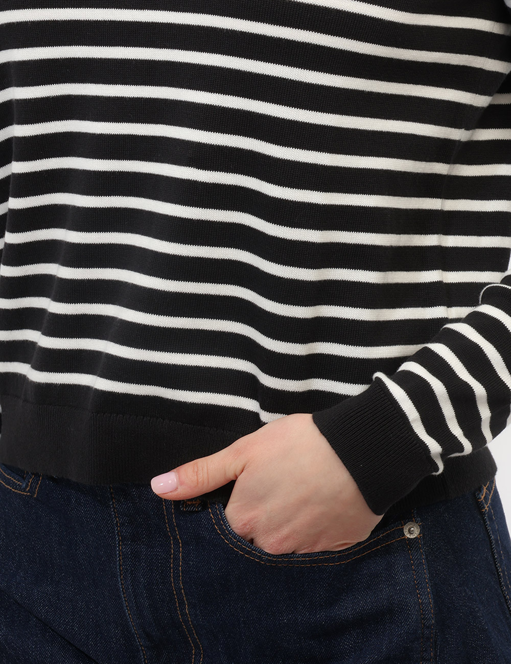 Questa maglia da donna adatta alla stagione primavera estate si distingue per il suo design essenziale ma sempre attuale, valorizzato dalle righe bianco e nere che donano un tocco grafico e moderno. Il contrasto cromatico rende il capo facilmente abbinabile, perfetto per creare outfit casual ma curati.