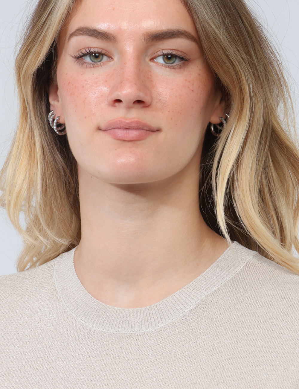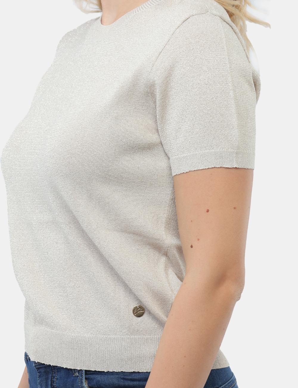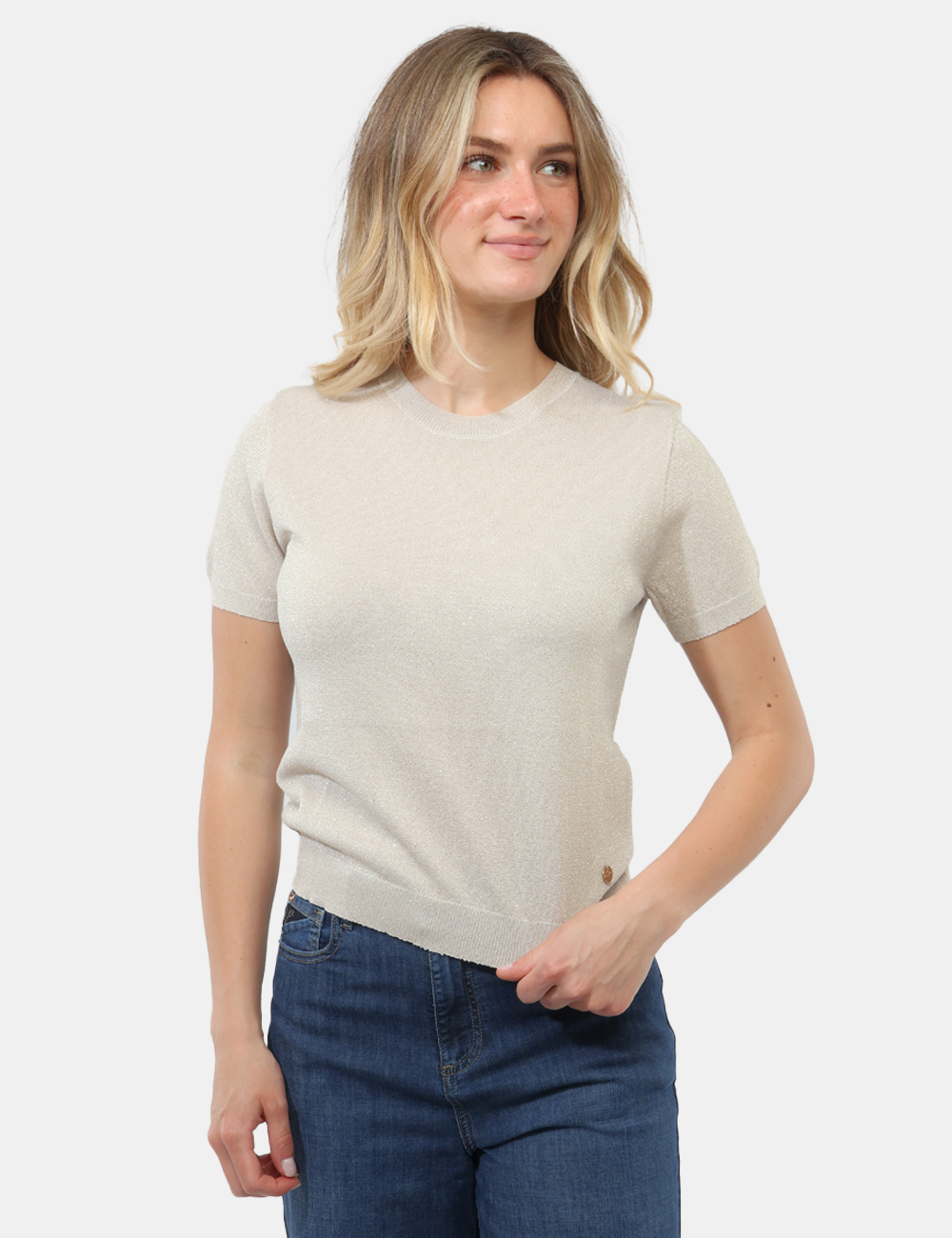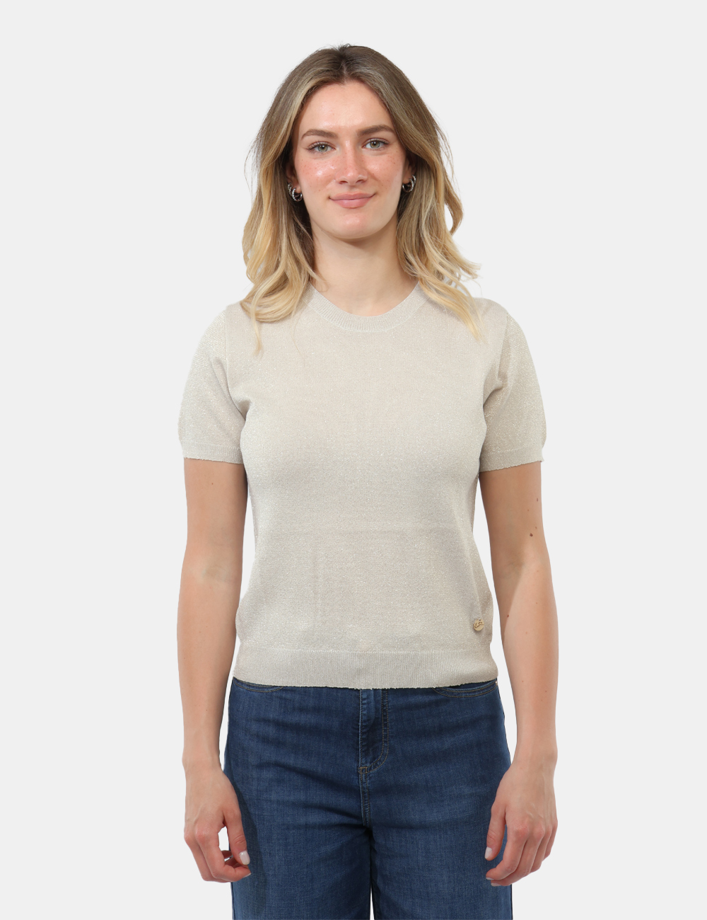 Il design si distingue per il girocollo e il filo lurex, dettagli che donano un tocco femminile e ricercato senza risultare eccessivi. La vestibilità è regolare: la modella è alta 165 cm e indossa la taglia S, garantendo un fit comodo e armonioso, perfetto per valorizzare la silhouette con naturalezza.