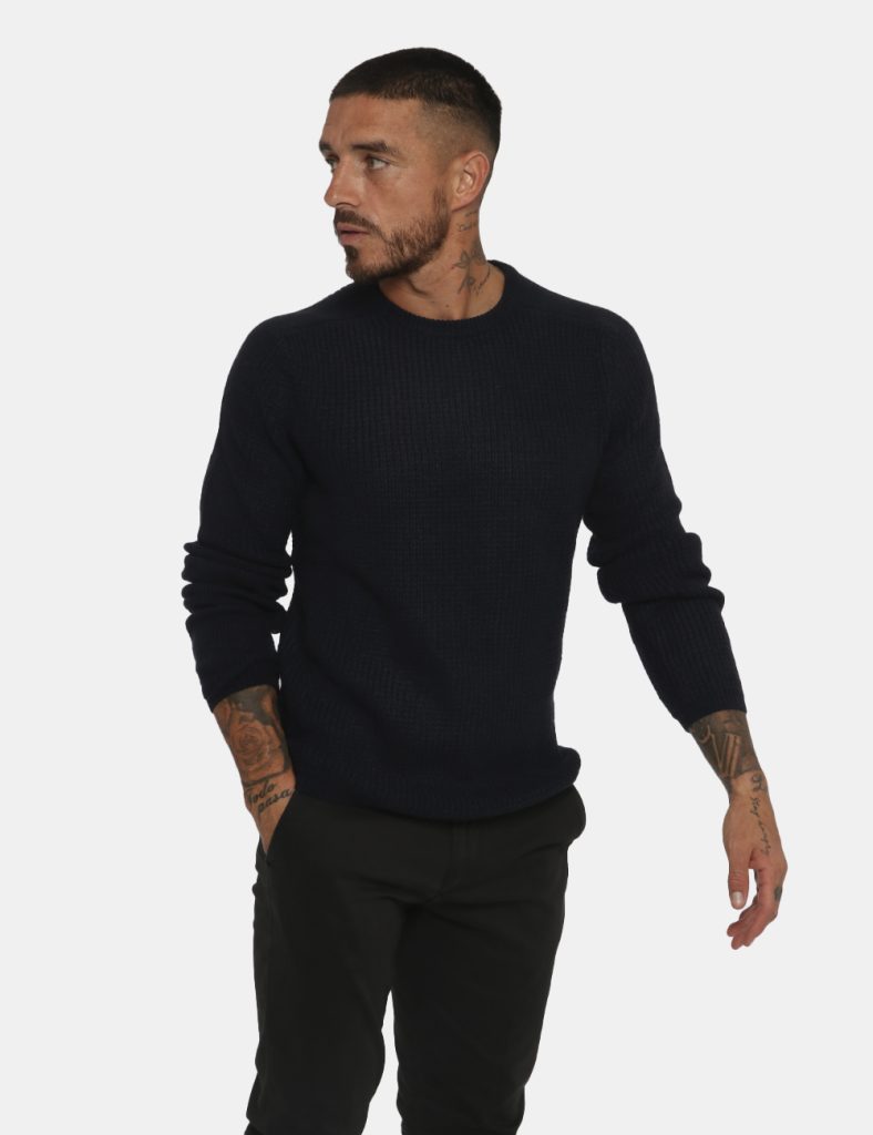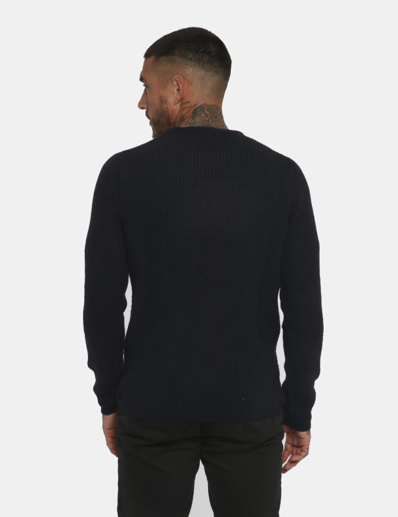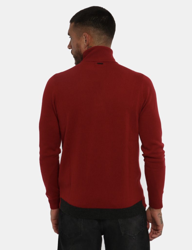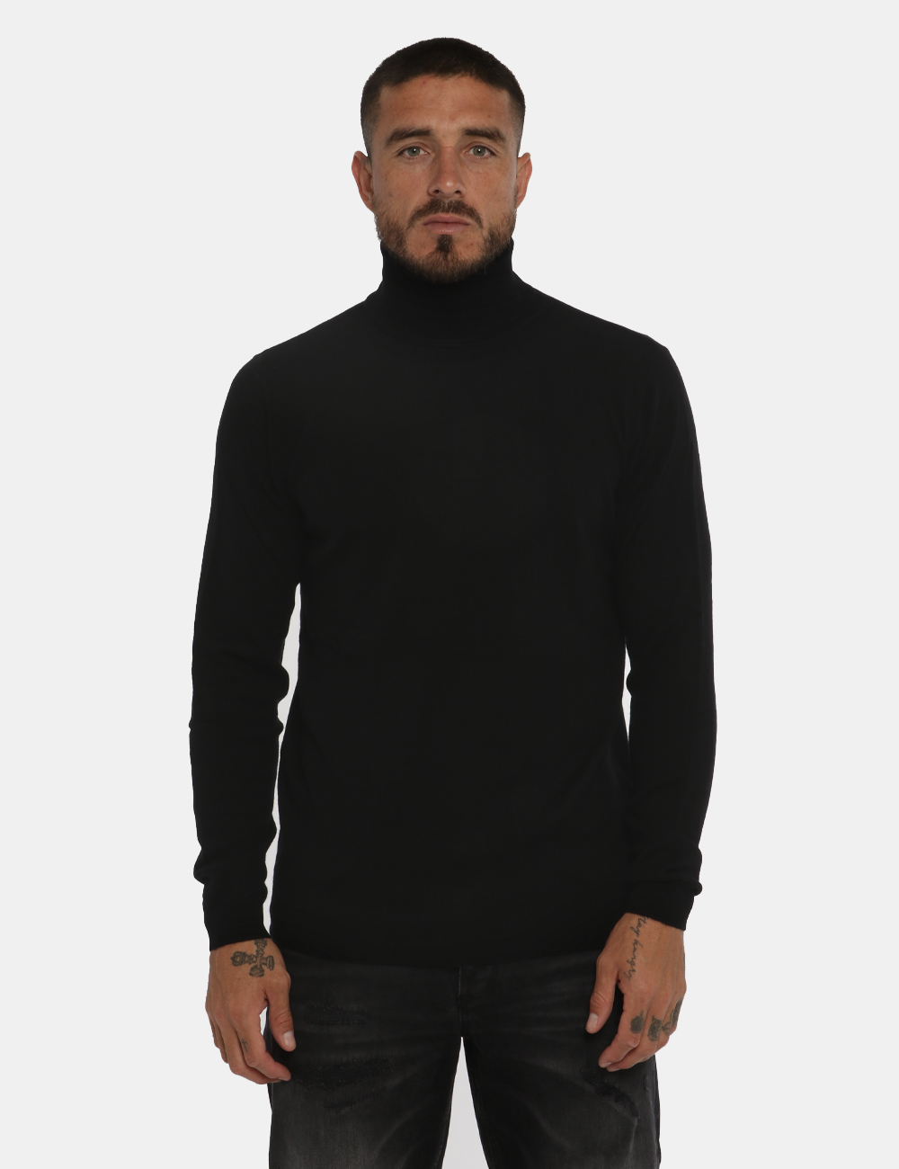 Maglione con collo alto sfondo nero e dettagli blu sul fondo. La vestibilità è morbida e regolare. Indossalo con un pantalone elegante o con un jeans e vedrai il cambio volto del capo. Inseriscilo nel carrello per avere un evergreen.