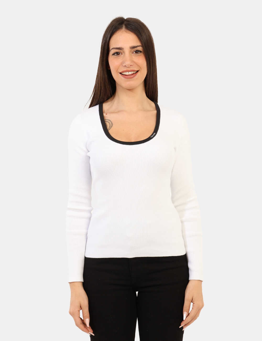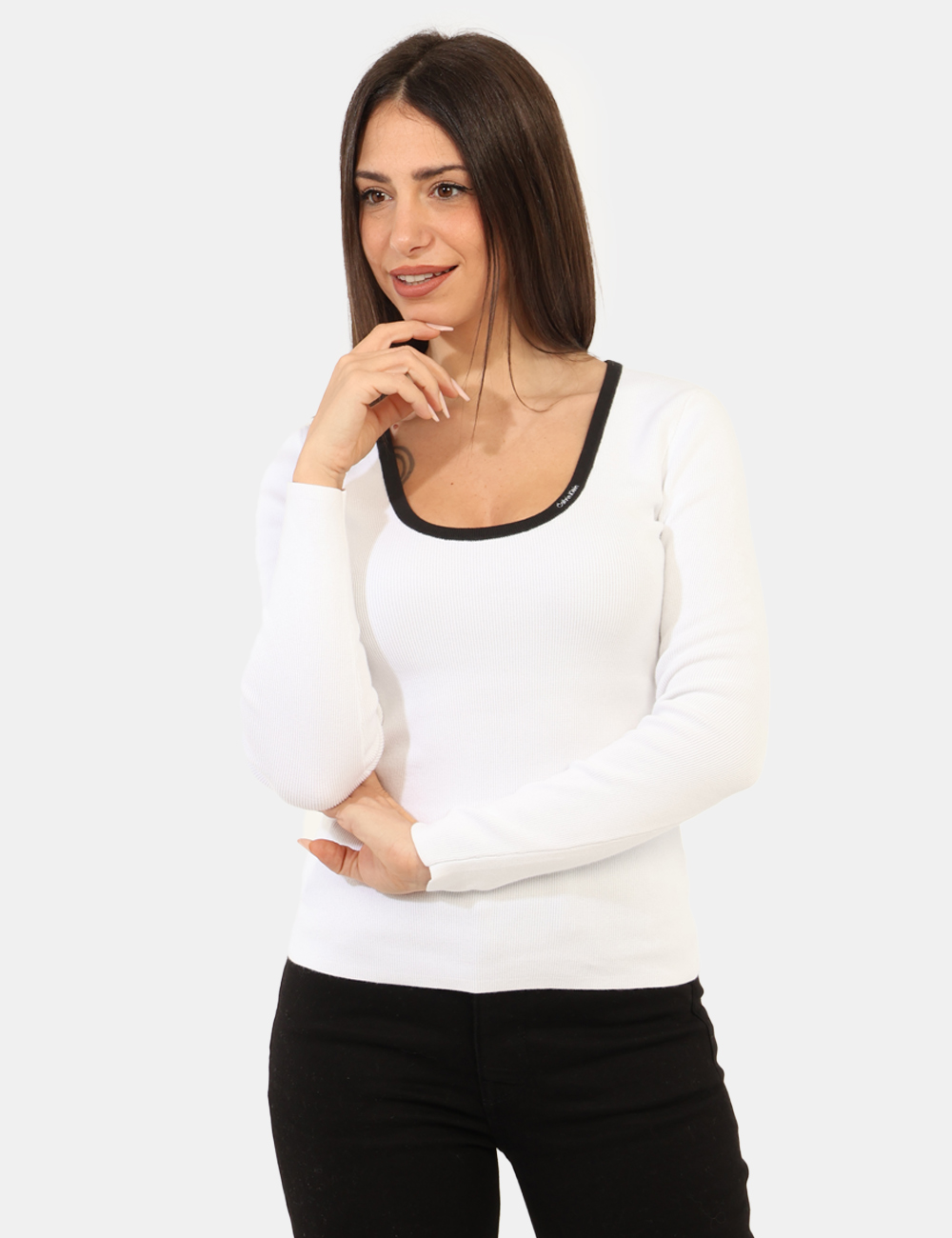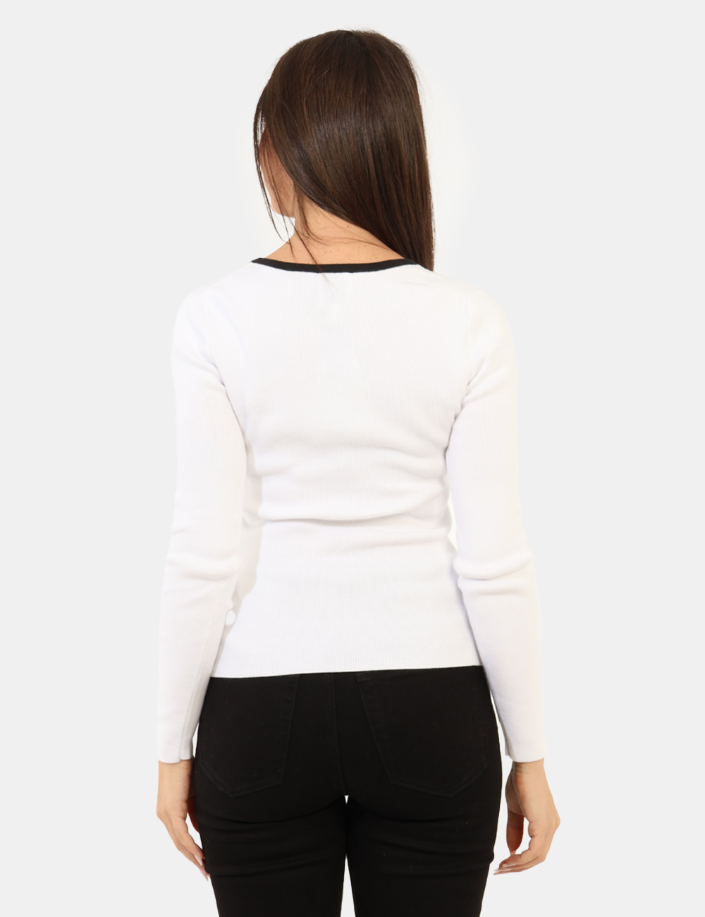 Maglioncino in total bianco con scollo a V evidenziato con bordino nero. La vestibilità è morbida e regolare. Il maglione è adatto per occasioni casual e facilmente combinabile. Praticità e stile in un solo capo.