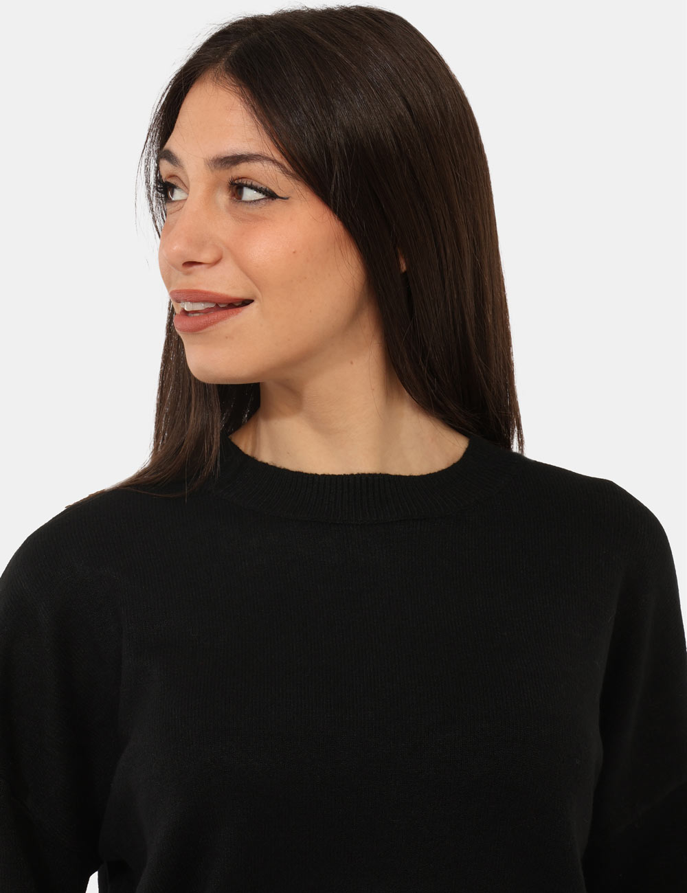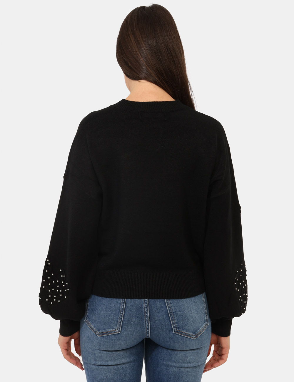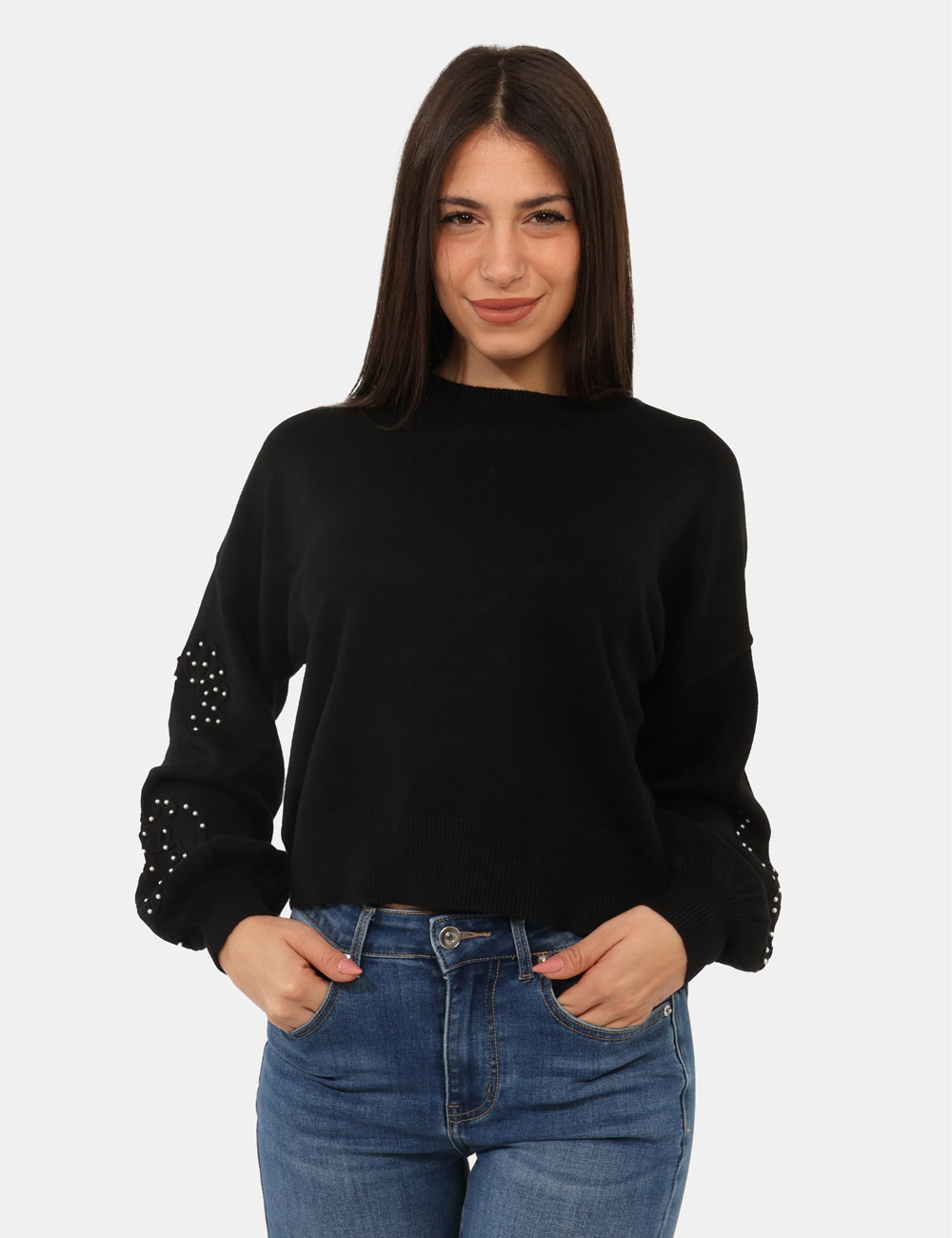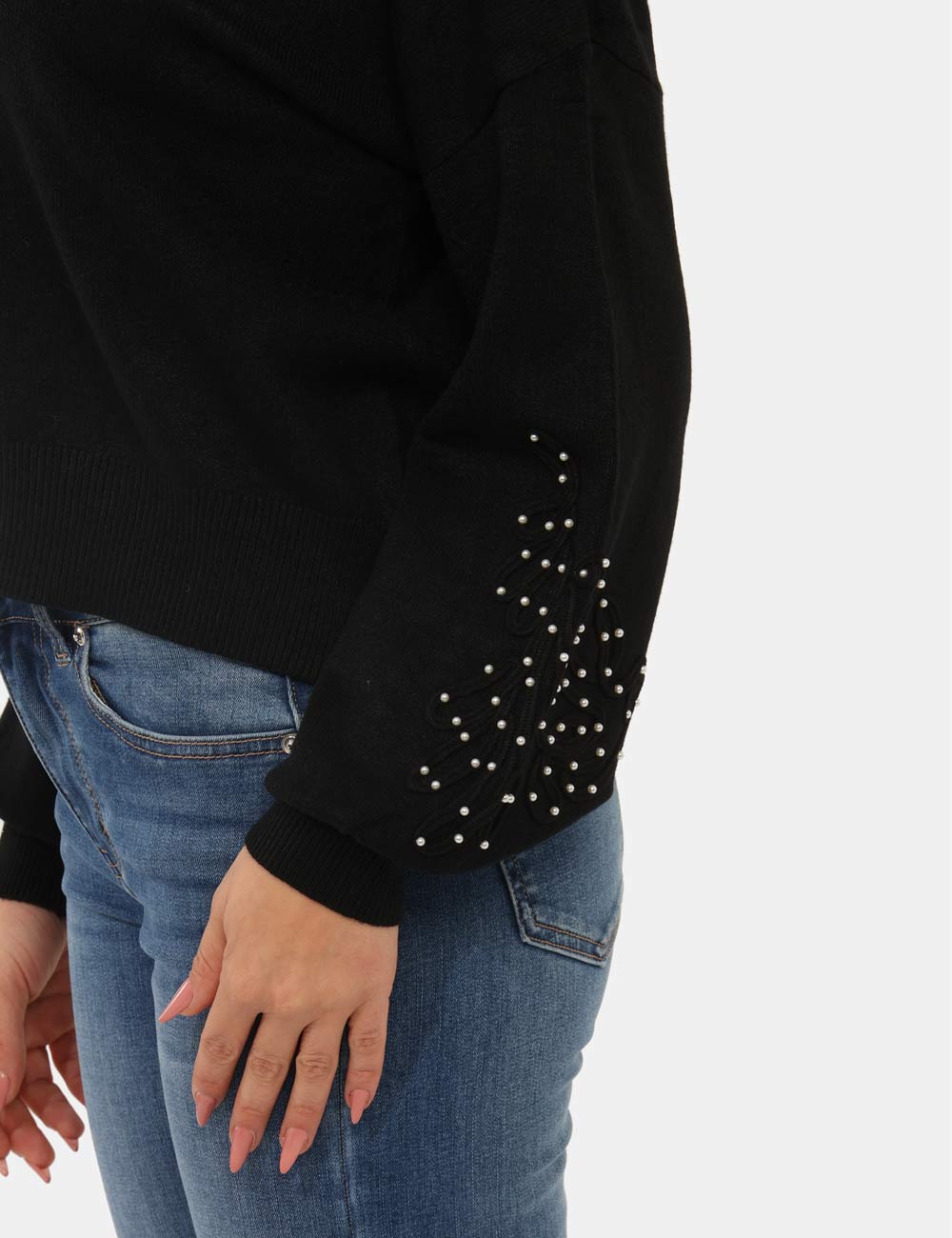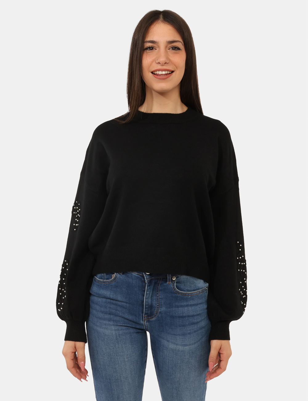 Maglione con girocollo classico in total nero, con trama lavorata sulla maniche arricchita da perline argentate. La vestibilità è morbida e regolare. Il maglione è adatto per occasioni casual e facilmente combinabile. Dona un tocco di stile ai tuoi outfit.