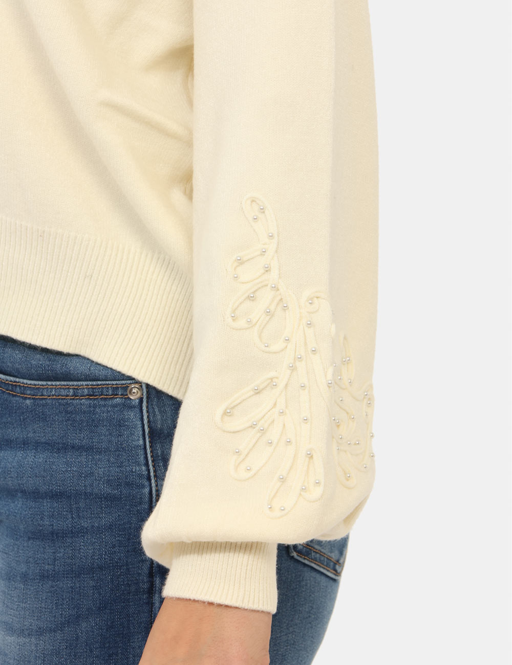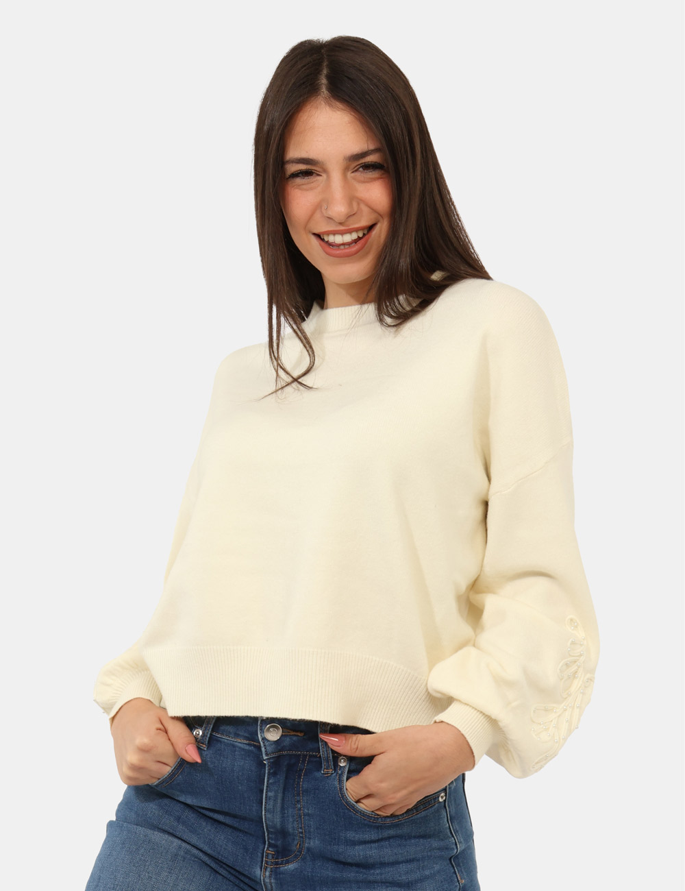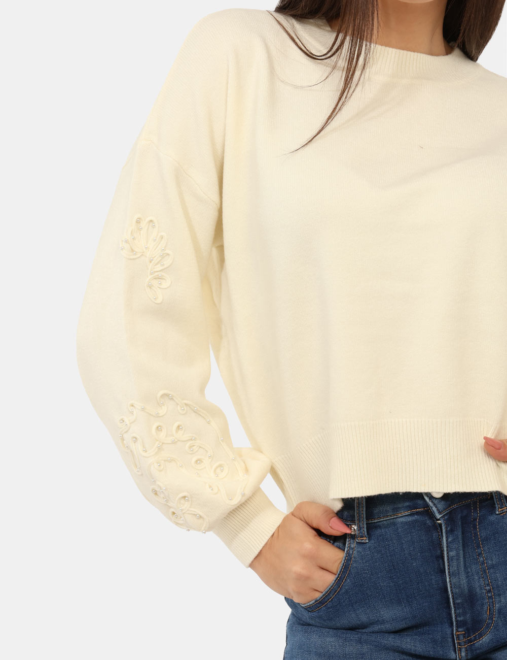 Maglione con girocollo classico in total bianco crema, con trama lavorata sulla maniche arricchita da perline argentate. La vestibilità è morbida e regolare. Il maglione è adatto per occasioni casual e facilmente combinabile. Dona un tocco di stile ai tuoi outfit.