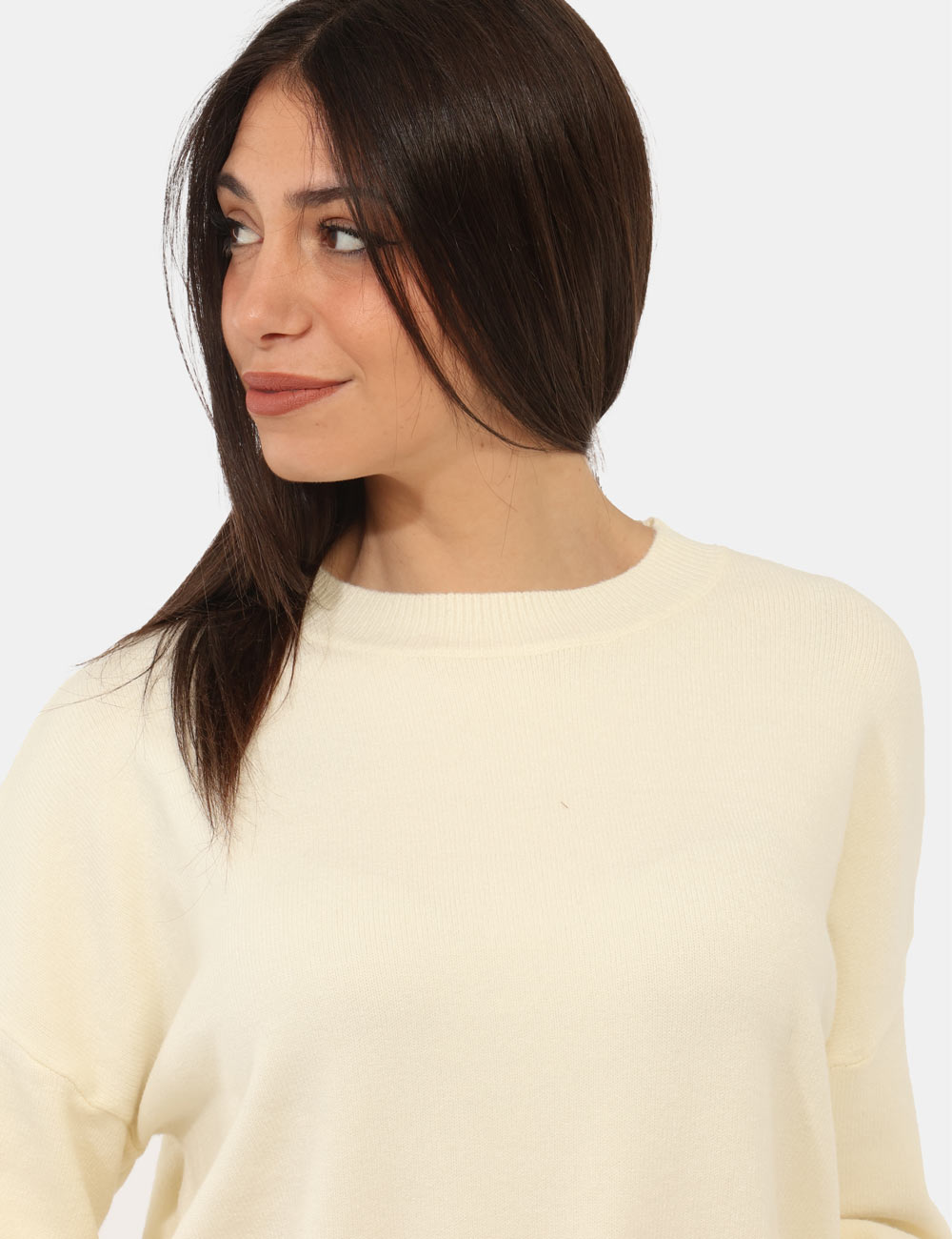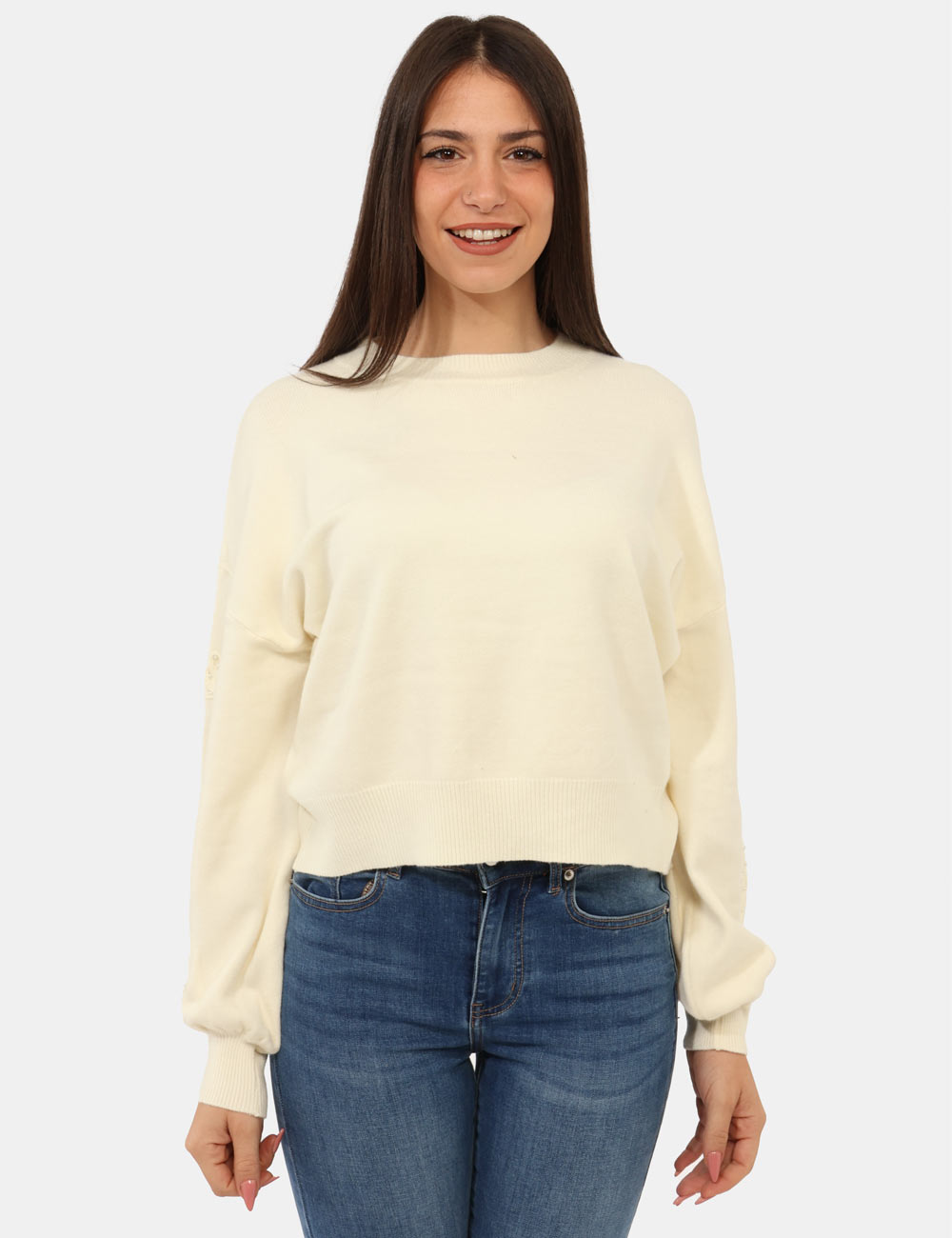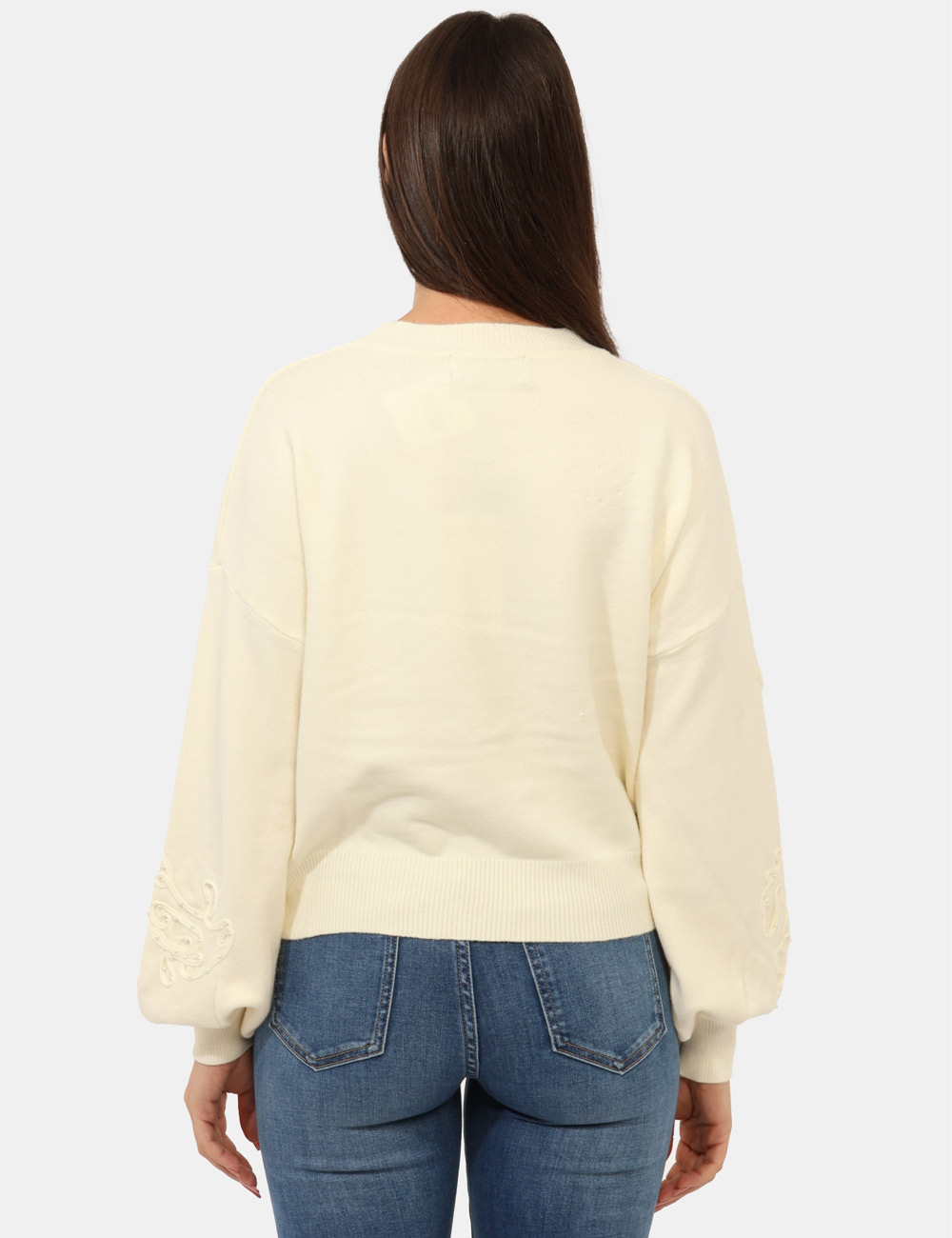 Maglione con girocollo classico in total bianco crema, con trama lavorata sulla maniche arricchita da perline argentate. La vestibilità è morbida e regolare. Il maglione è adatto per occasioni casual e facilmente combinabile. Dona un tocco di stile ai tuoi outfit.