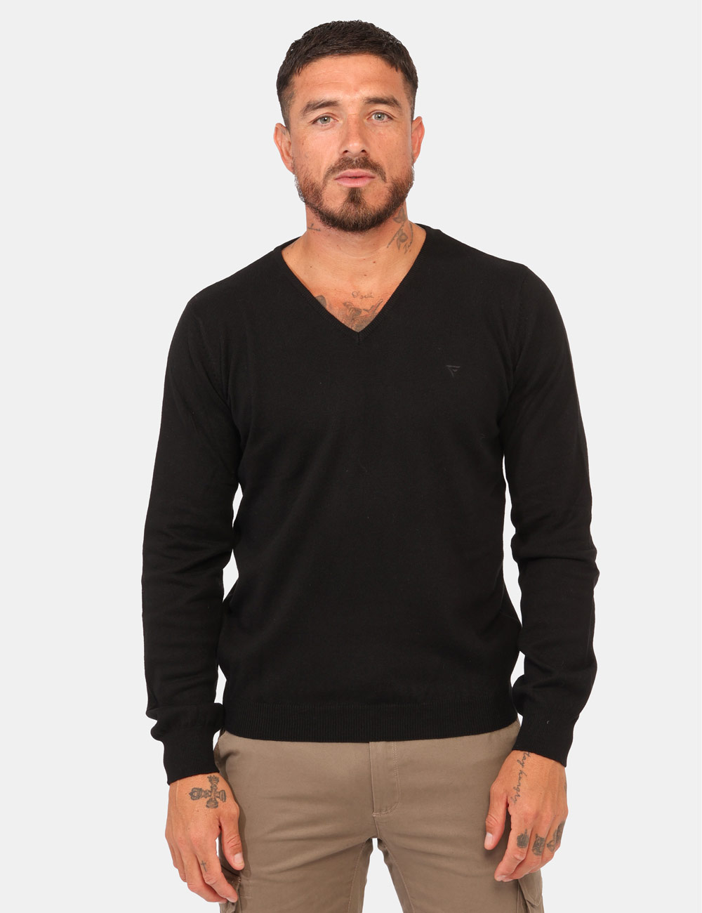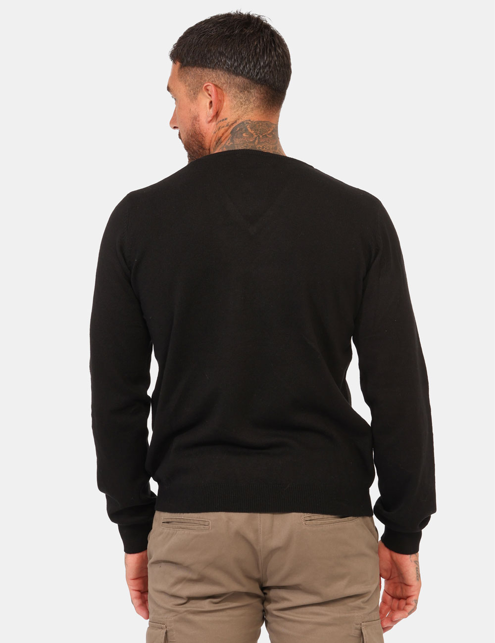 Maglione classico in misto cotone/lana, in total nero con scollo a V. La vestibilità è morbida e regolare. Il maglione è adatto per occasioni casual e facilmente combinabile. Praticità e stile in un solo capo.