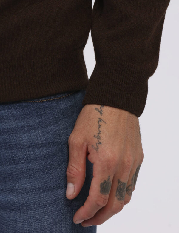 Maglione con scollo a V in total marrone scuro con piccolo logo ad altezza cuore. La vestibilità è morbida e regolare. Il maglione è adatto per occasioni casual e facilmente combinabile. Praticità e stile in un solo capo.