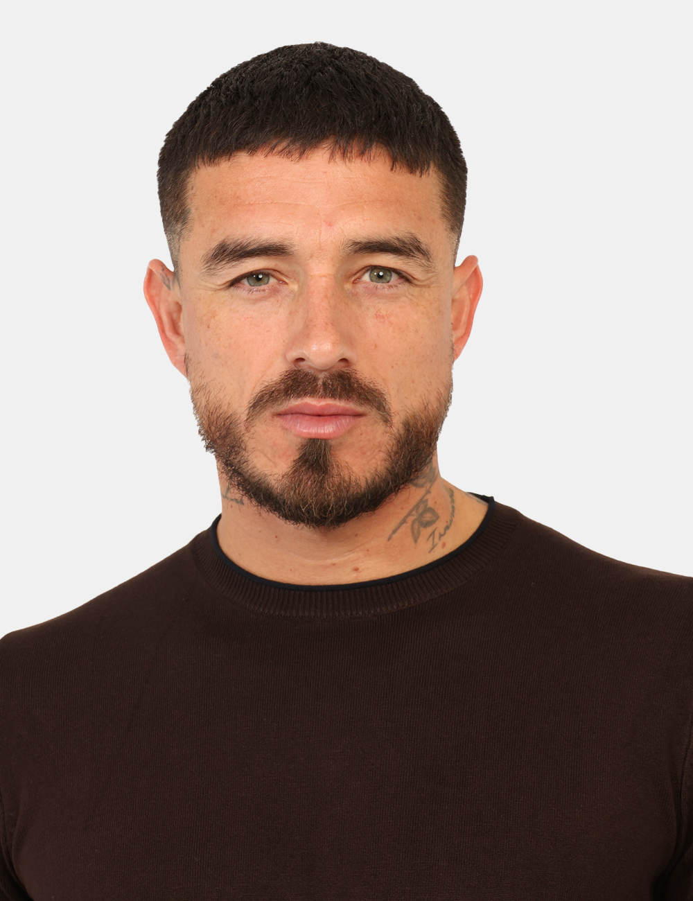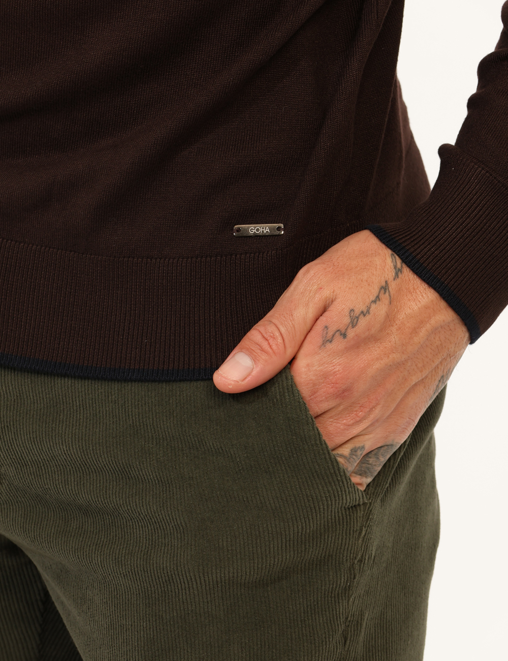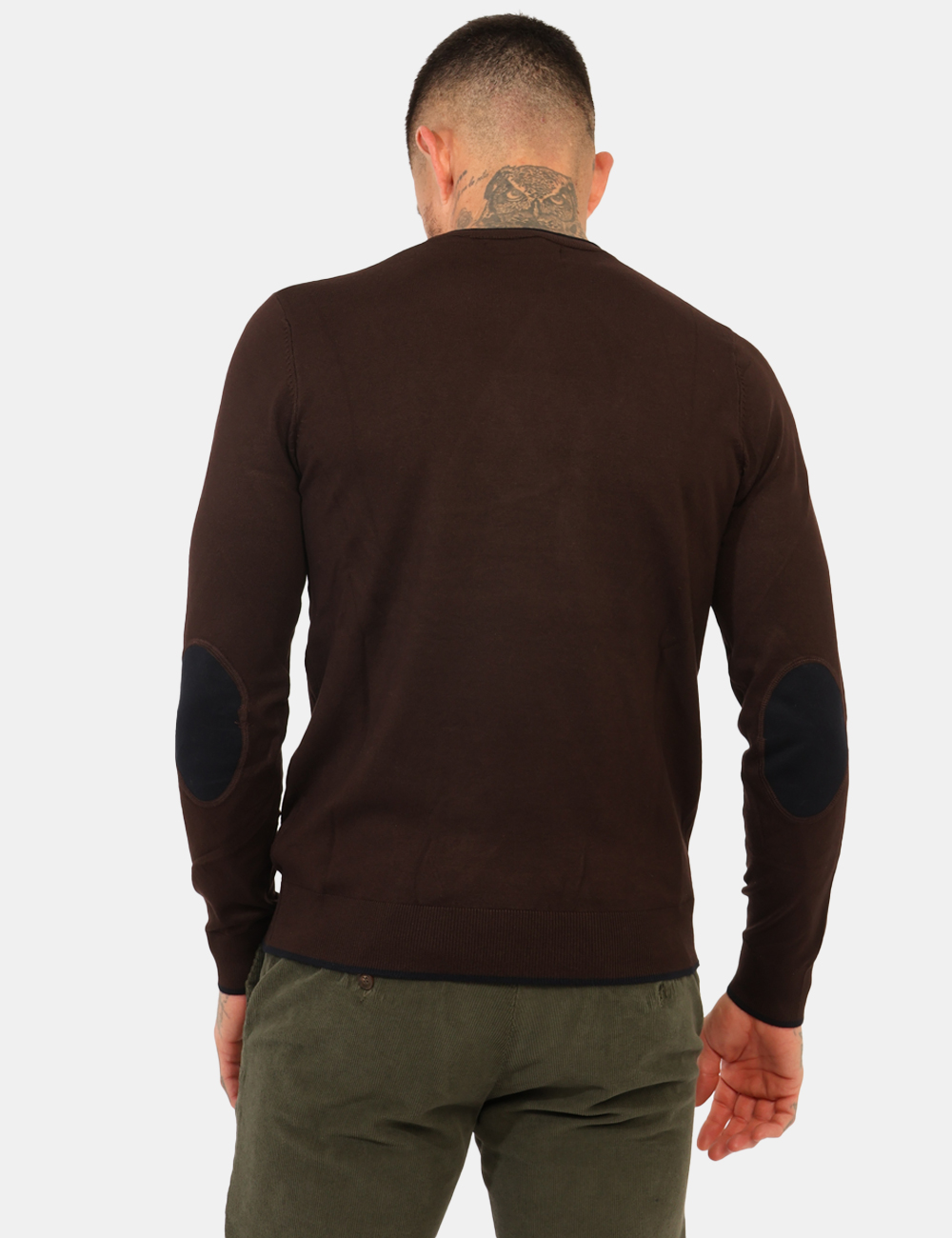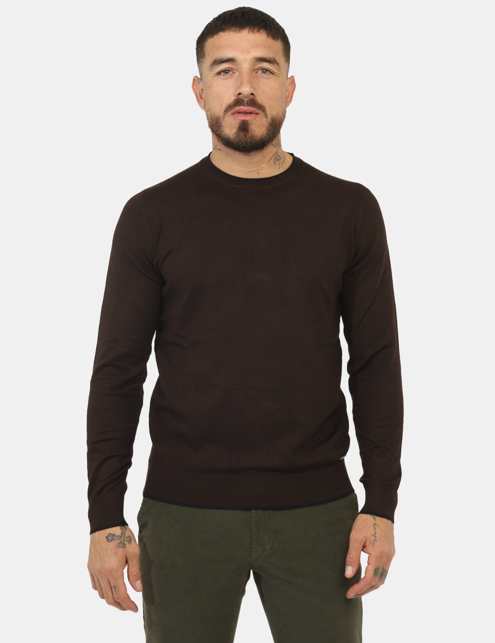 Maglione classico in total marrone testa di moro con girocollo regolare e profilo nero. La vestibilità è morbida e pratica. Il maglione è adatto per occasioni casual e facilmente combinabile. Dona un tocco di stile ai tuoi outfit.