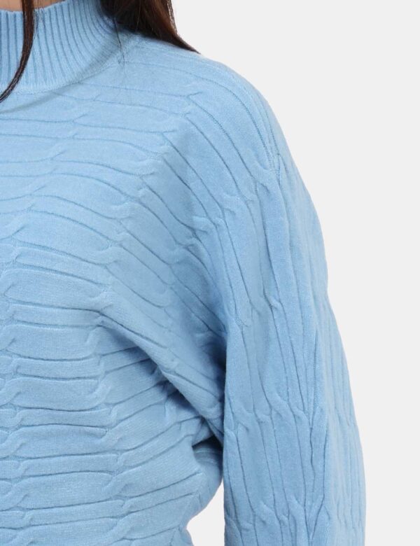 Maglia corta con collo alto, in total celeste e trama intrecciata. La vestibilità è morbida e regolare. La maglia è adatta per occasioni casual e ideale con un pantalone o jeans a vita alta. Dona un tocco fashion ai tuoi outfit.
