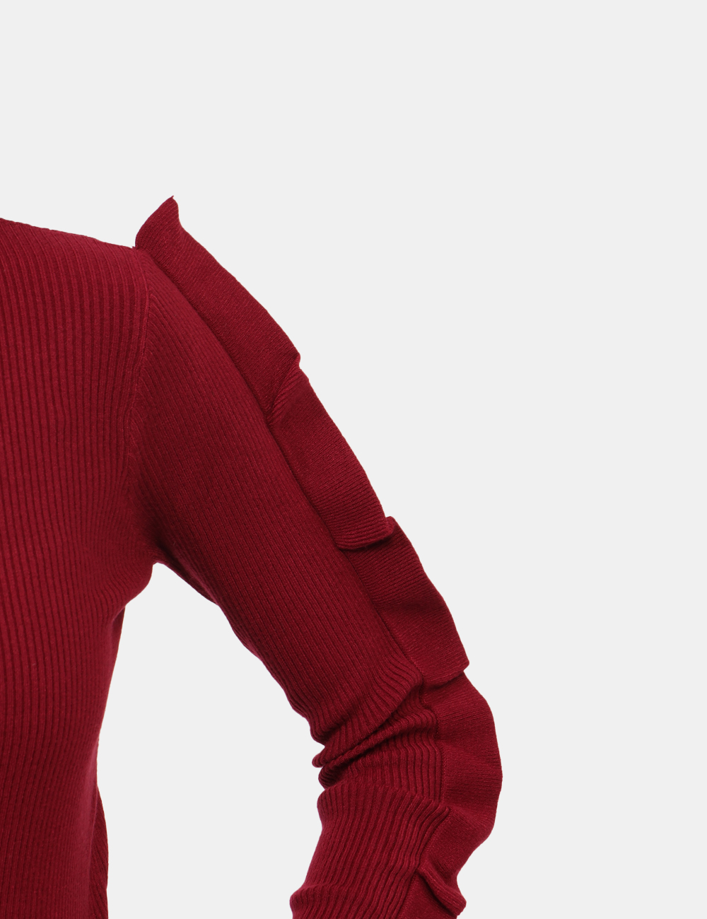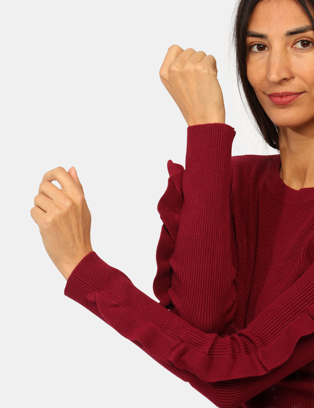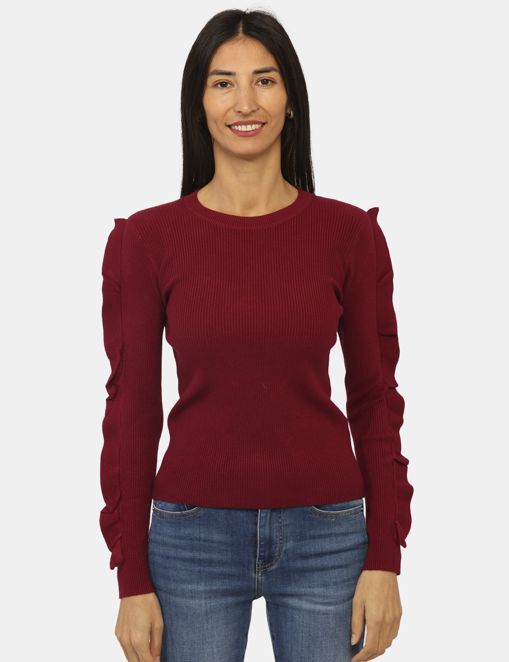 Maglione costina con girocollo classico, in total bordeaux e frill in tinta applicato sulle maniche. La vestibilità è morbida e regolare. Il maglione è adatto per occasioni casual e facilmente combinabile. Praticità e stile in un solo capo.
