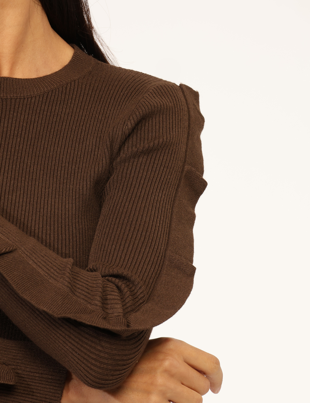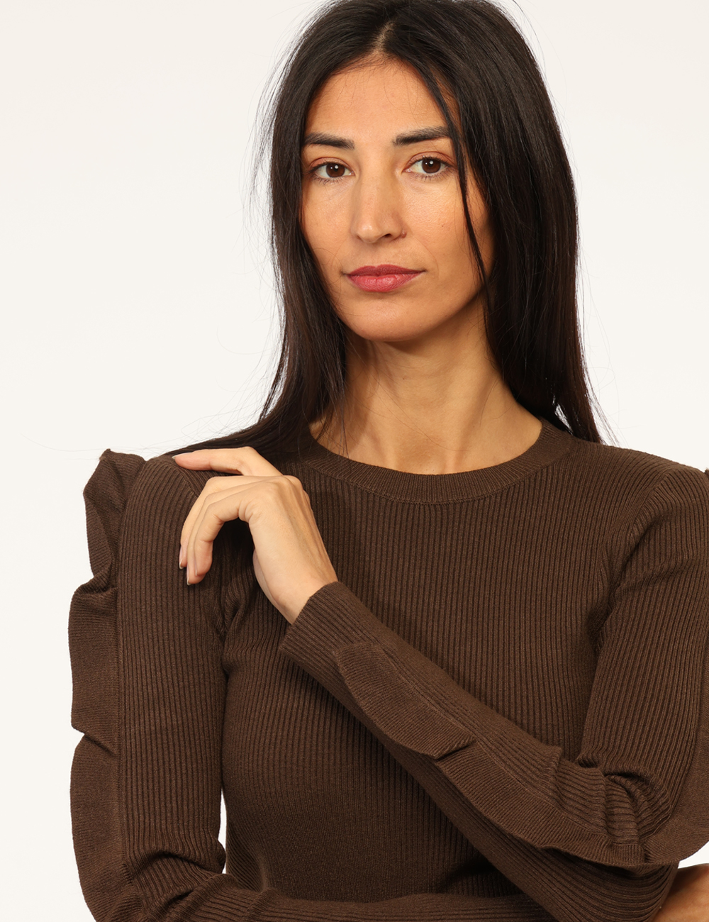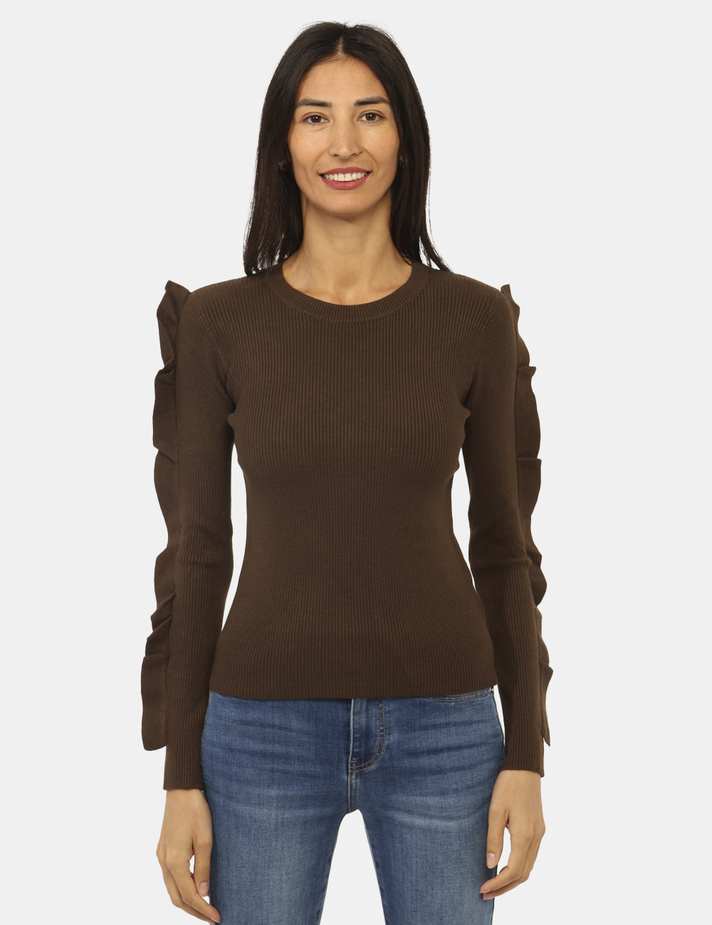 Maglione costina con girocollo classico, in total marrone testa di moro e frill in tinta applicato sulle maniche. La vestibilità è morbida e regolare. Il maglione è adatto per occasioni casual e facilmente combinabile. Praticità e stile in un solo capo.