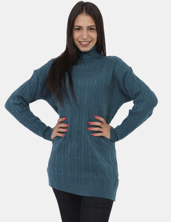 Maglione lungo in total verde ottanio, con trama intrecciata e collo alto. La vestibilità è morbida e regolare. Il vestito è adatto per occasioni casual, ideale anche con i leggings ed in cinturone. Dona un tocco fashion ai tuoi outfit.
