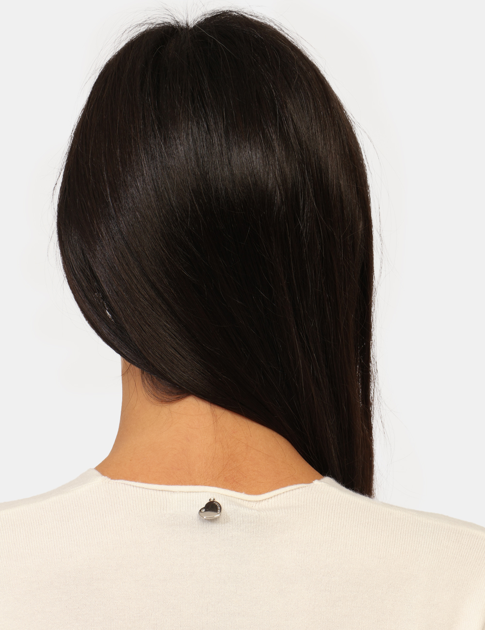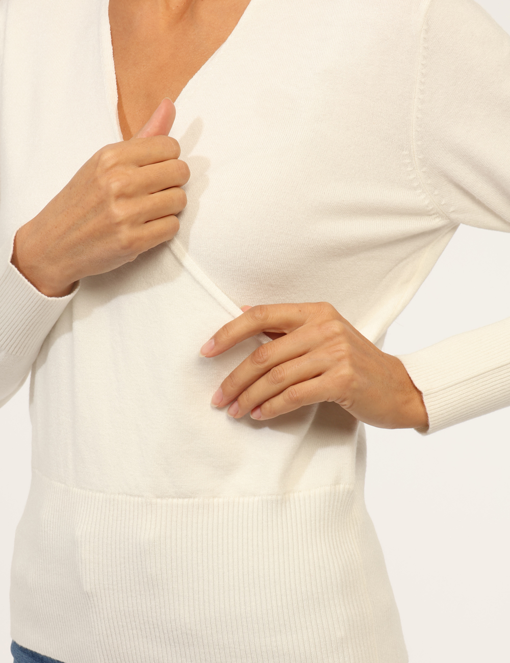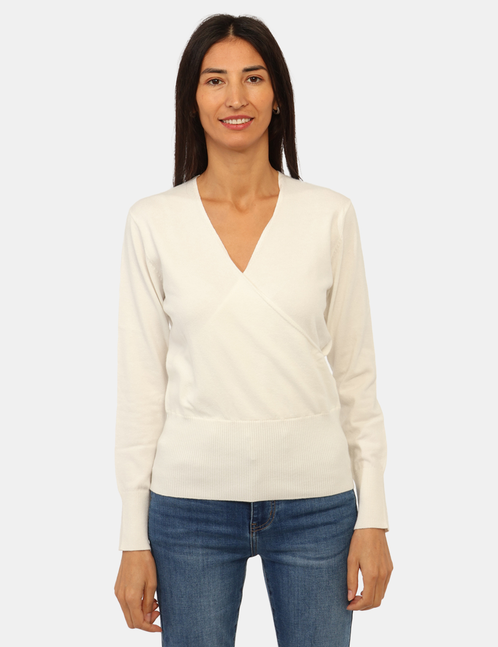 Maglioncino total bianco latte, con taglio incrociato e polsini. La vestibilità è morbida e regolare. Il maglione è adatto per occasioni casual e facilmente combinabile. Praticità e stile in un solo capo.