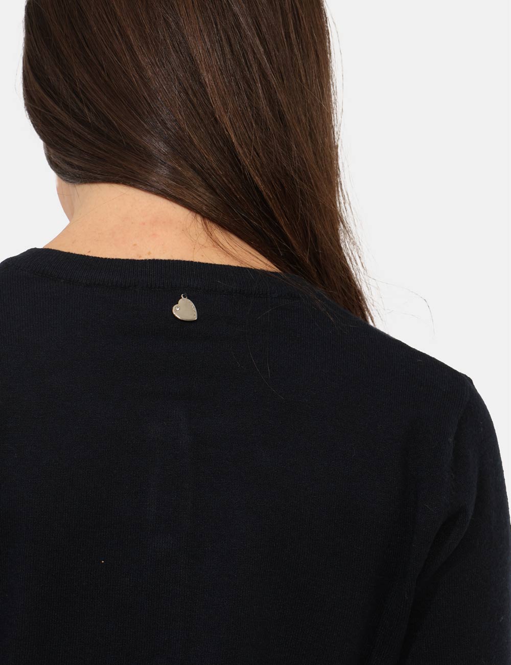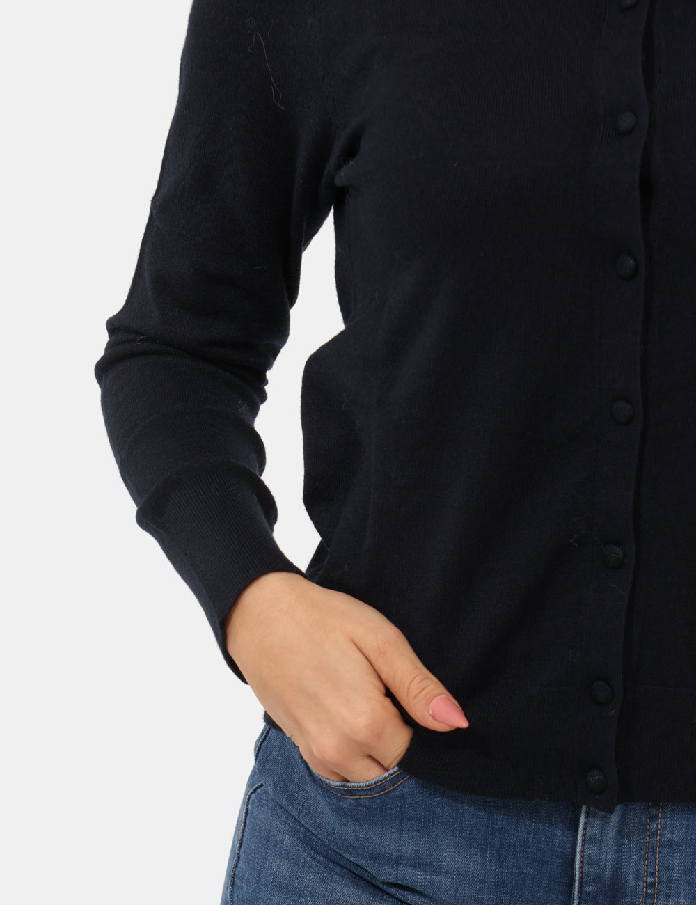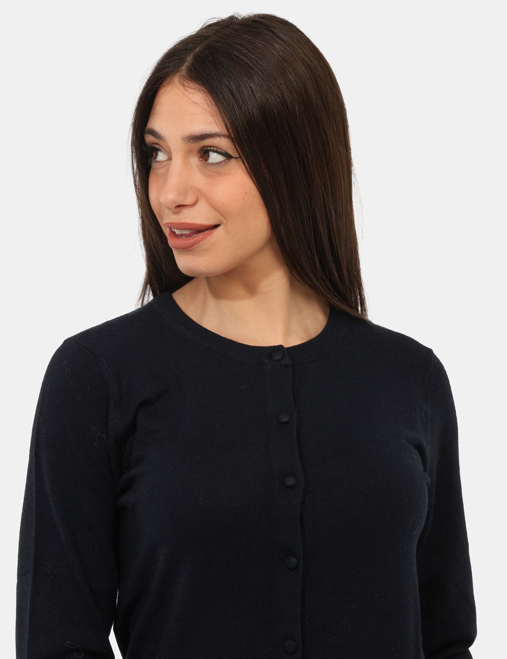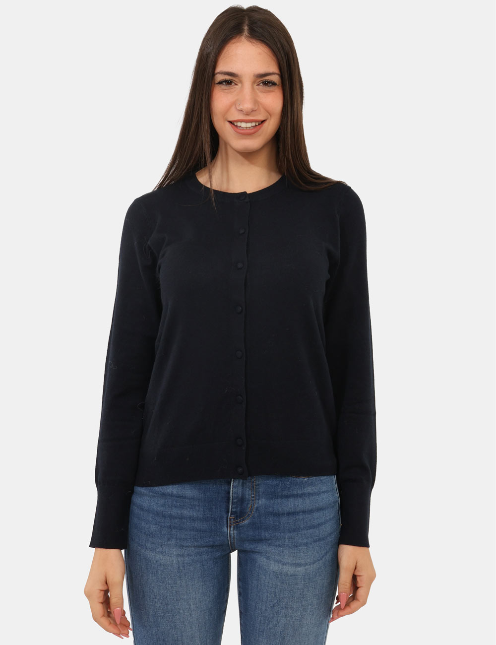 Maglione modello cardigan, con girocollo classico ed in total blu navy. La vestibilità è morbida e pratica grazie a bottoni ad asola in tinta. Il cardigan è adatto per occasioni casual e facilmente combinabile. Aggiungilo al tuo guardaroba e saprai sempre cosa indossare.