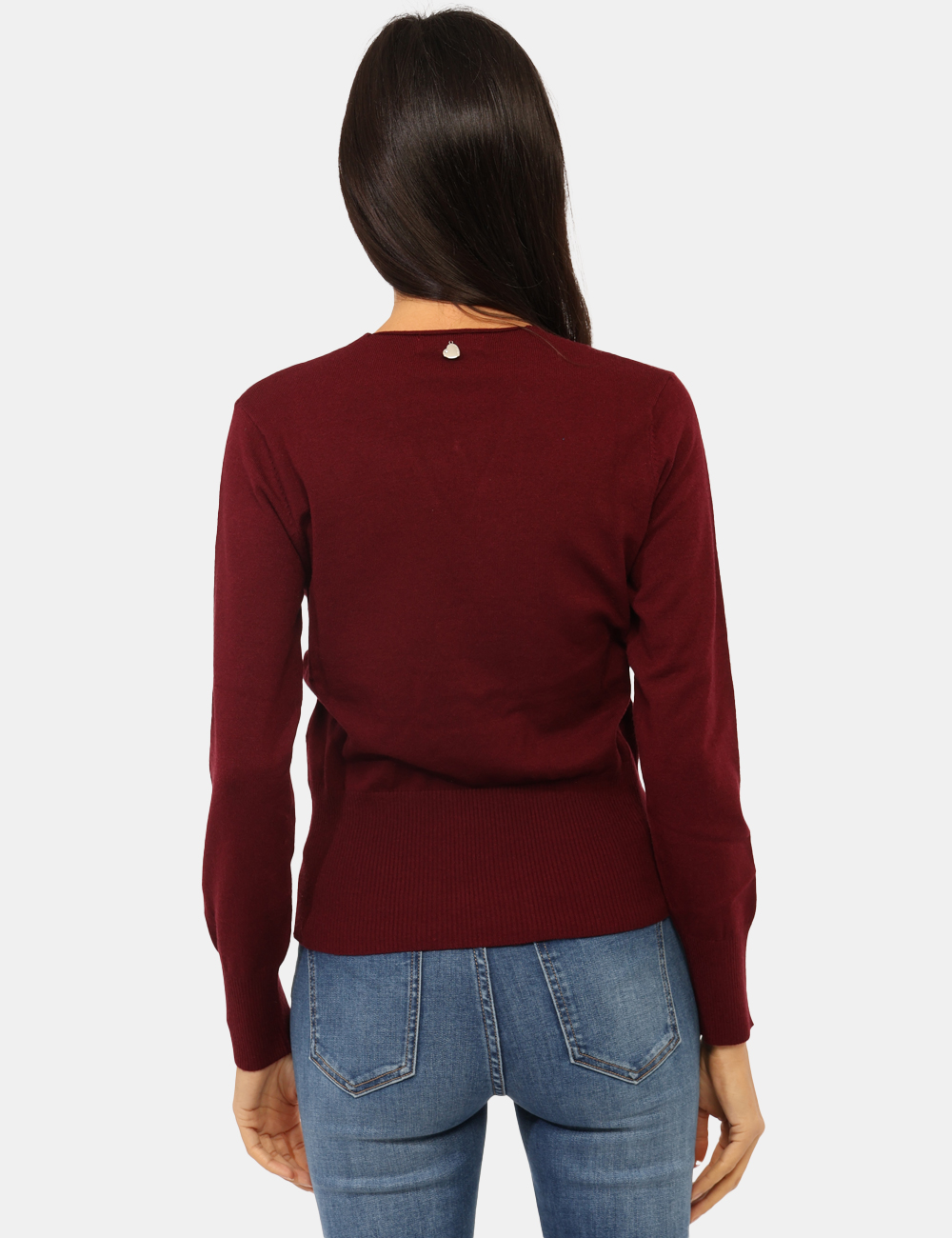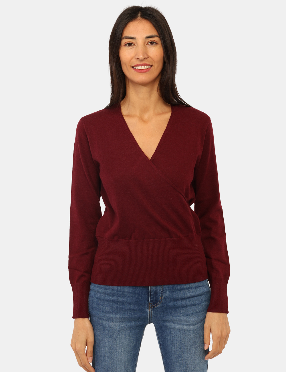Maglioncino total bordeaux, con taglio incrociato e polsini. La vestibilità è morbida e regolare. Il maglione è adatto per occasioni casual e facilmente combinabile. Praticità e stile in un solo capo.