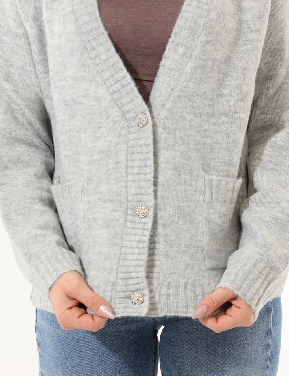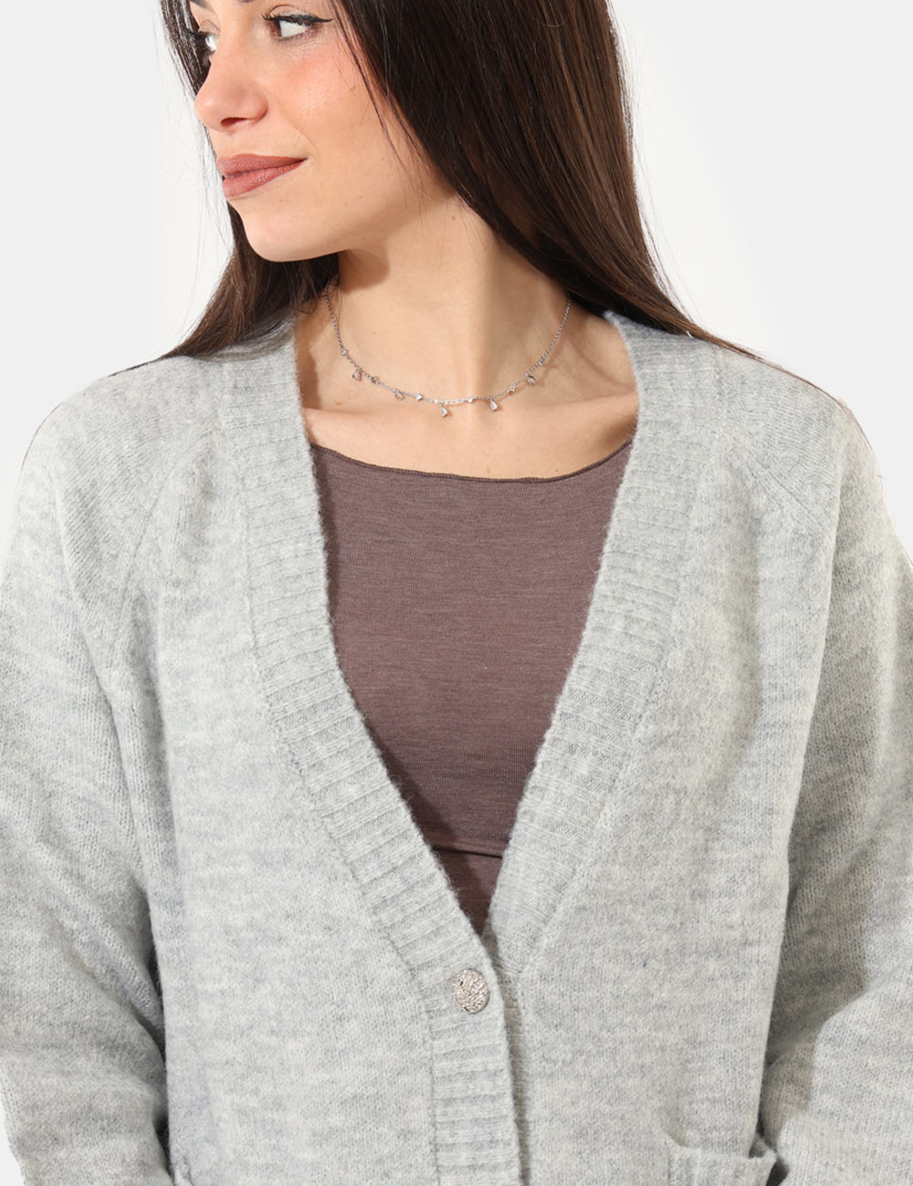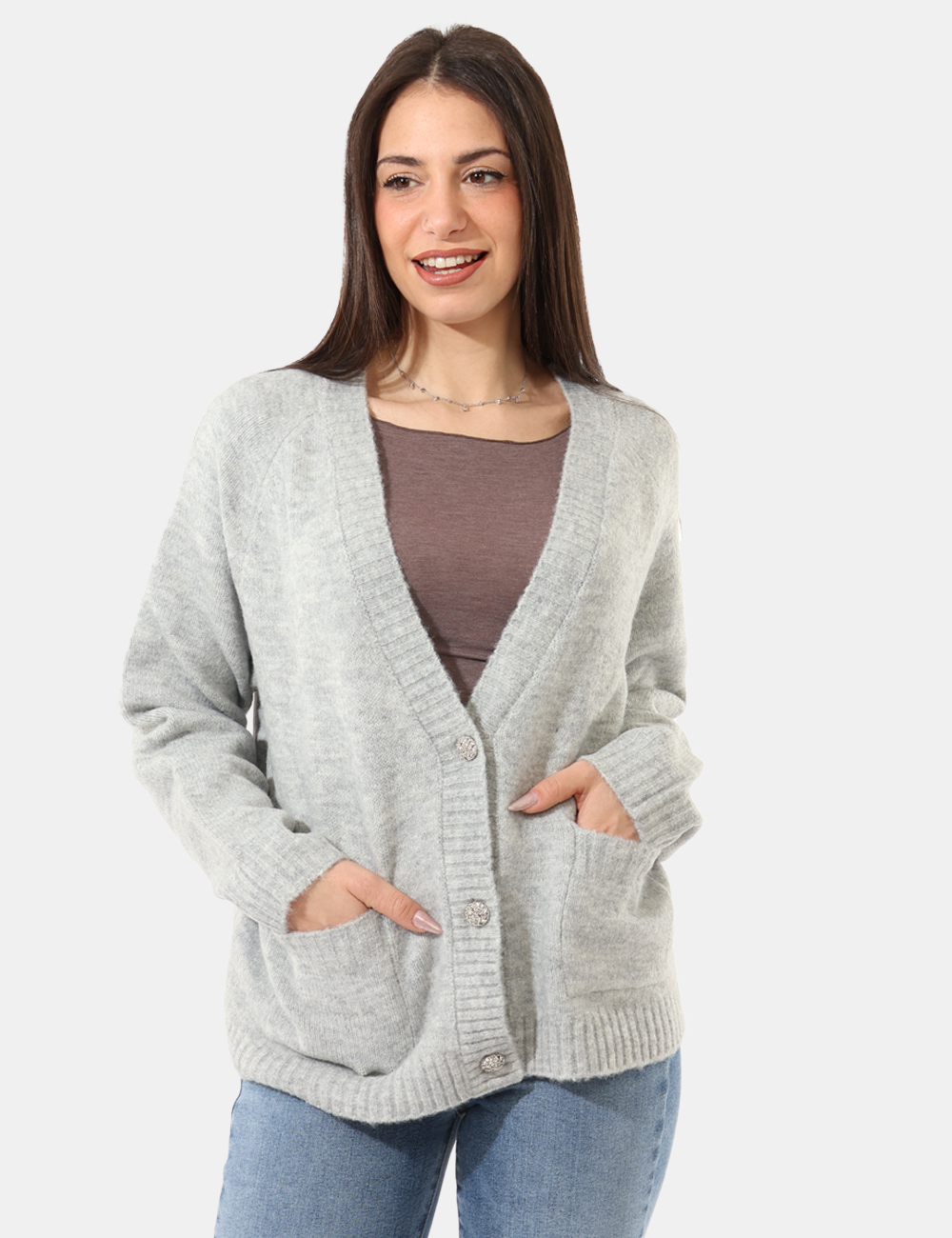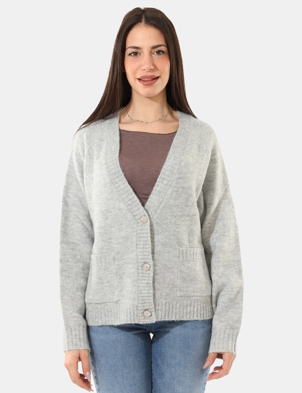 Maglione modello cardigan, in misto lana, total grigio chiaro con tasche a toppa. La vestibilità è morbida e pratica grazie a bottoni ad asola in tinta. Il carrdigan è adatto per occasioni casual e facilmente combinabile. Praticità e stile in un solo cpao.