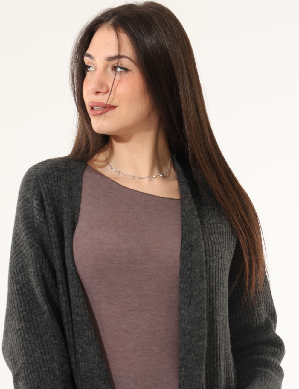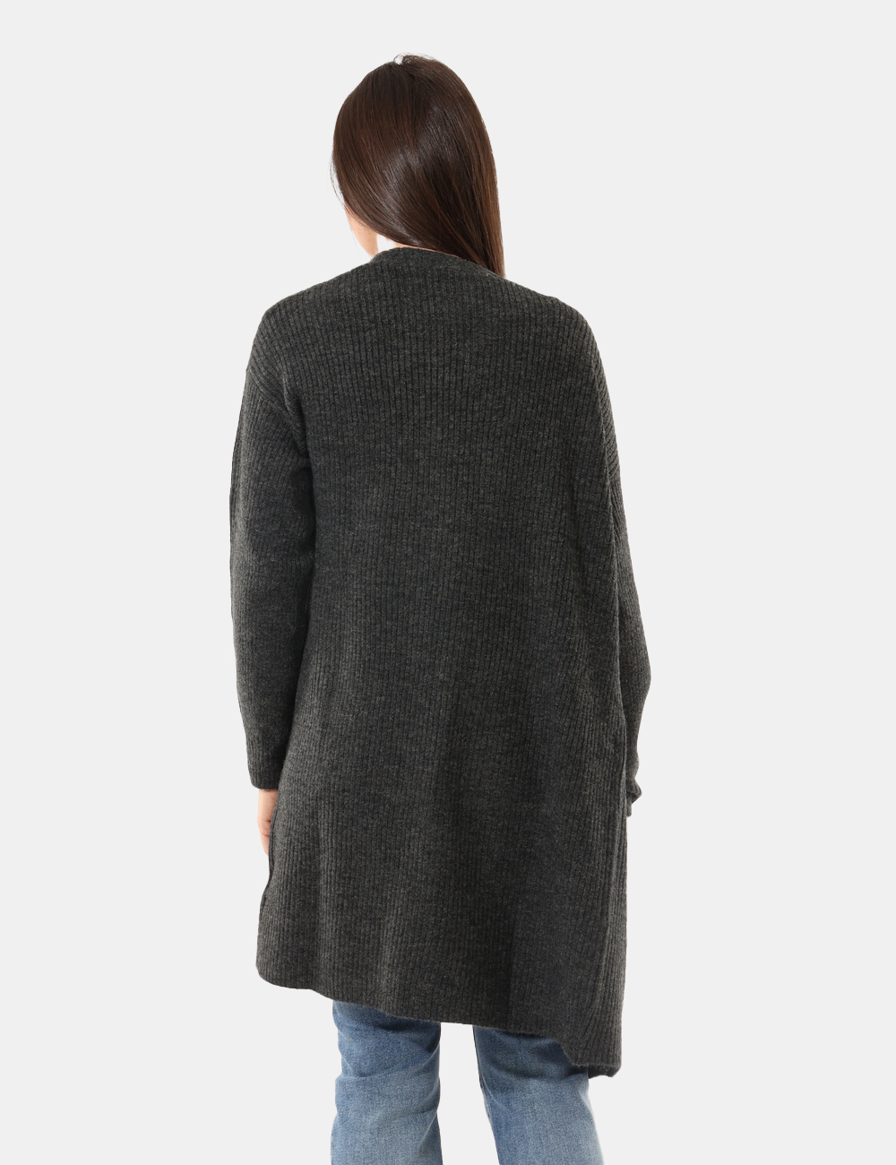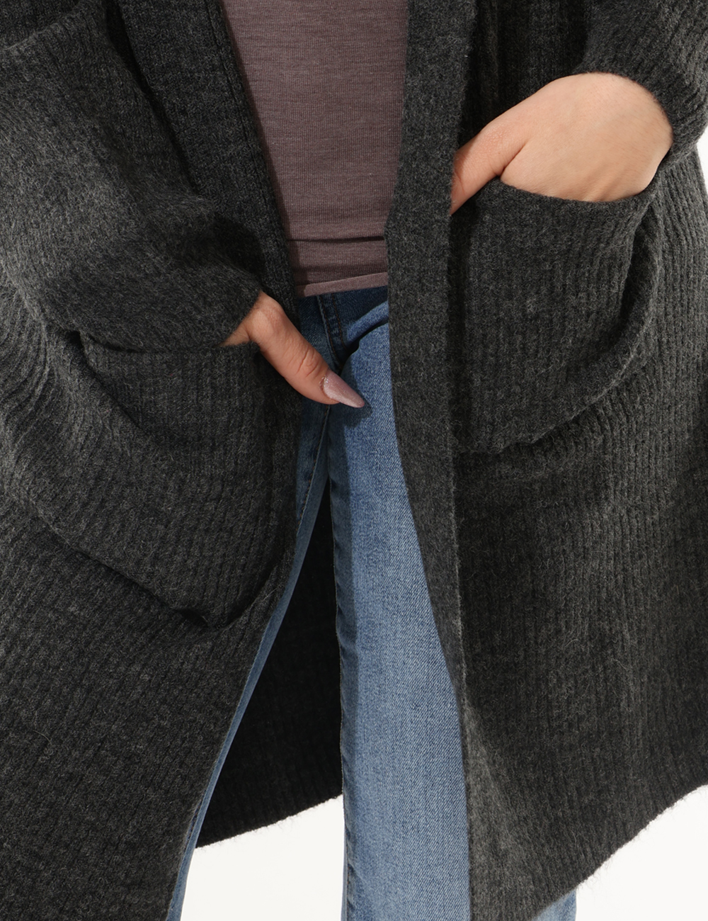 Maglione lungo, simil cardigan aperto sul fronte, in misto lana, con tasche a toppa e total grigio antracite. La vestibilità è morbida e regolare. Il maglione è adatto per occasioni casual e facilmente combinabile. Aggiungilo al tuo guardaroba e saprai sempre cosa indossare.
