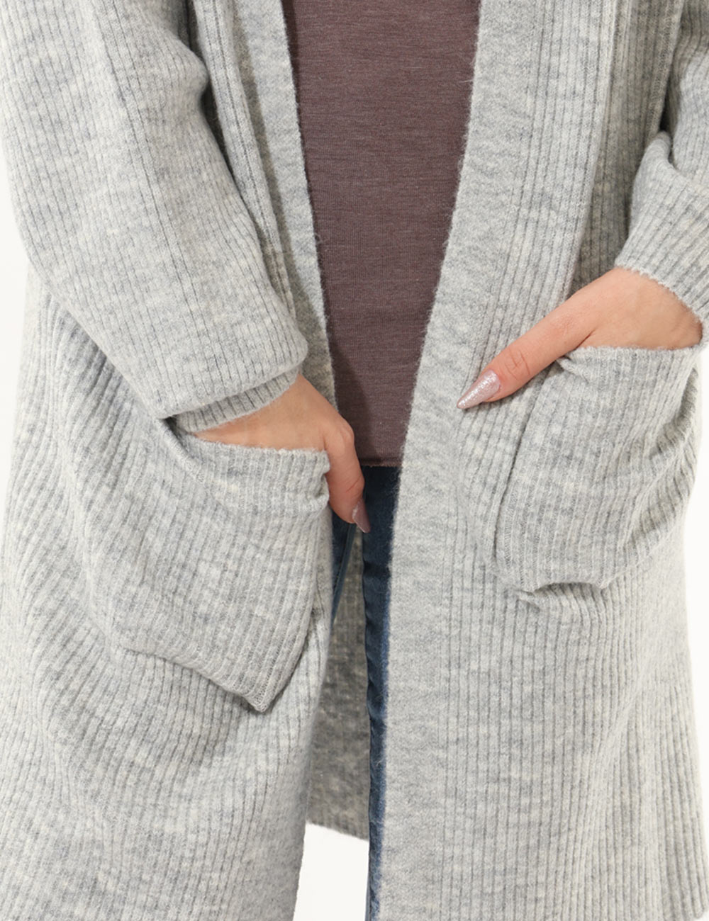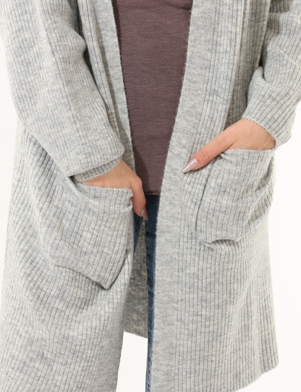 Maglione lungo, simil cardigan aperto sul fronte, in misto lana, con tasche a toppa e total grigio chiaro. La vestibilità è morbida e regolare. Il maglione è adatto per occasioni casual e facilmente combinabile. Aggiungilo al tuo guardaroba e saprai sempre cosa indossare.