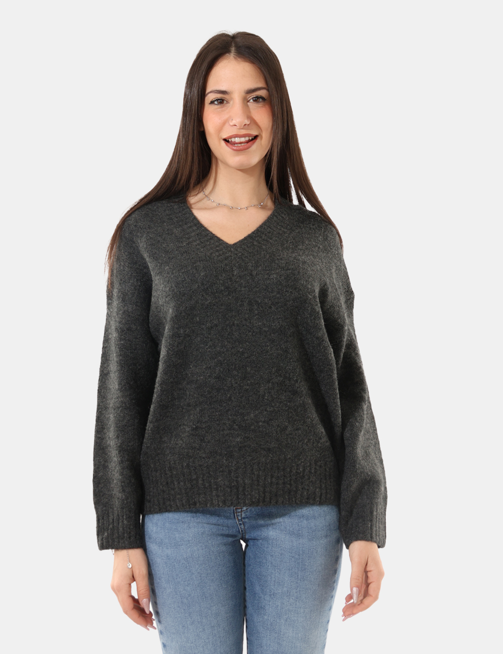 Maglione con scollo a V, in misto lana e total grigio antracite. La vestibilità è morbida e regolare. Il maglione è adatto per occasioni casual e facilmente combinabile. Aggiungilo al tuo guardaroba e saprai sempre cosa indossare.