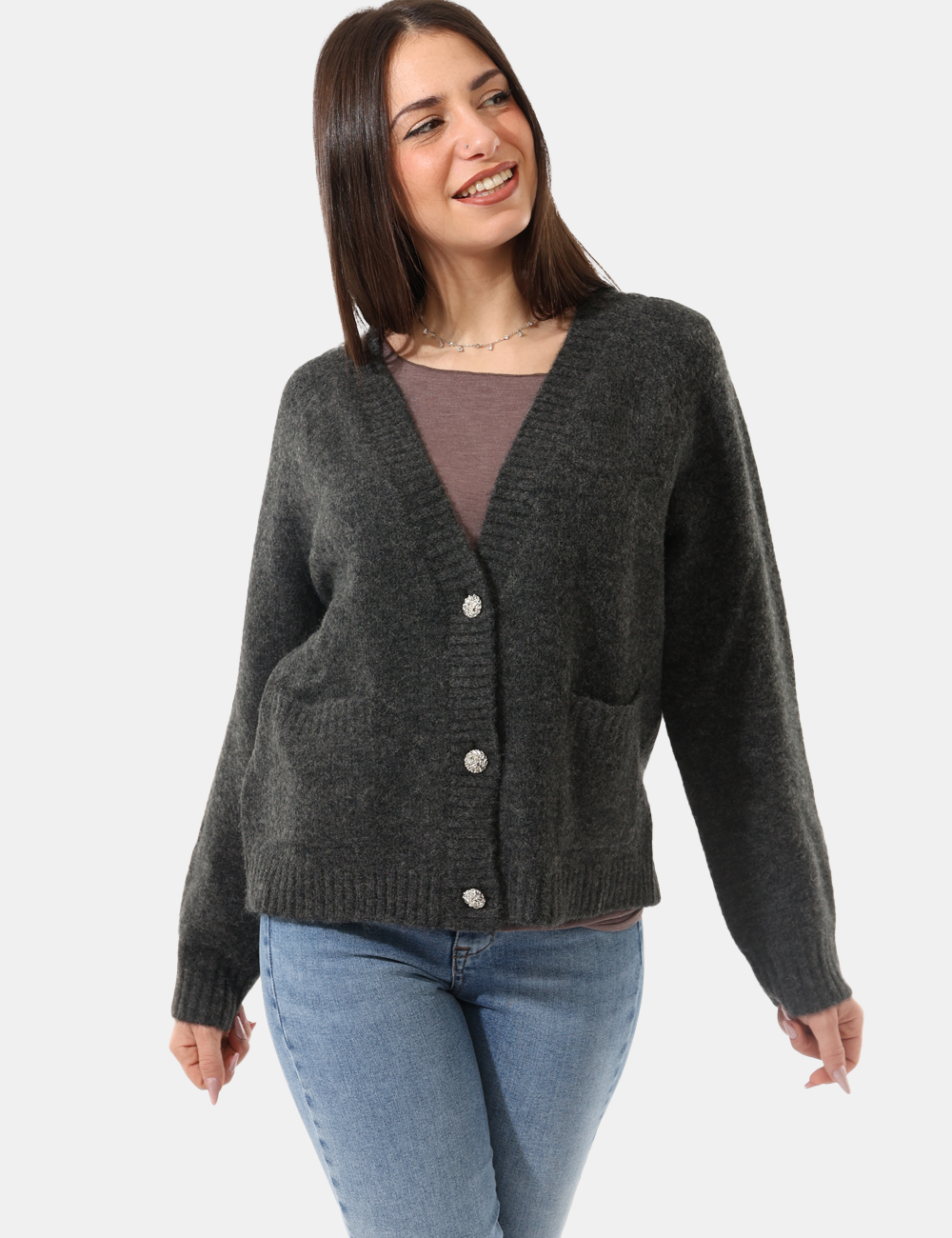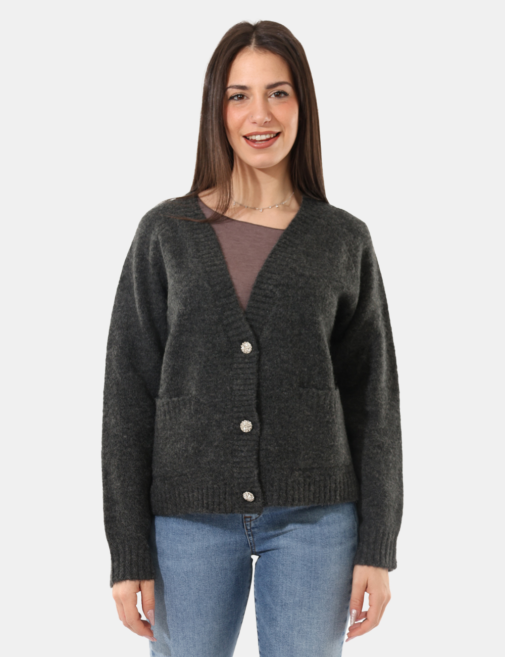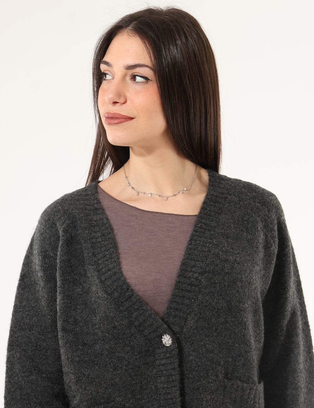 Maglione modello cardigan, in misto lana, total grigio antracite con tasche a toppa. La vestibilità è morbida e pratica grazie a bottoni ad asola in tinta. Il carrdigan è adatto per occasioni casual e facilmente combinabile. Praticità e stile in un solo cpao.