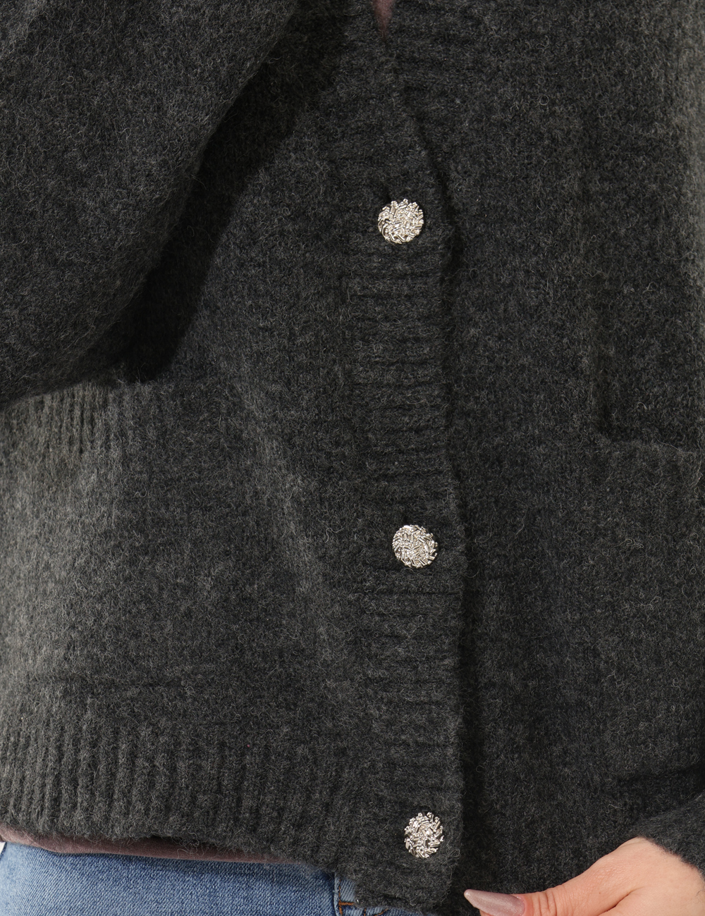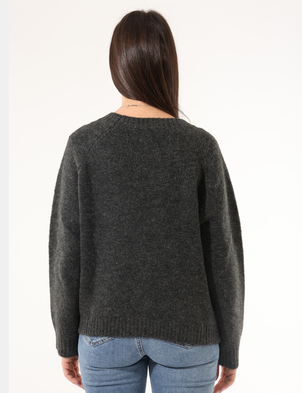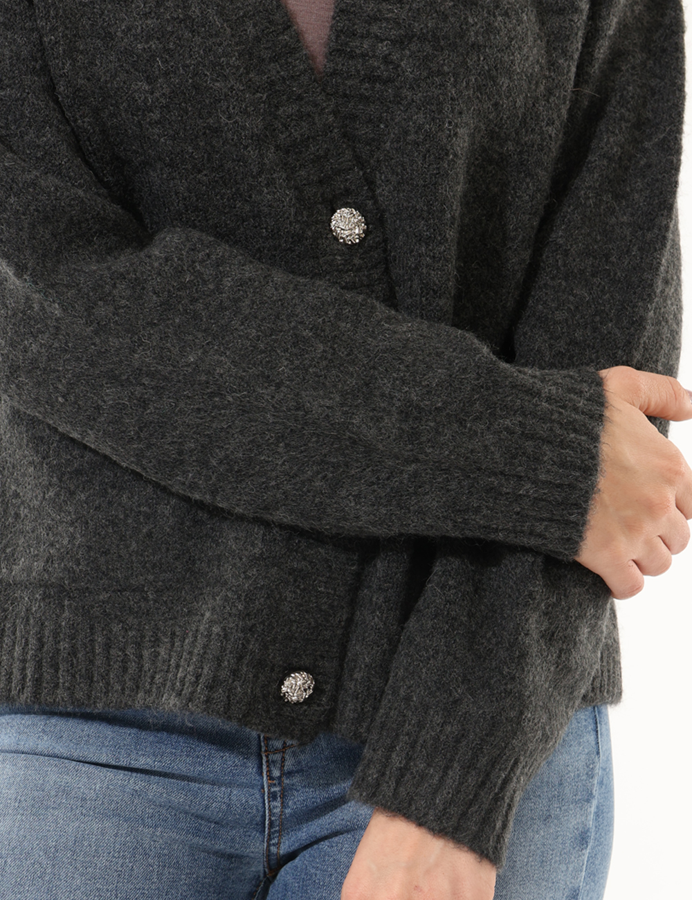 Maglione modello cardigan, in misto lana, total grigio antracite con tasche a toppa. La vestibilità è morbida e pratica grazie a bottoni ad asola in tinta. Il carrdigan è adatto per occasioni casual e facilmente combinabile. Praticità e stile in un solo cpao.