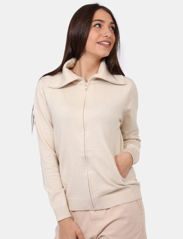 Maglione in total bianco panna con collo alto e apertura frontale. Presenti anche tasche a taglio trasversale. La vestibilità è morbida e pratica grazie a zip sul fronte. Il maglione è adatto per occasioni casual e facilmente combinabile. Praticità e stile in un solo capo.