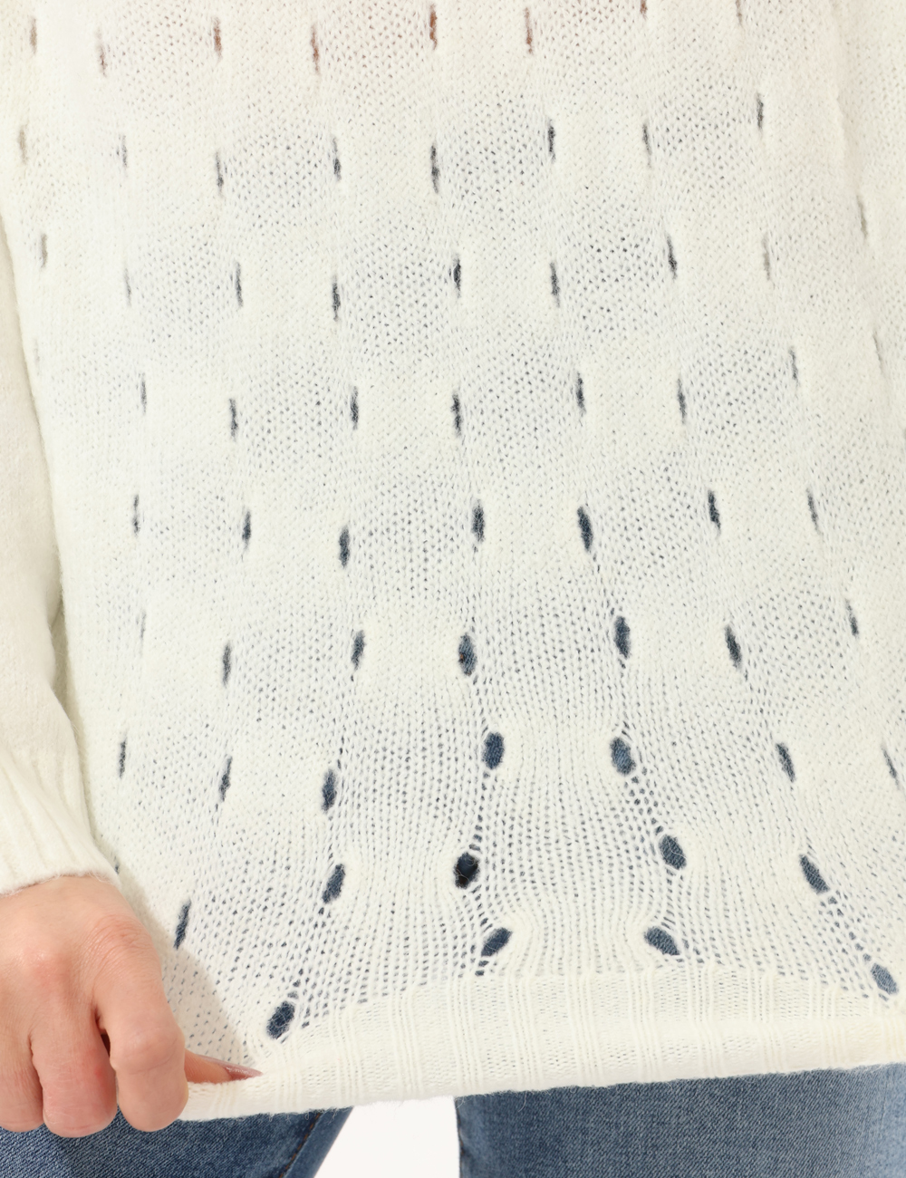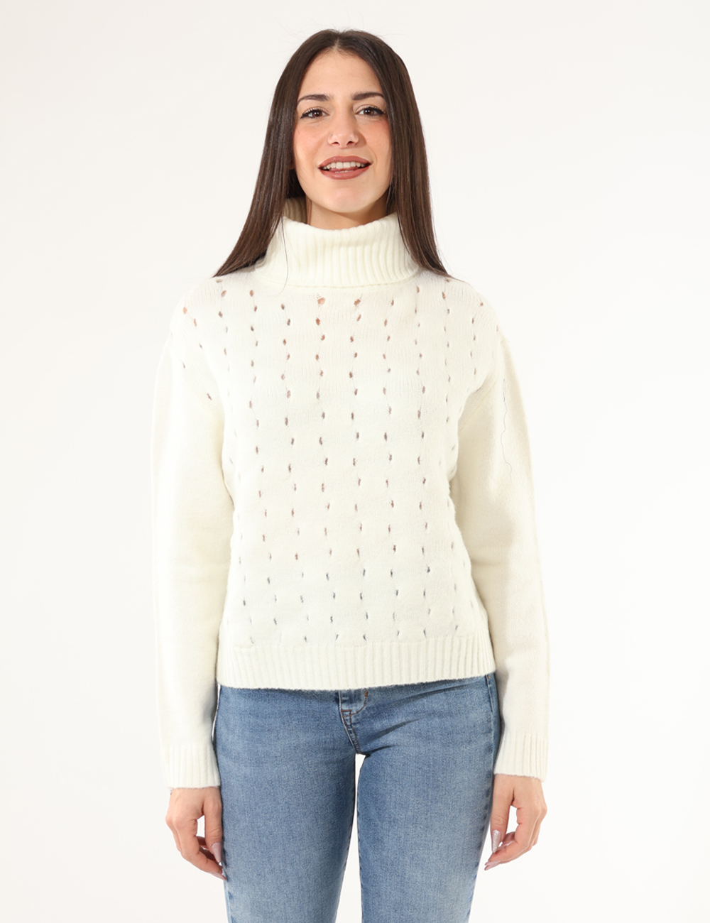 Maglione a collo alto, in misto lana, total bianco panna con trama traforata. La vestibilità è morbida e regolare. Il maglione è adatto per occasioni casual e facilmente combinabile. Scalda il tuo inverno con un tocco di stile.