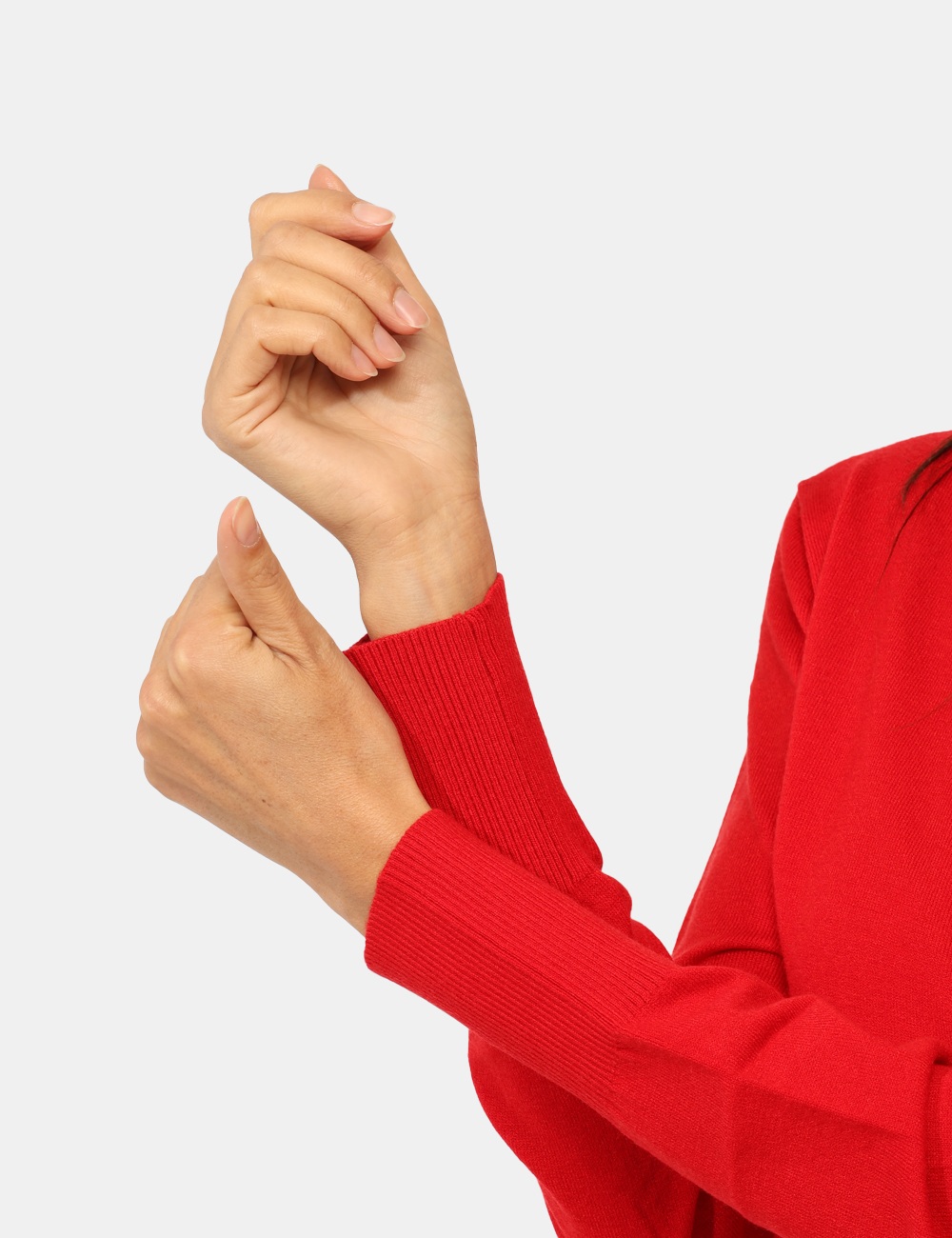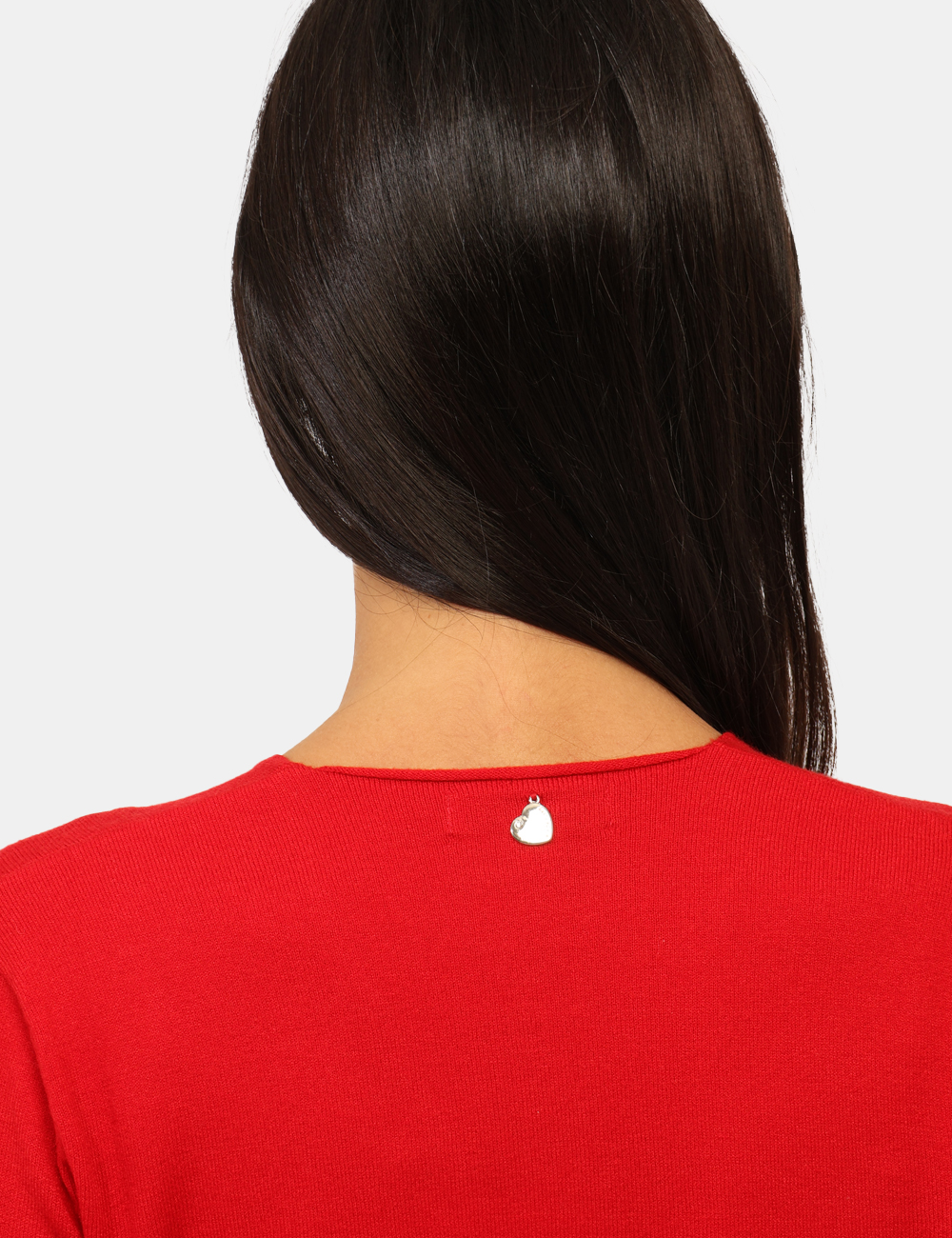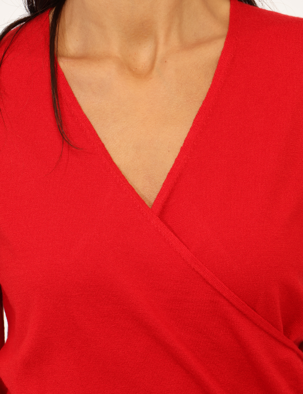 Maglioncino total rosso, con taglio incrociato e polsini. La vestibilità è morbida e regolare. Il maglione è adatto per occasioni casual e facilmente combinabile. Praticità e stile in un solo capo.