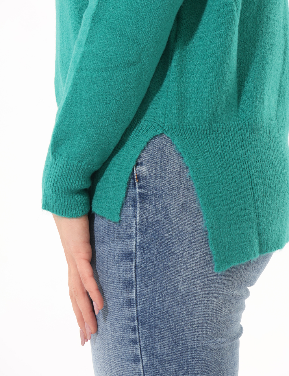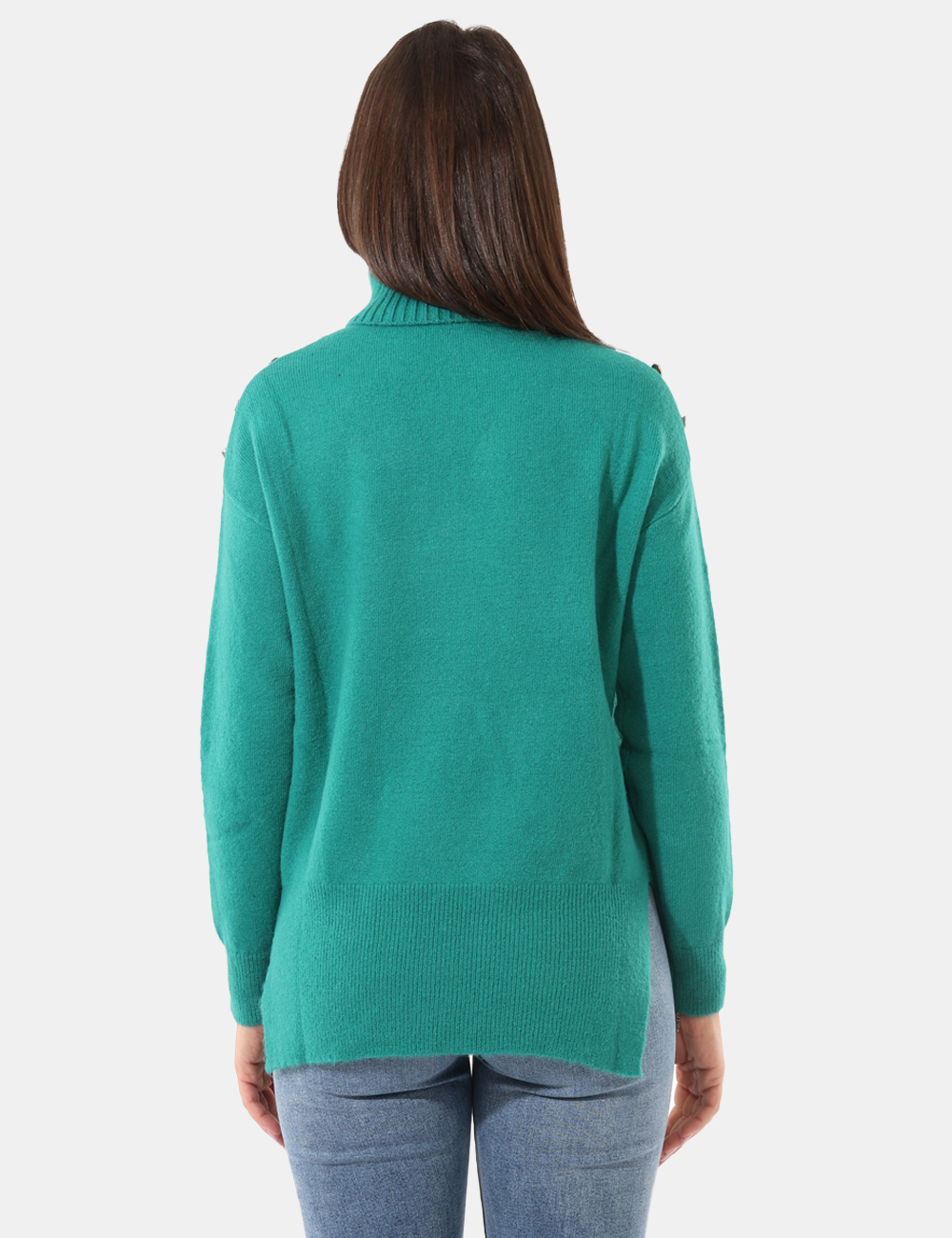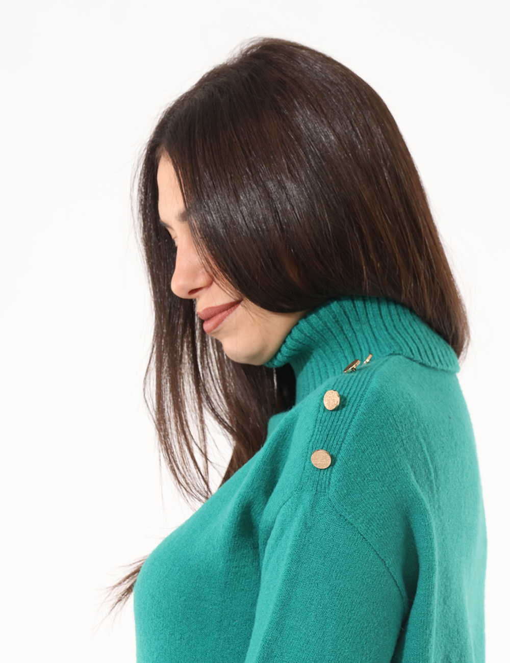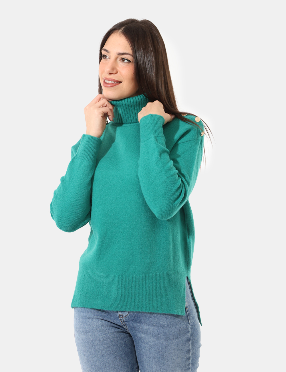 Maglione a collo alto, in misto lana, total verde, con spacchetti laterali e bottoni dorati sulle spalle. La vestibilità è morbida e regolare. Il maglione è adatto per occasioni casual e facilmente combinabile. Scalda il tuo inverno e affrontalo con stile.