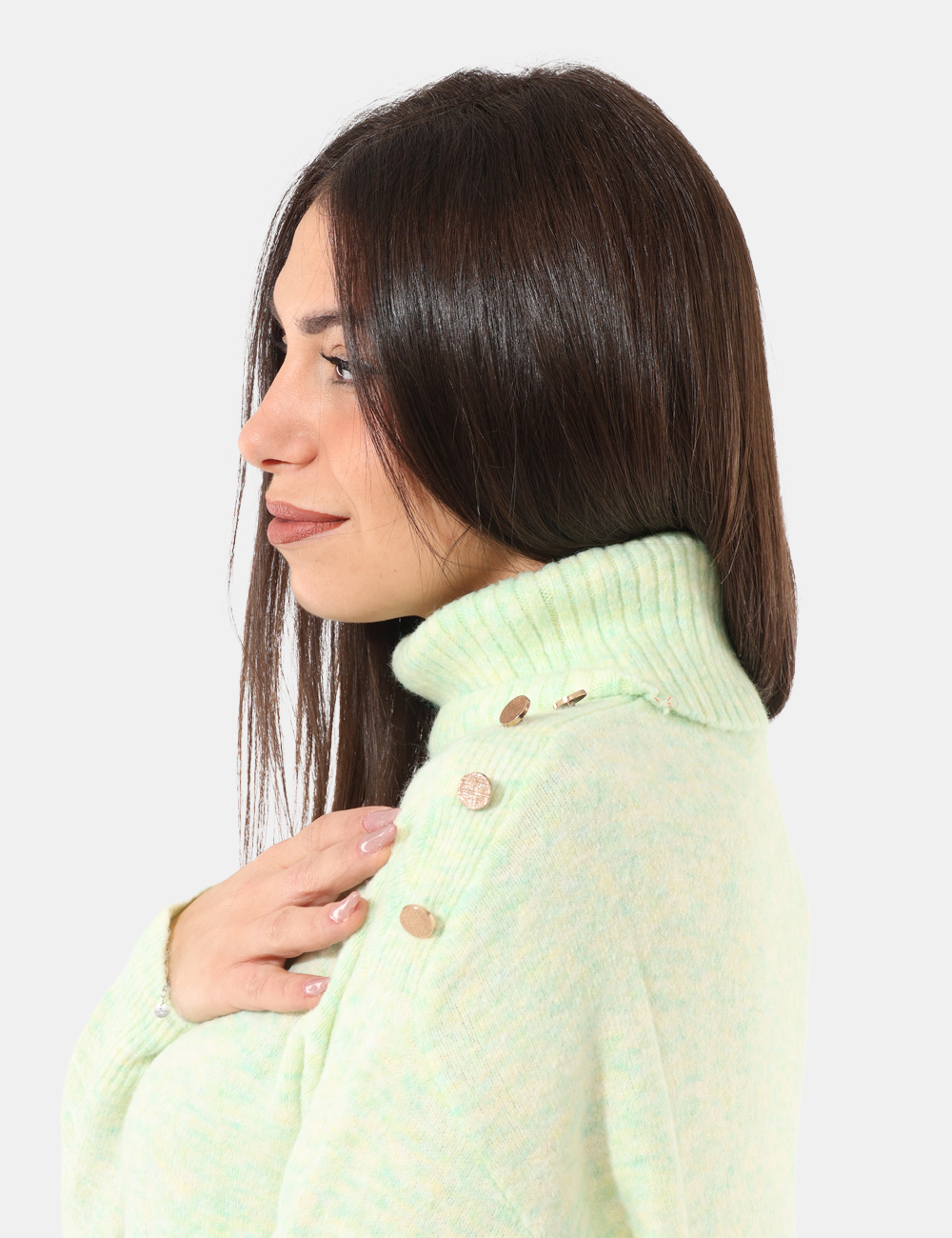 Maglione a collo alto, in misto lana, total verde acqua, con spacchetti laterali e bottoni dorati sulle spalle. La vestibilità è morbida e regolare. Il maglione è adatto per occasioni casual e facilmente combinabile. Scalda il tuo inverno e affrontalo con stile.