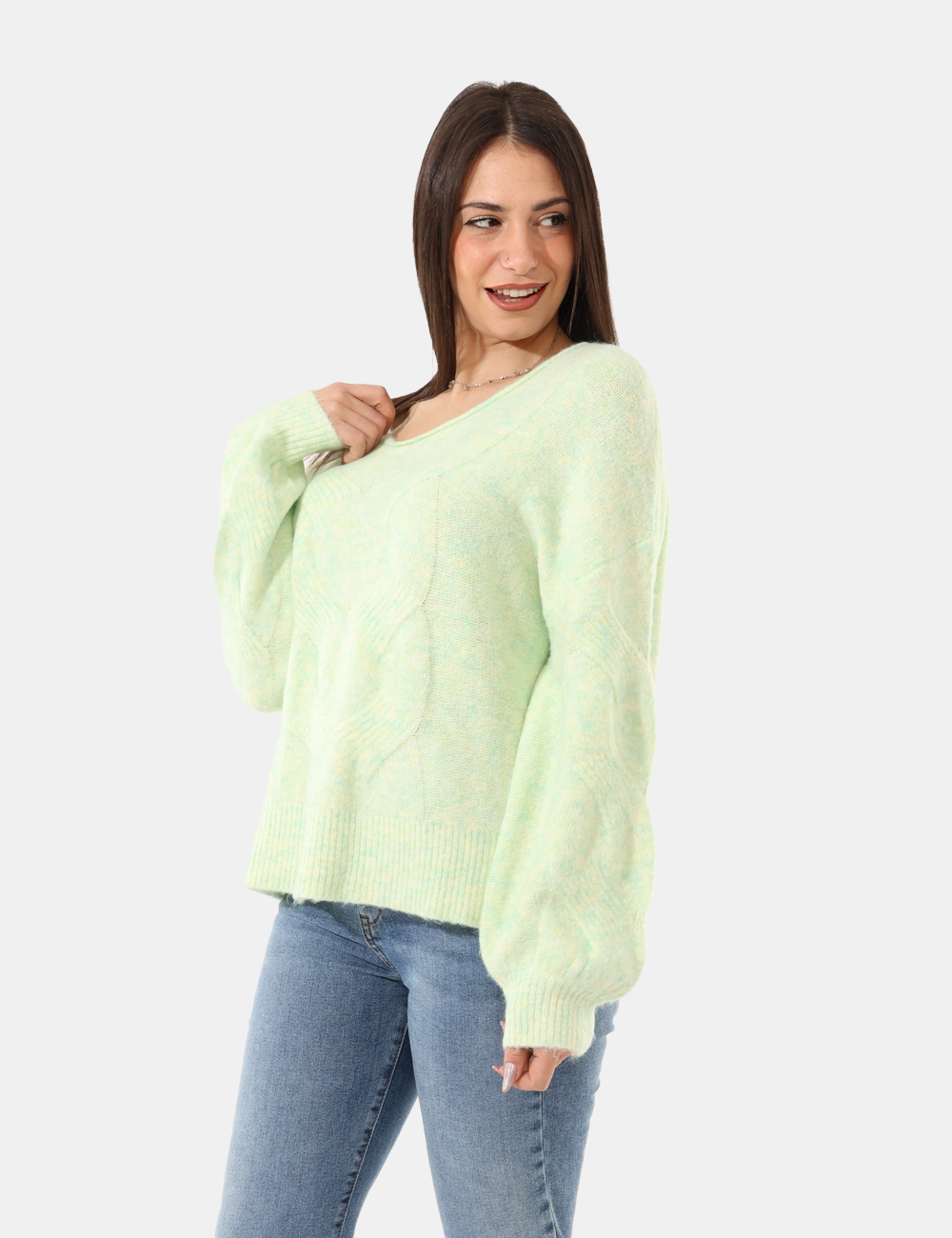 Maglione con scollo a V e trama lavorata, in misto lana e total verde acqua. La vestibilità è morbida e regolare. Il maglione è adatto per occasioni casual e facilmente combinabile. Aggiungilo al tuo guardaroba e saprai sempre cosa indossare.