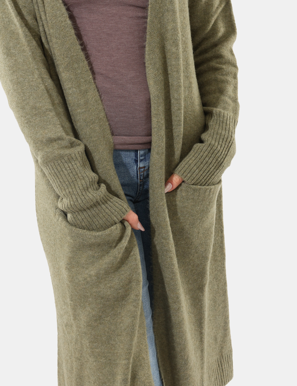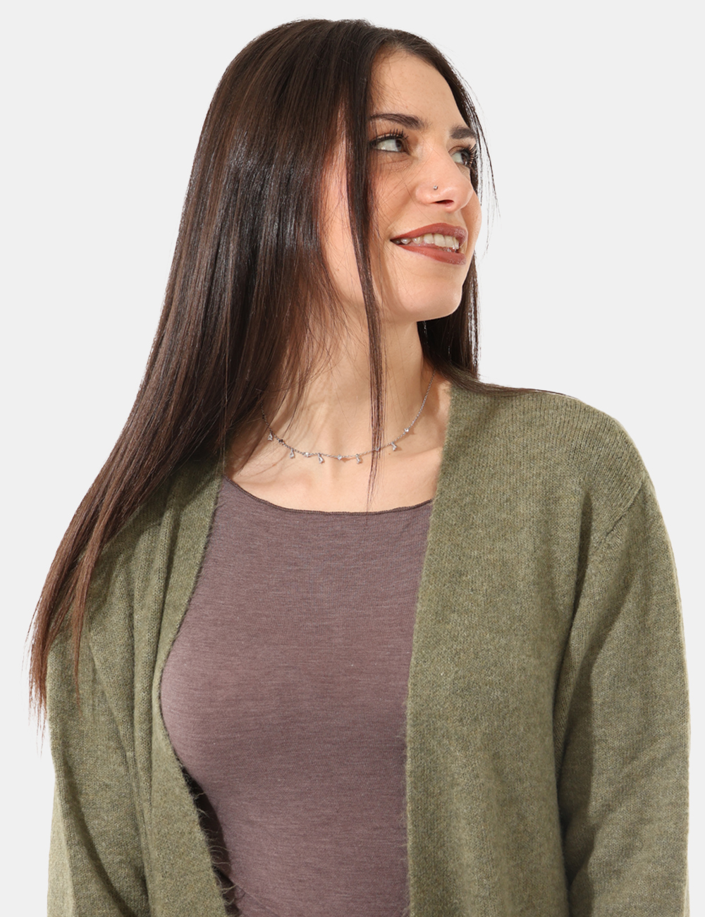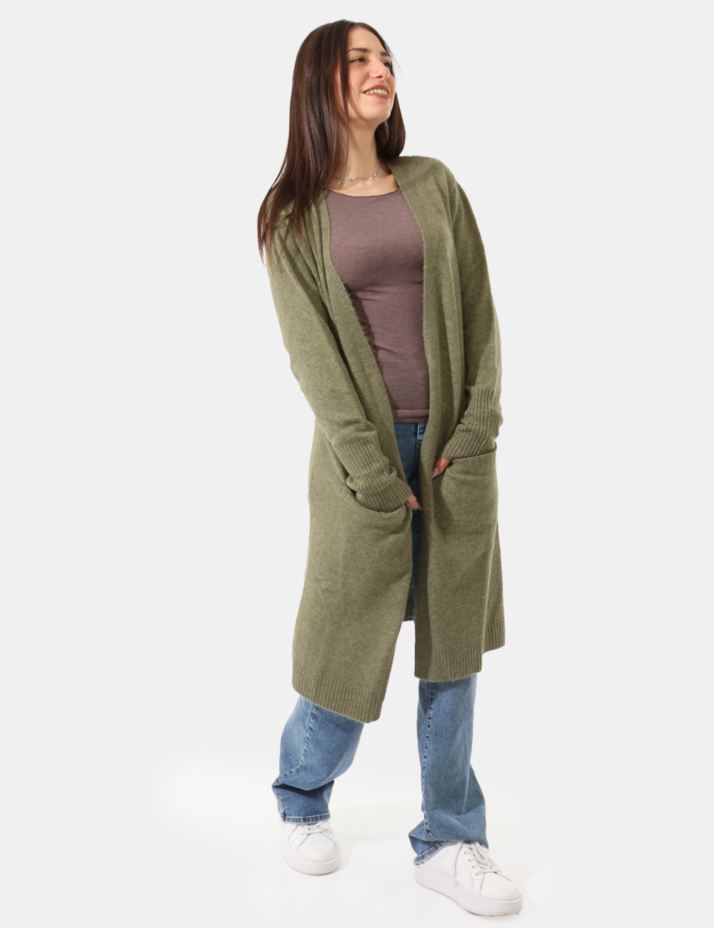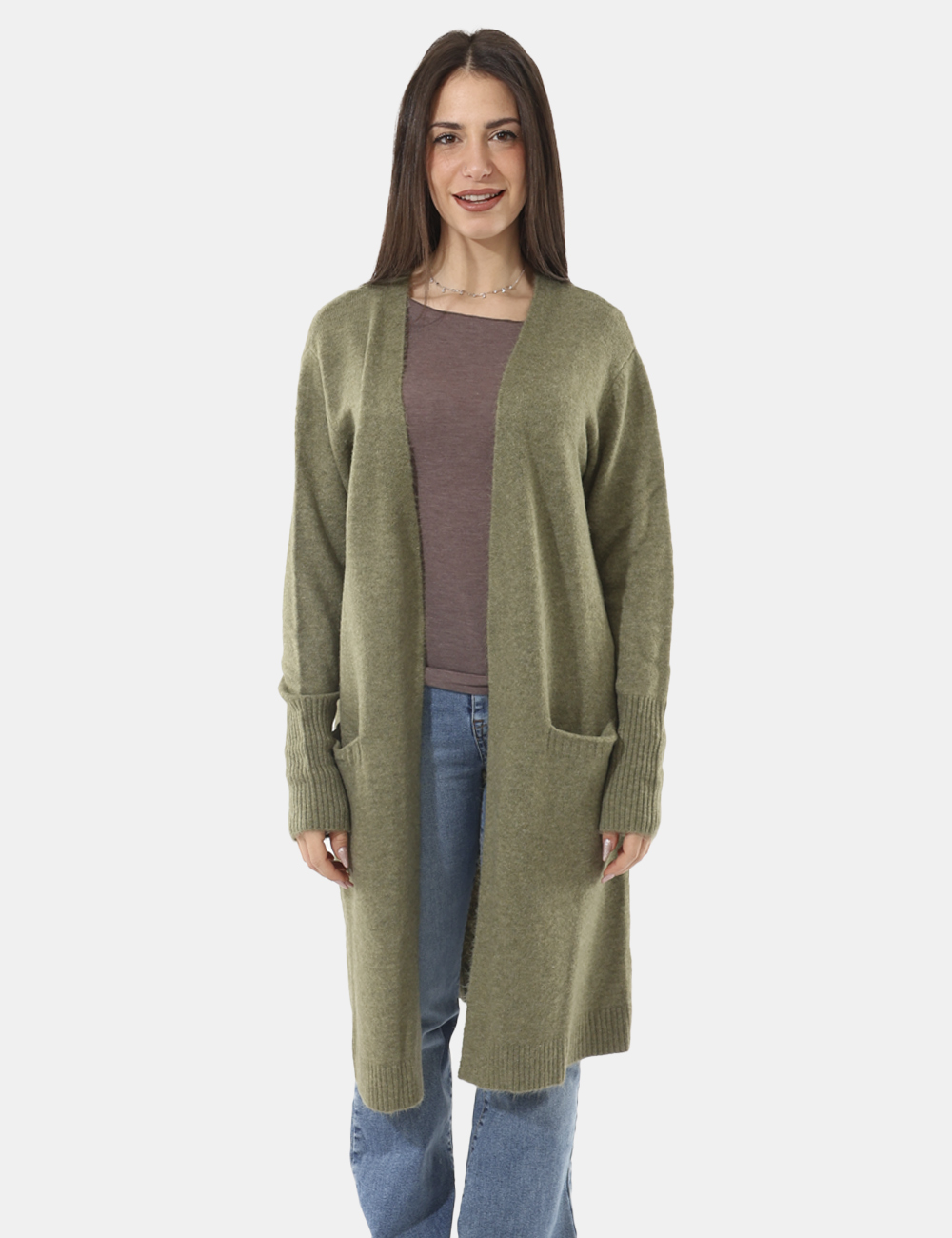 Maglione lungo, simil cardigan aperto sul fronte, in misto lana, con tasche a toppa e total verde militare. La vestibilità è morbida e regolare. Il maglione è adatto per occasioni casual e facilmente combinabile. Scalda i tuoi inverni con un tocco di stile.