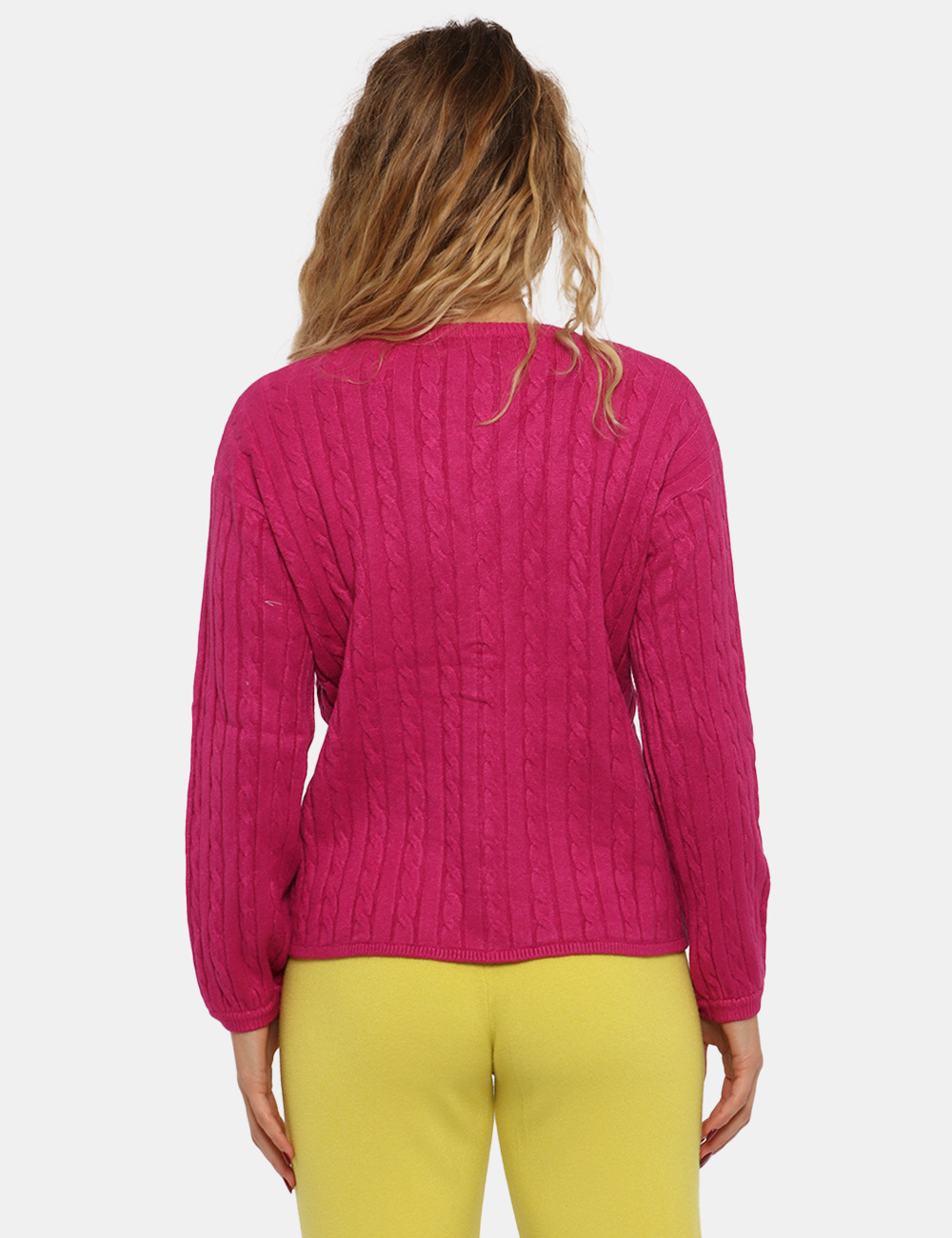 Maglione classico con scollo a V e trama intrecciata in total fucsia. La particolarità del capo sta nella coulisse lungo il fronte con laccio in tessuto pendente sul girovita. La vestibilità è morbida e regolare. Il maglione è adatto per occasioni casual e facilmente combinabile per outfit diurni/serali. Dai colore ai tuoi outfit.