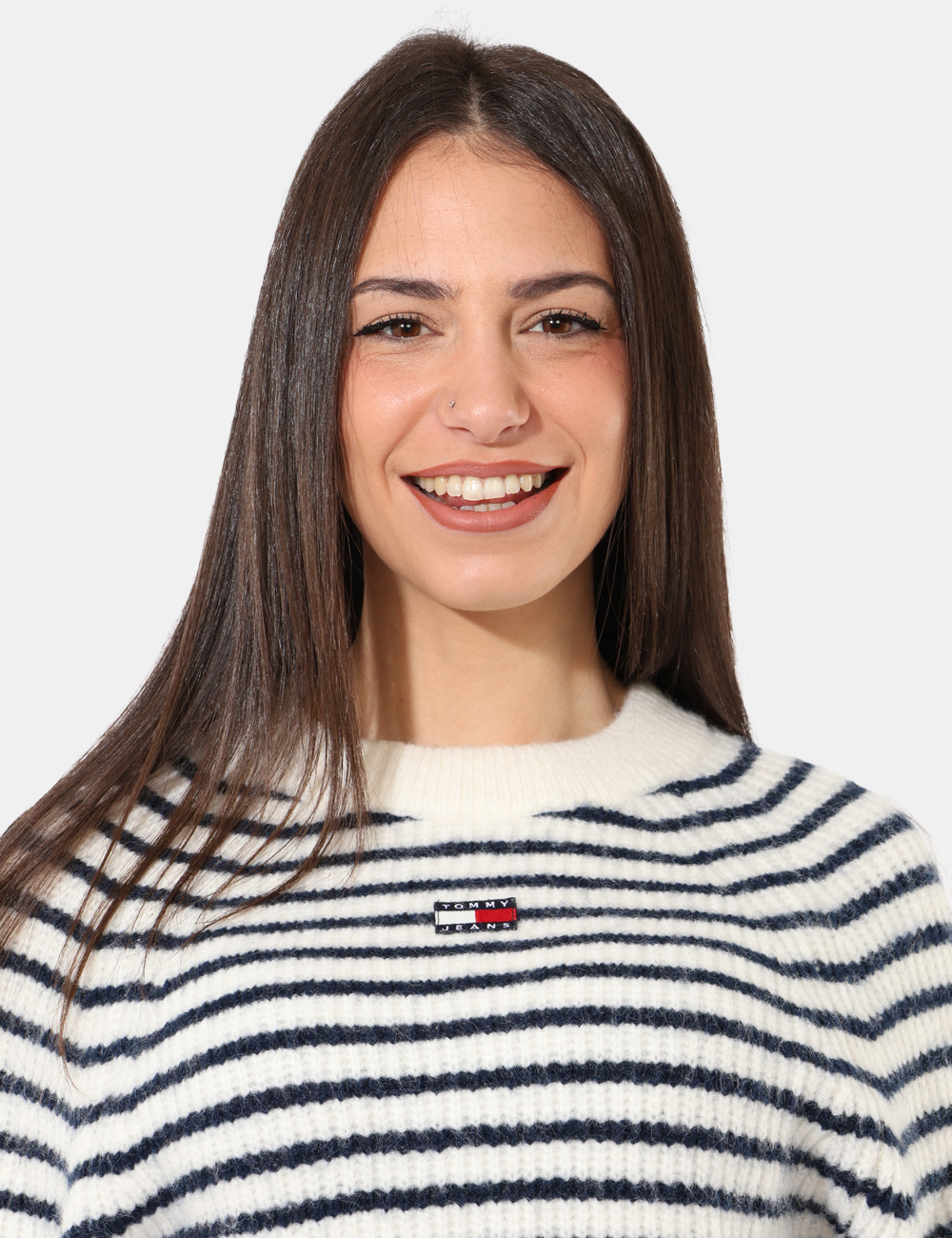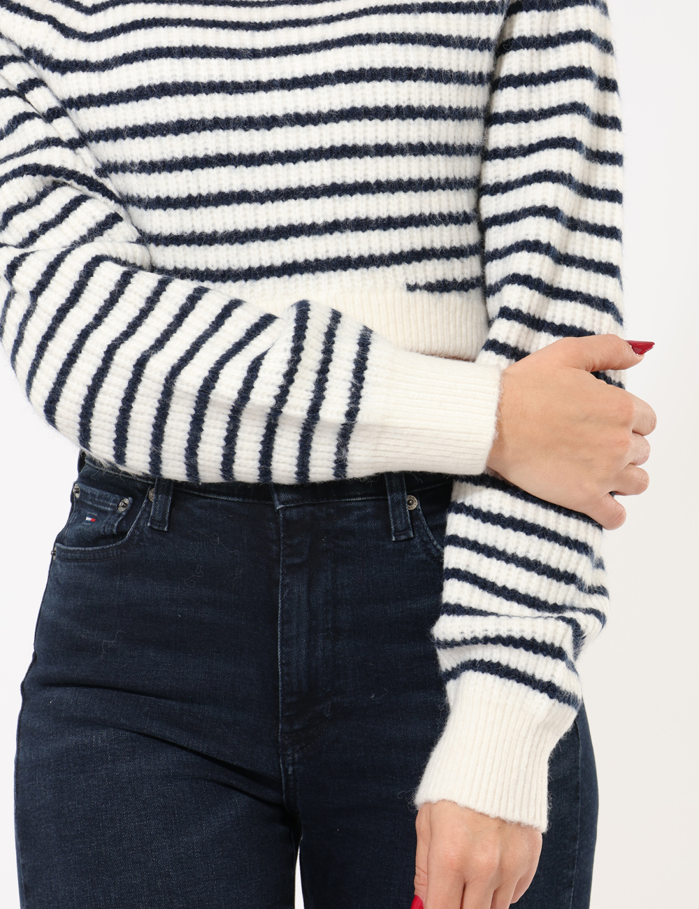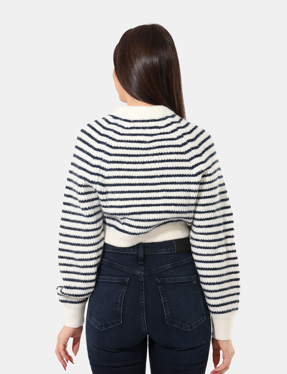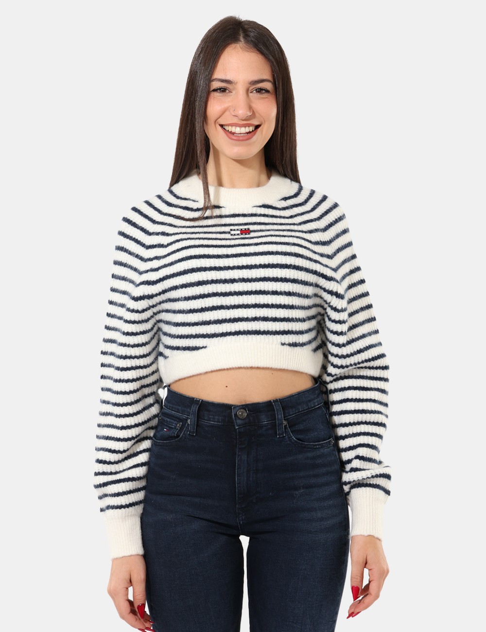 Maglione corto in misto lana in fantasia rigata bianca e blu. La vestibilità è morbida e regolare. Il maglione è adatto per occasioni casual e facilmente combinabile. Praticità e stile in un solo capo.