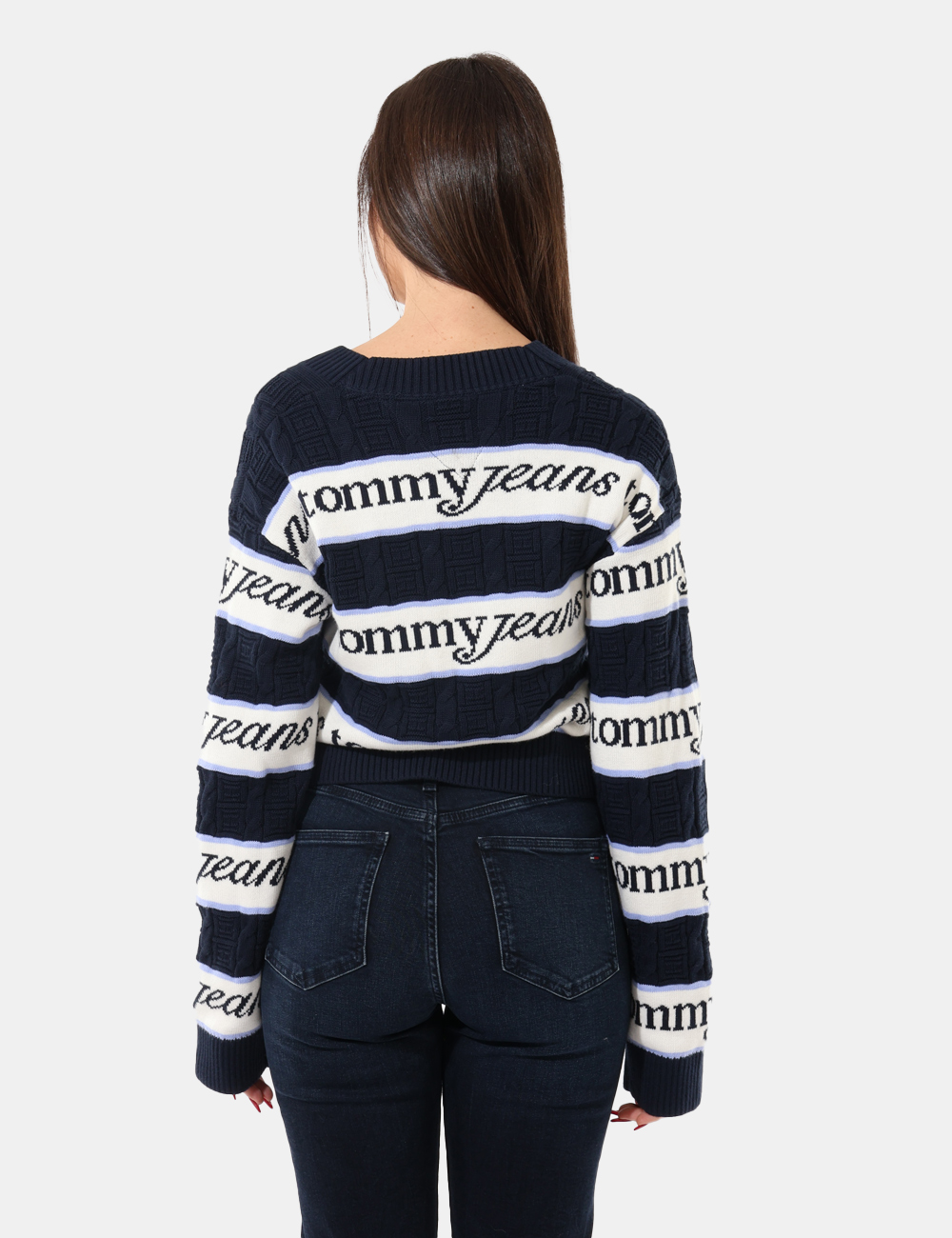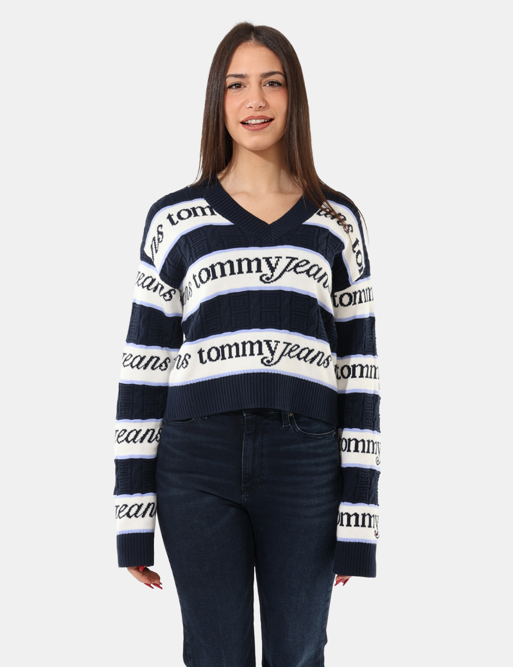 Maglione in cotone con scollo a V su fantasia bianca e blu. La vestibilità è morbida e regolare. Il maglione è adatto per occasioni casual e facilmente combinabile. Praticità e stile in un solo capo.