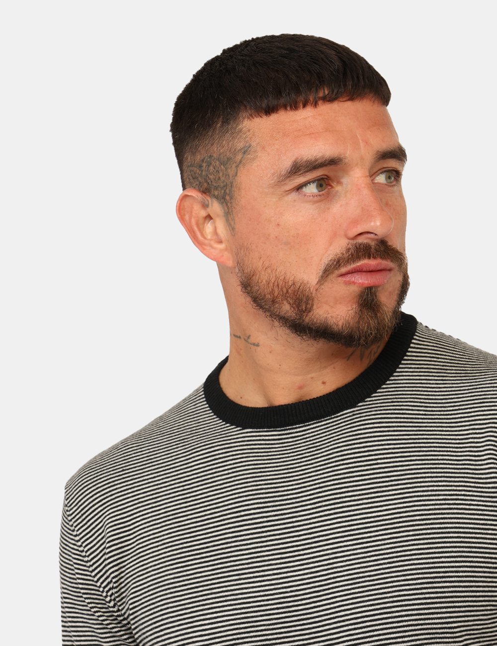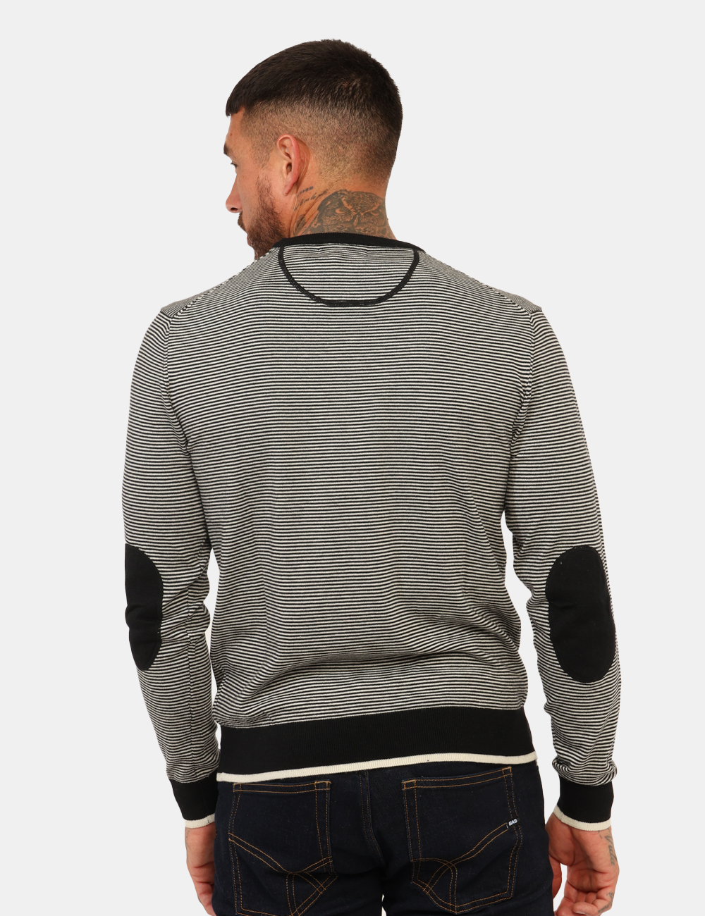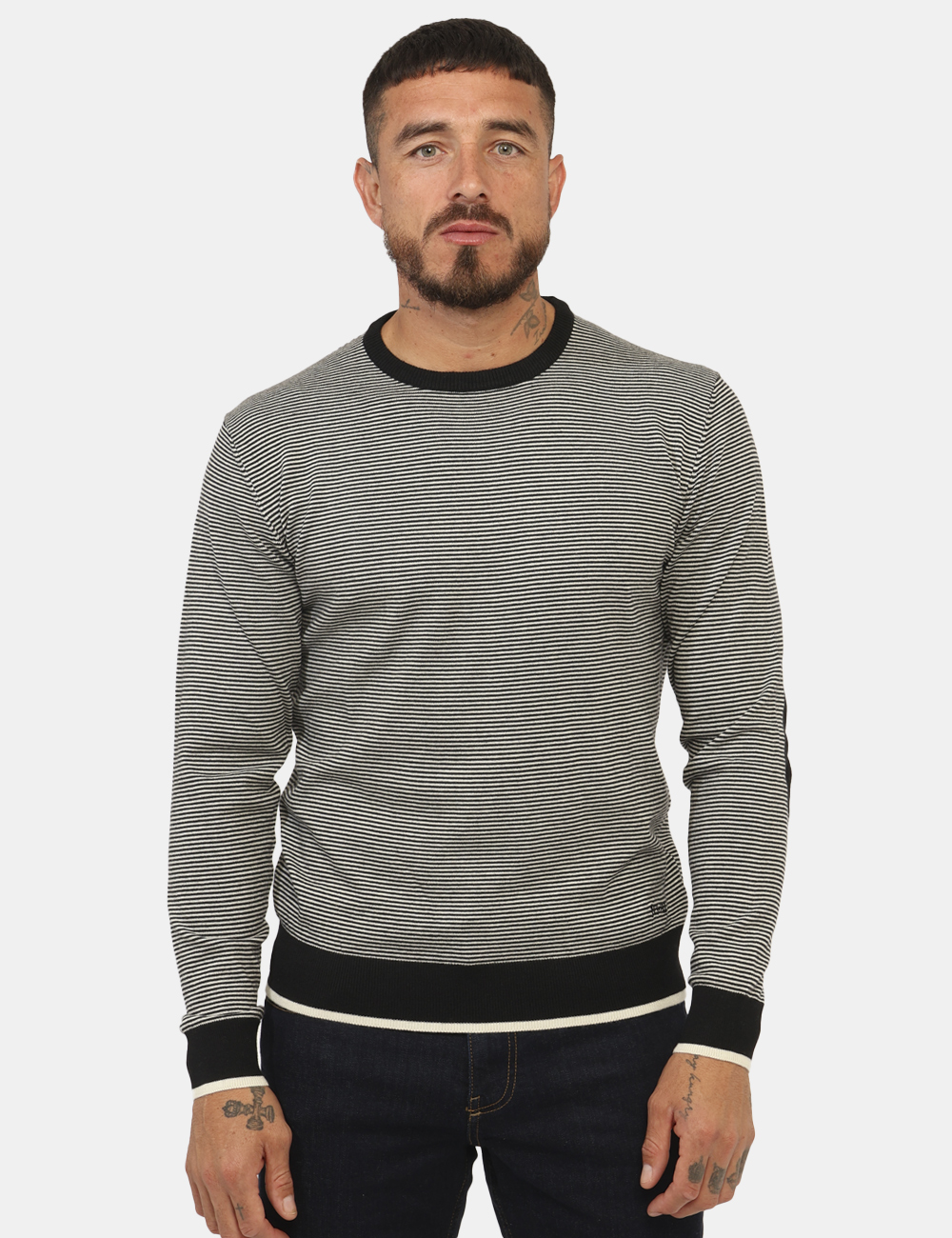 Maglione classico girocollo su fantasia rigata bianco e nero. La vestibilità del capo è morbida e regolare. Il maglione è adatto per occasioni casual e facilmente combinabile. Praticità e stile in un solo capo.