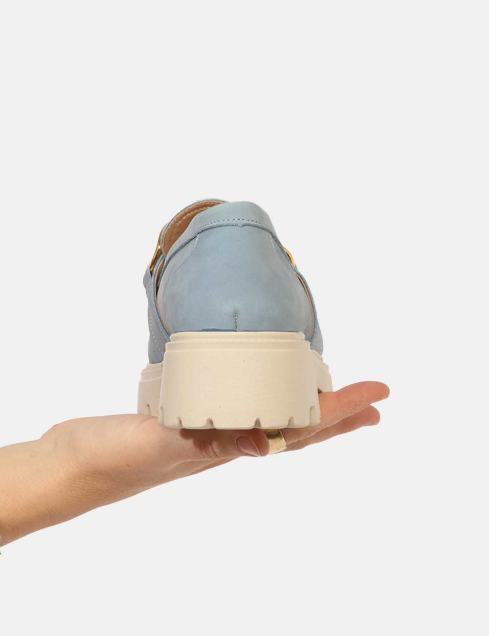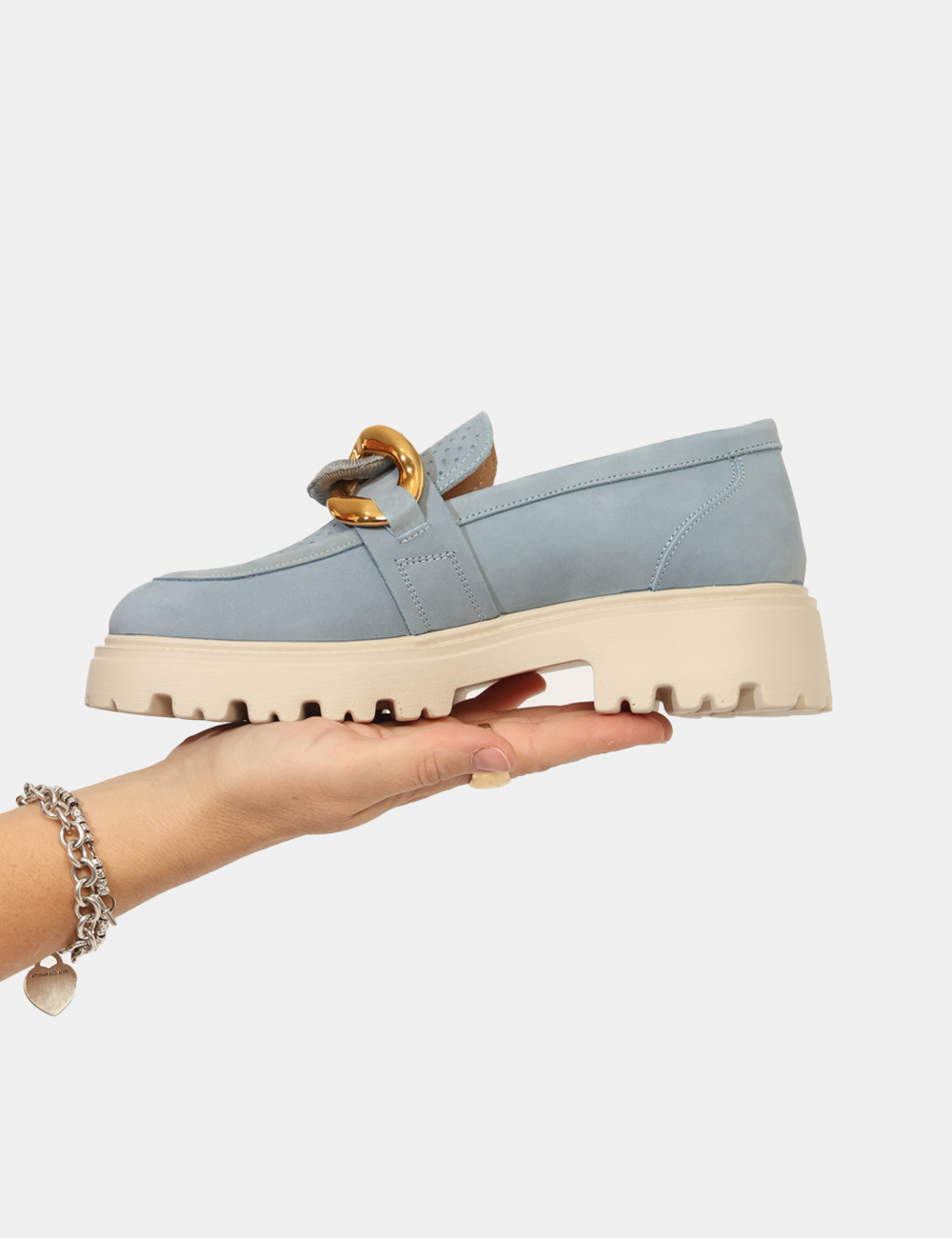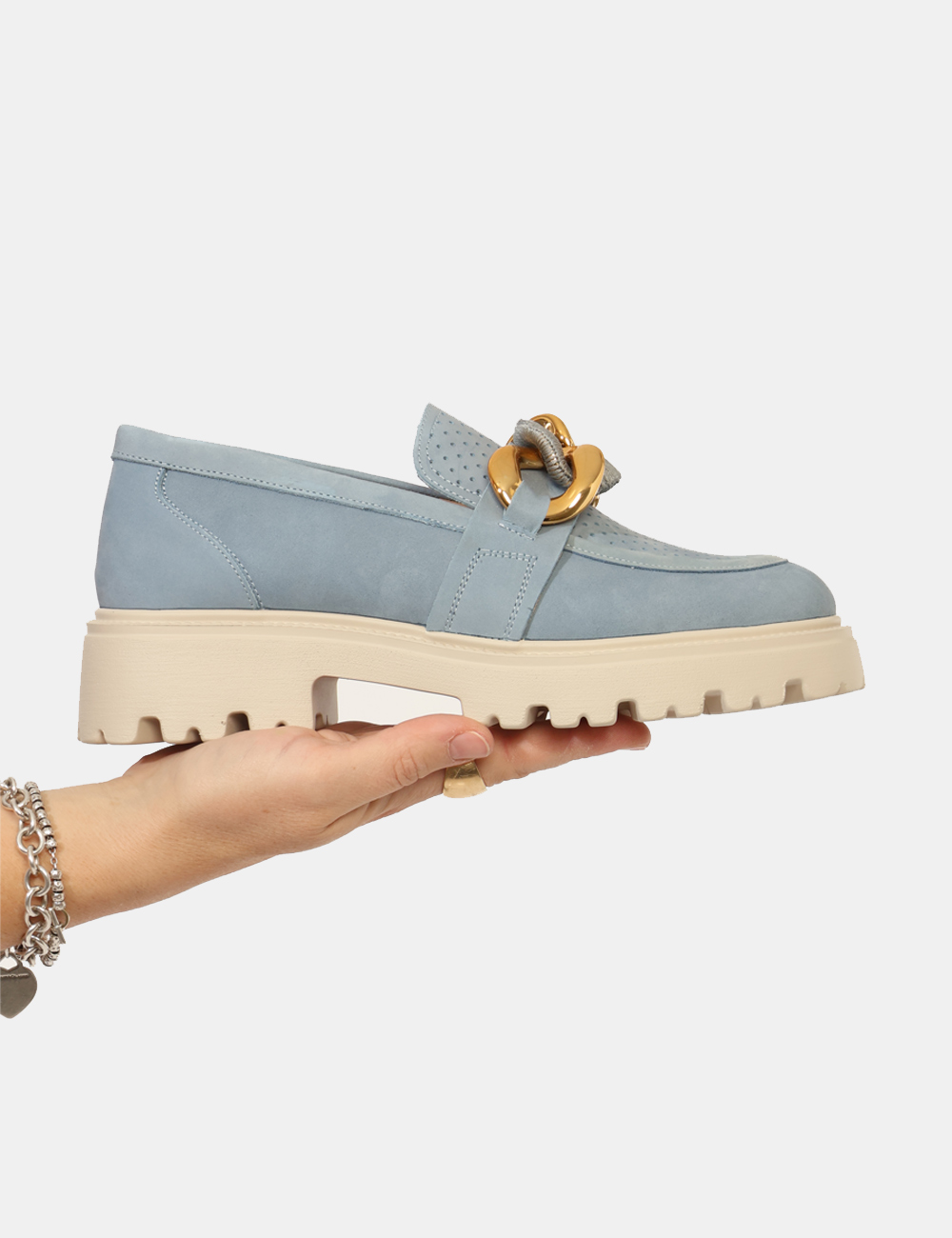 Originale mocassino in simil scamosciato, total azzurro pastello con tomaia parzialmente traforata. Presente fibia dorata che dona luce a questa calzatura. L’indossatura è morbida e confortevole, la suola sagomata garantisce stabilità. Indossa questi mocassini per spiccare al punto giusto.