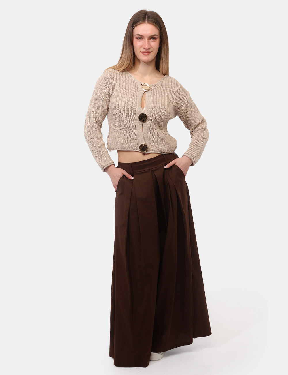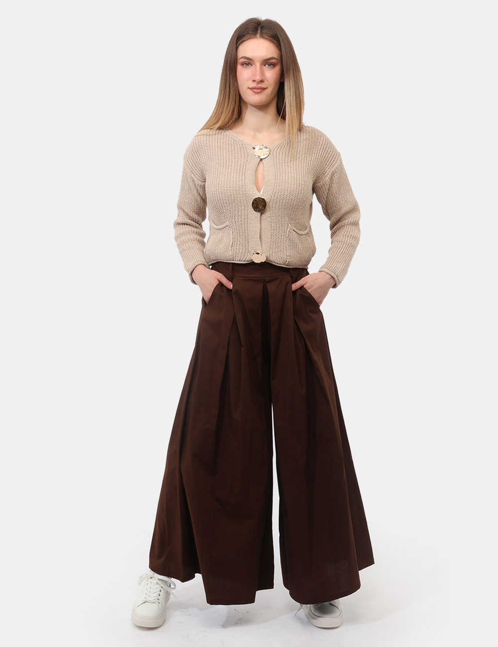 Questo pantalone da donna adatto alla stagione primavera estate si distingue per la sua linea molto ampia, pensata per offrire massimo comfort senza rinunciare a un’estetica curata. Le tasche e l’elastico in vita aggiungono funzionalità e praticità, rendendolo perfetto per un utilizzo quotidiano. Il colore marrone dona un tocco caldo e sofisticato, ideale per creare outfit armoniosi e facili da personalizzare.