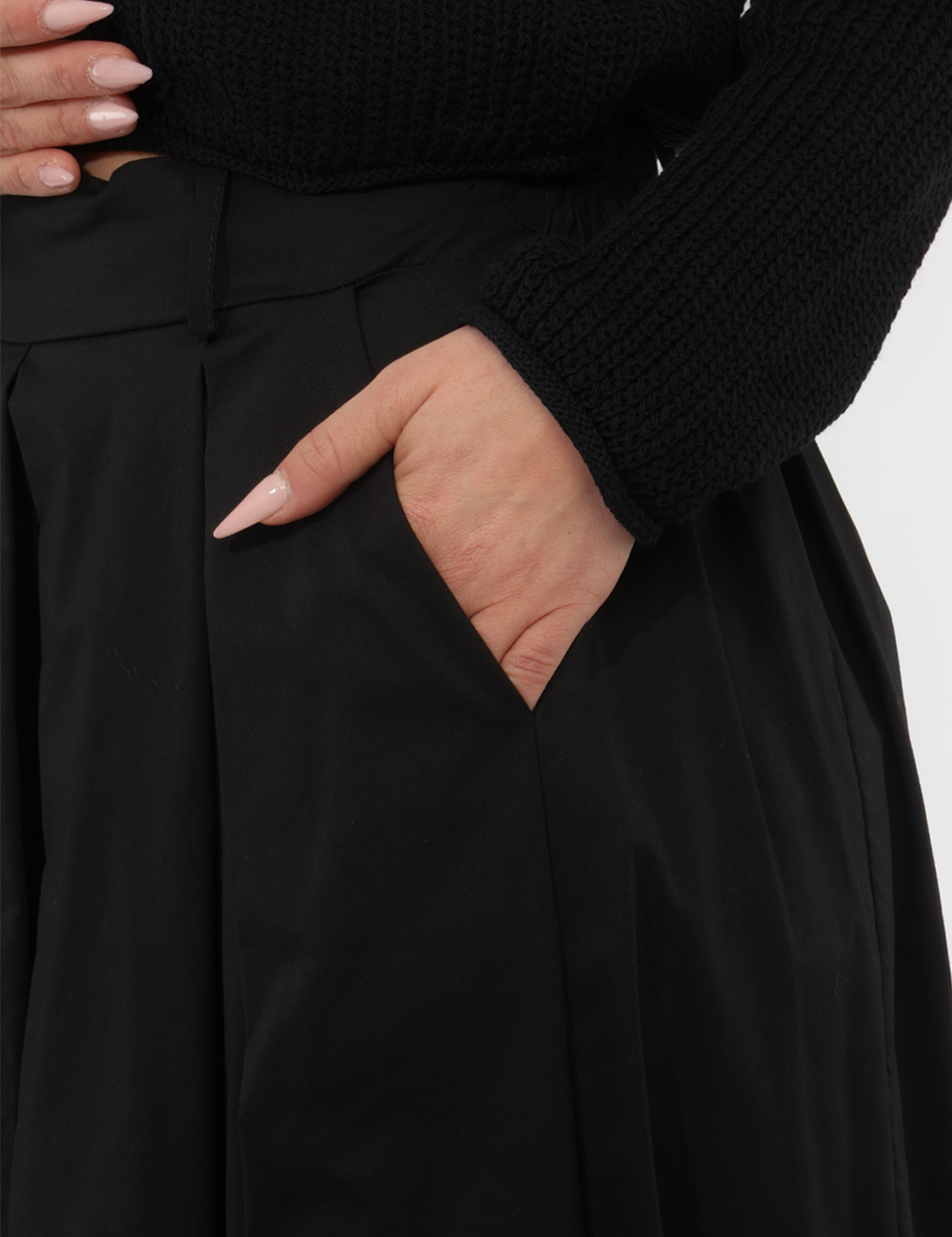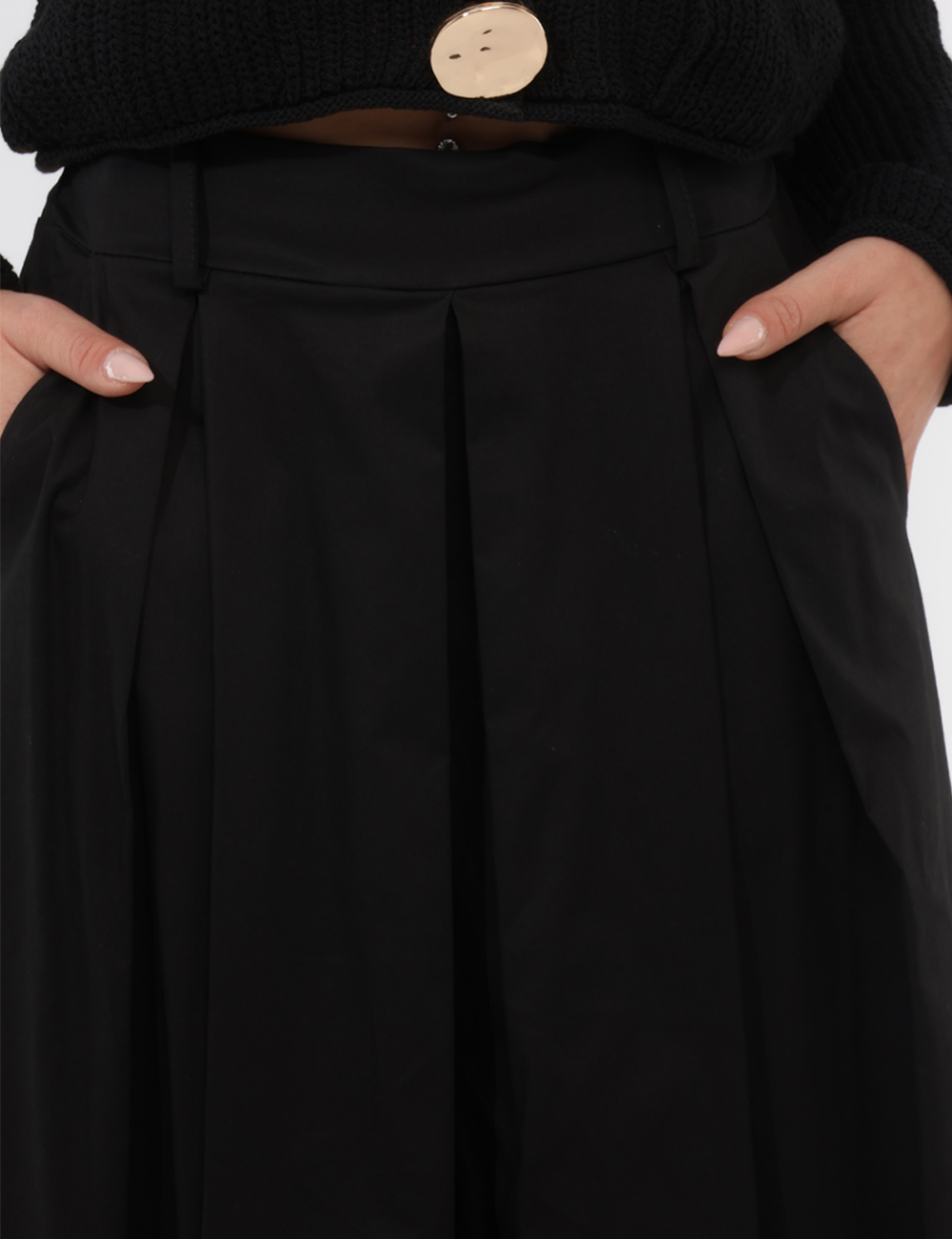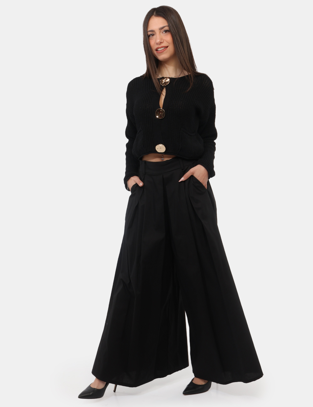 Il colore nero, essenziale e intramontabile, rende questo pantalone con molto ampio, con tasche ed elastico in vita un vero passe-partout del guardaroba.