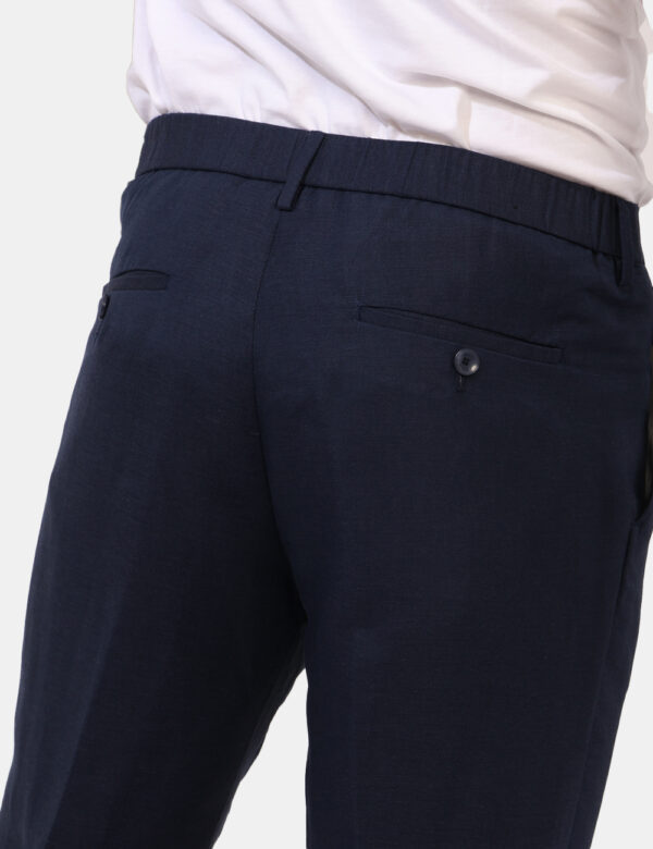 Pantalone classico in total blu navy con tasche a taglio trasversale sul fronte e tasche a taglio con bottone sul retro. La vestibilità è morbida e pratica grazie a gancino più zip. Il pantalone è adatto per occasioni casual/raffinate e ideale nel completo blu con gilet e giacca. Indossalo per essere impeccabile.