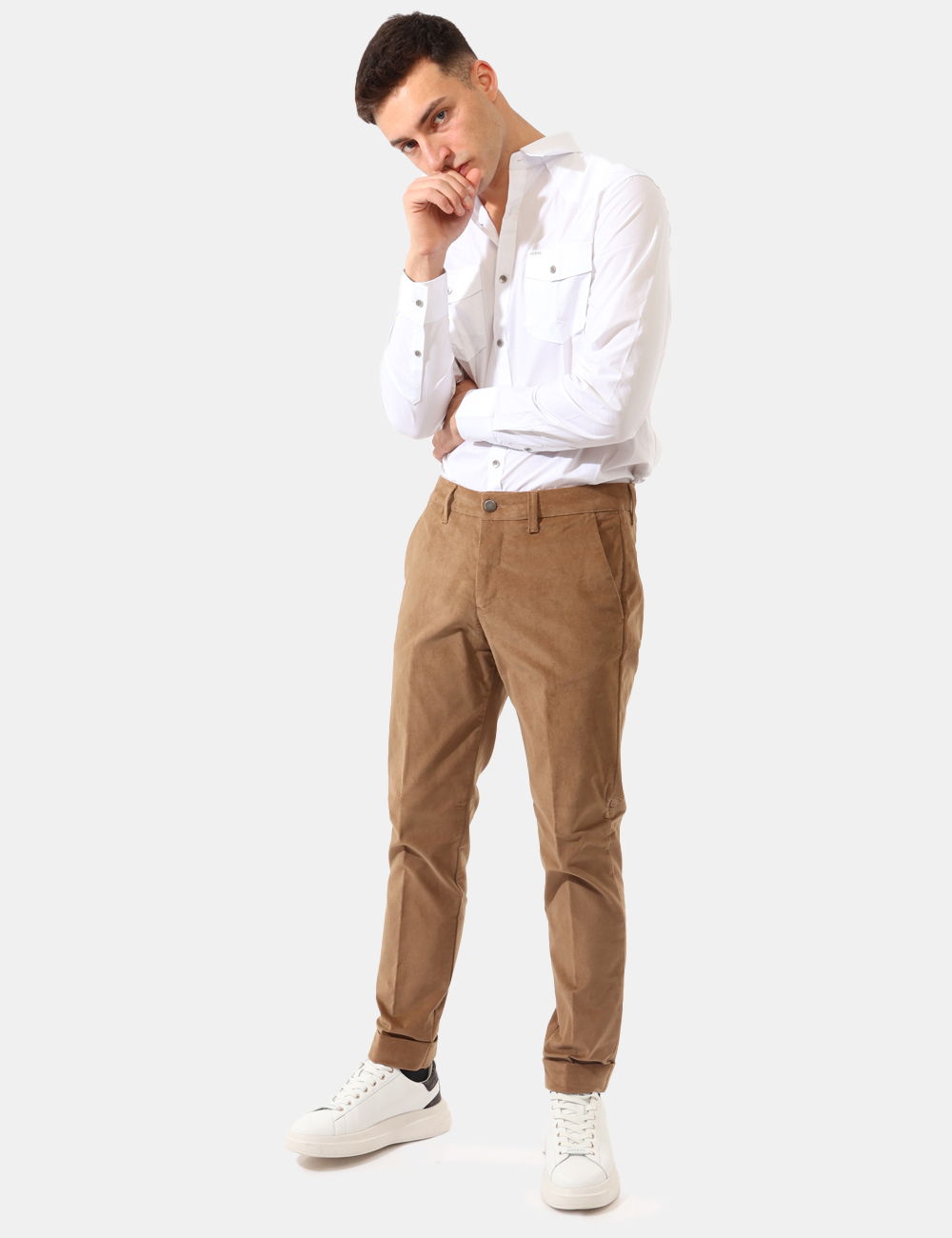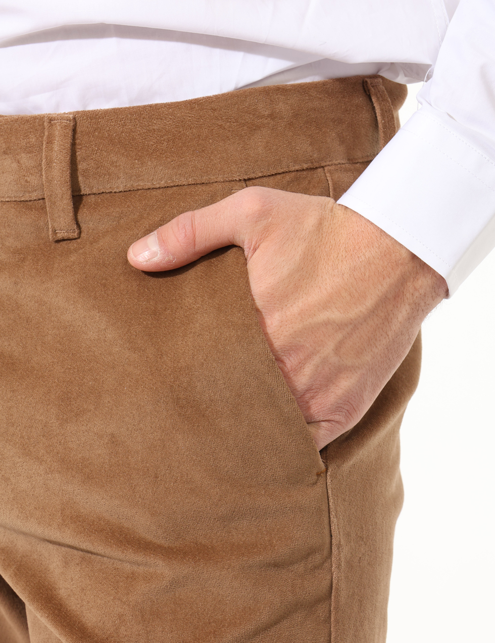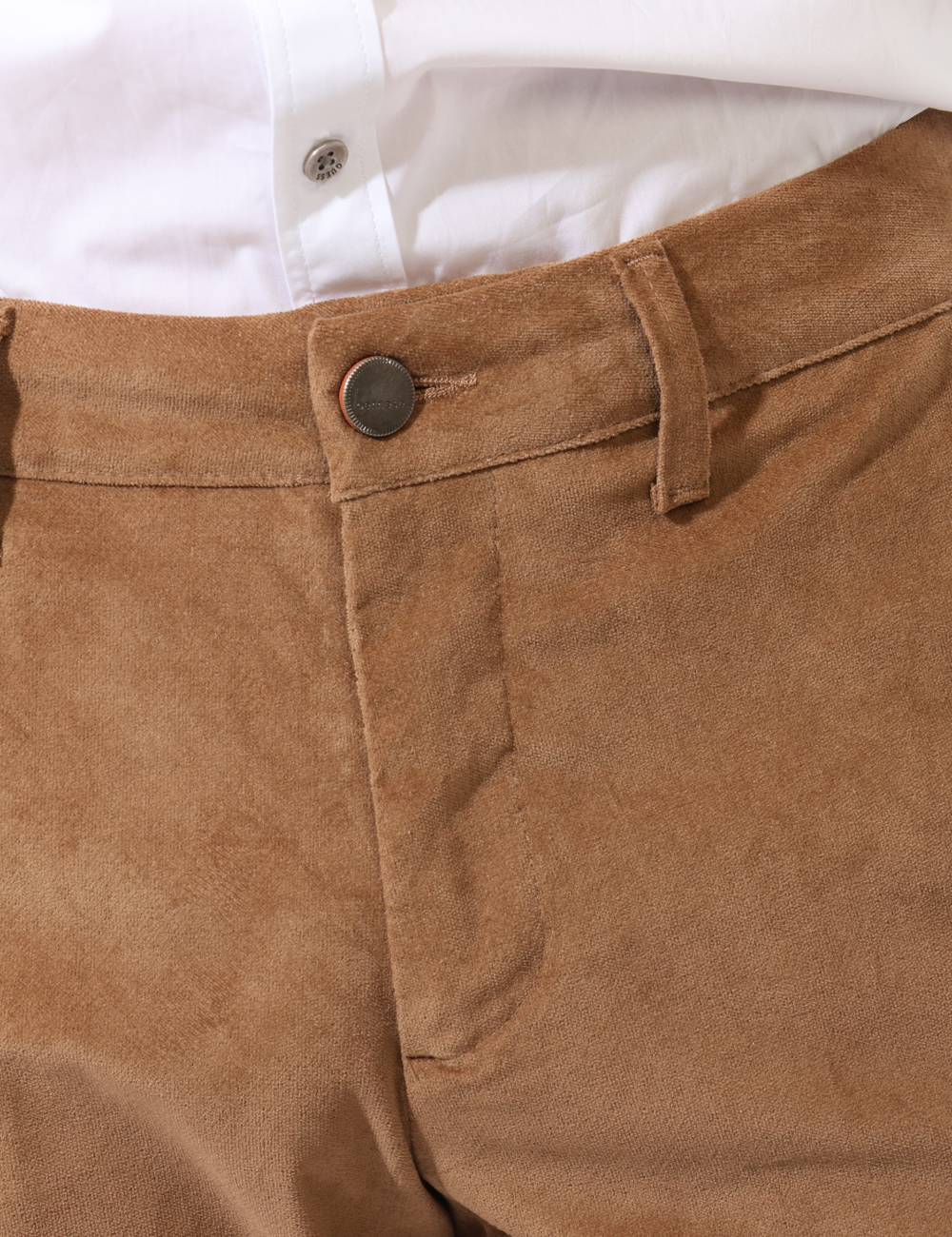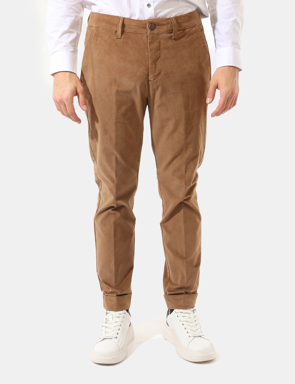 Pantaloni eleganti in simil scamosciato in total marrone cammello. Presenti tasche a taglio trasversale più tasche fake sul retro. La vestibilità è morbida e pratica grazie a bottone più zip. I pantaloni sono adatti per occasioni casual e facilmente combinabili. Indossali per essere impeccabile.