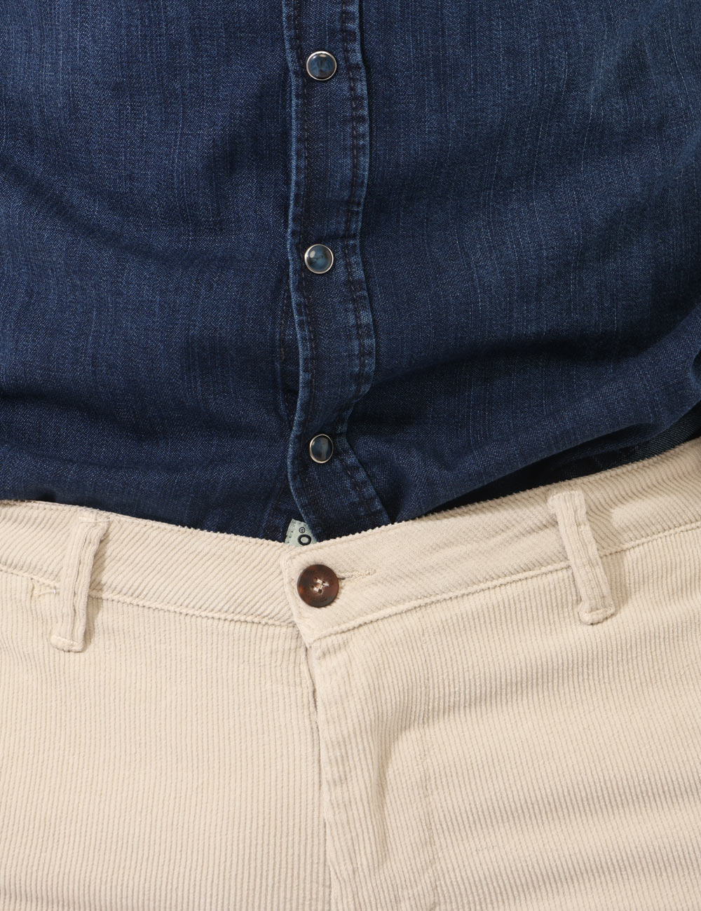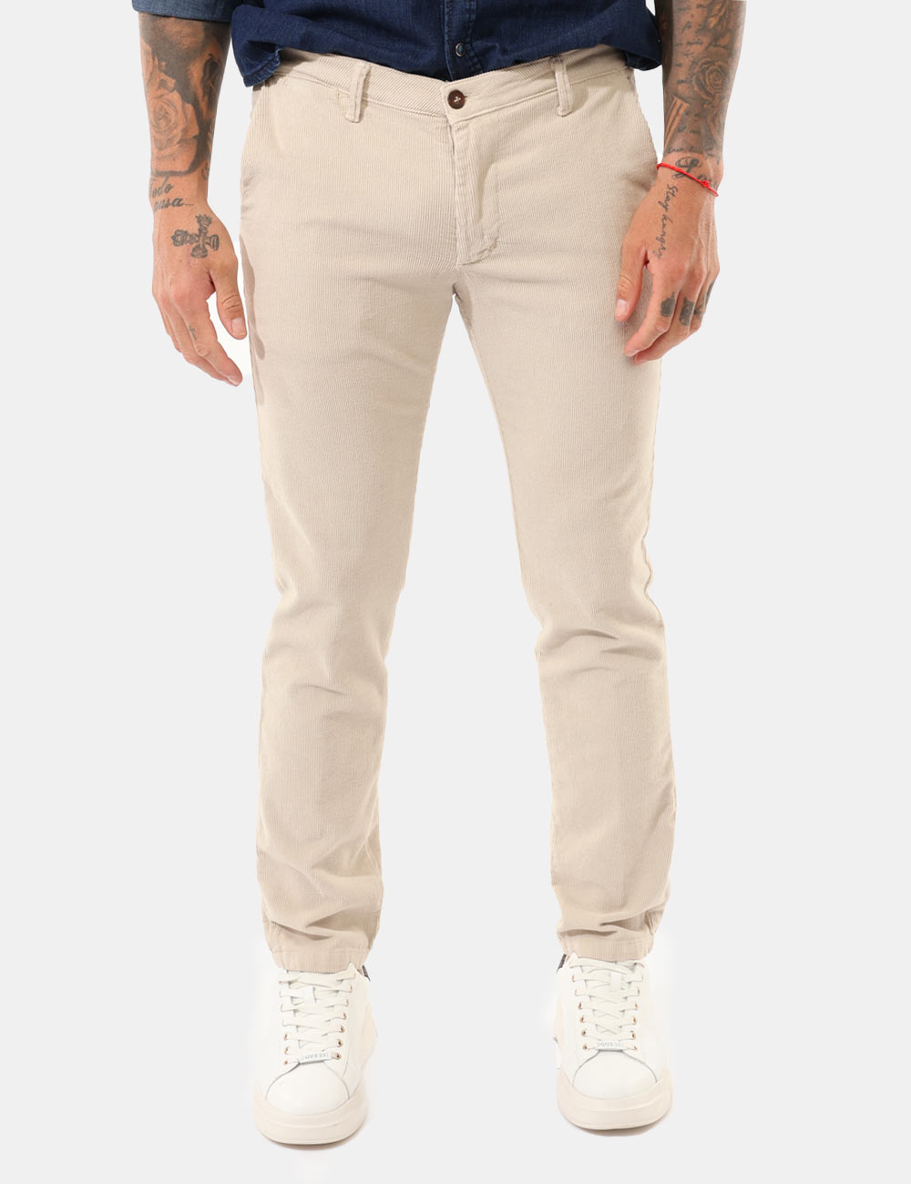 Pantaloni in simil velluto, total beige, con tasche a taglio trasversale e tasche a fessura con bottone ad asola. La vestibilità è morbida e pratica grazie a bottone più zip. I pantaloni sono adatti per occasioni casual e facilmente combinabili. Indossali una volta e scopri di non poterne più fare a meno.