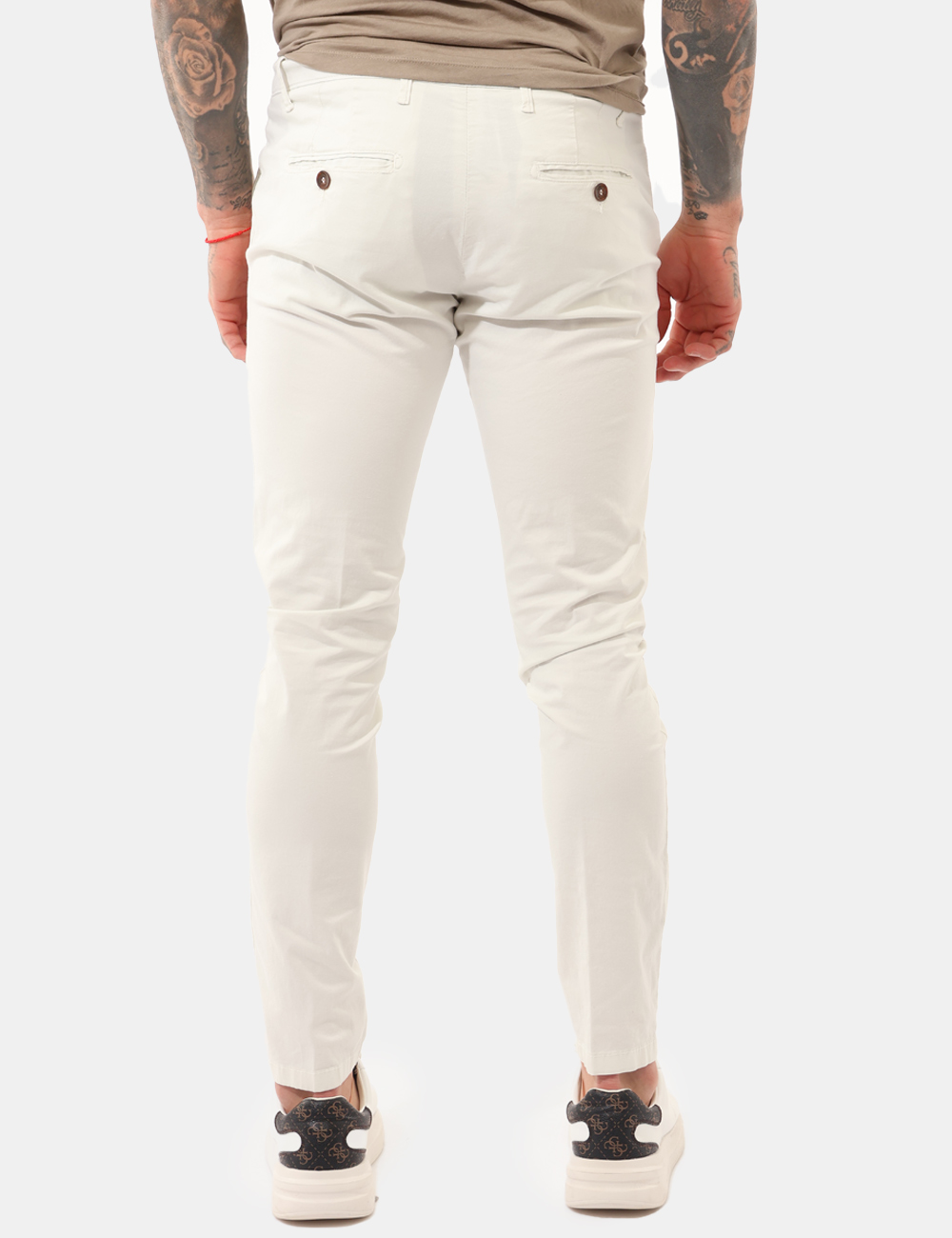 Questi pantaloni da uomo adatti alla stagione primavera estate sono realizzati in 98% cotone e 2% elastane, una composizione che assicura traspirabilità, morbidezza e una leggera elasticità per garantire libertà di movimento durante tutta la giornata. Il design è definito da tasche a taglio sul davanti e tasche a fessura sul retro, con chiusura tramite bottone e zip, dettagli funzionali che completano un’estetica pulita e moderna. La vestibilità è regolare e valorizza la figura senza risultare eccessivamente aderente. Il modello è alto 187 cm e indossa la taglia 48.